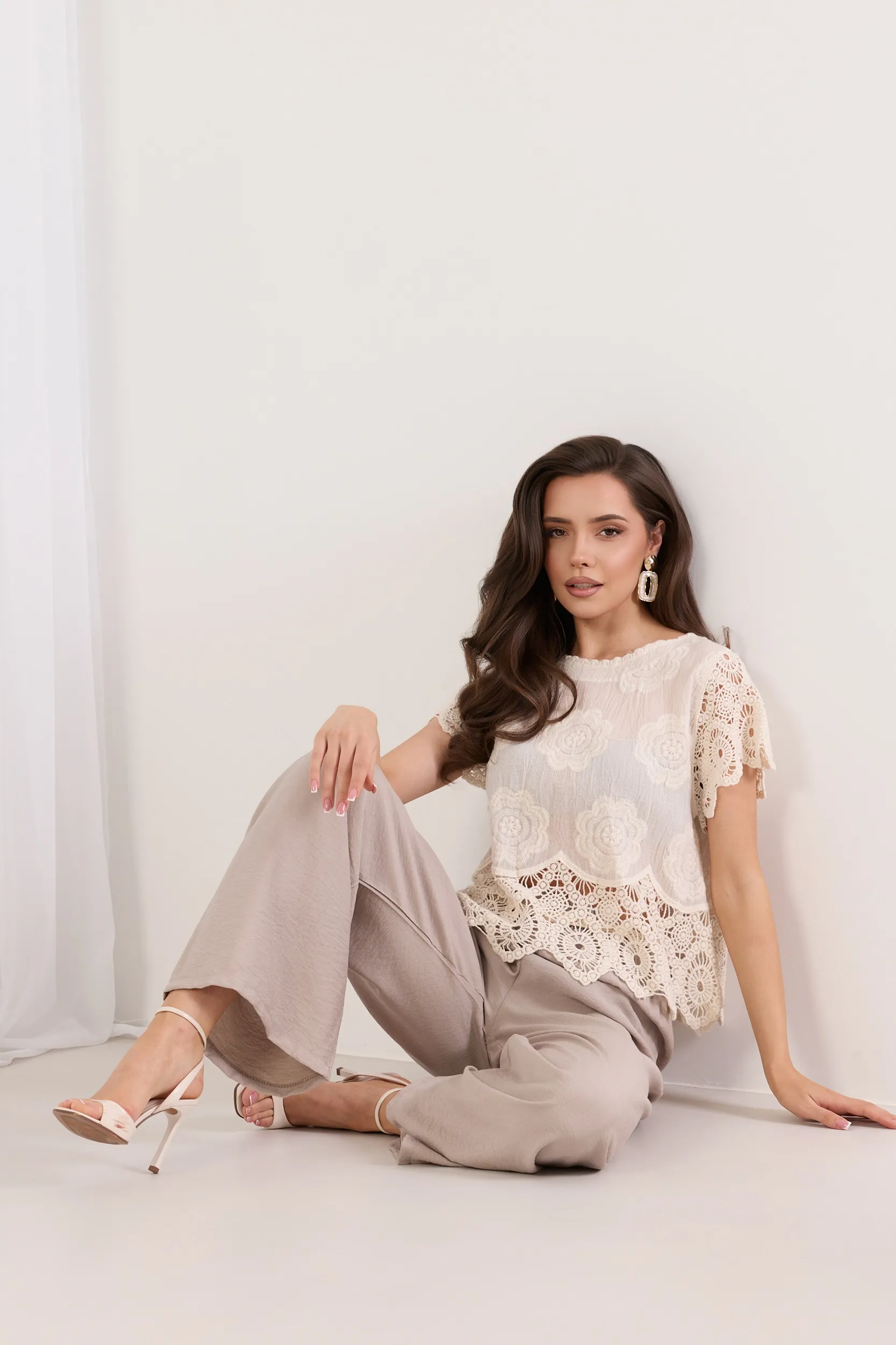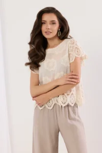 Okrągły dekolt wykończony subtelną lamówką podkreśla linię szyi, natomiast krótkie rękawy o dekoracyjnej strukturze dodają lekkości i kobiecego uroku. Dodatkowo ażurowe wstawki sprawiają, że model prezentuje się niezwykle delikatnie i przewiewnie.