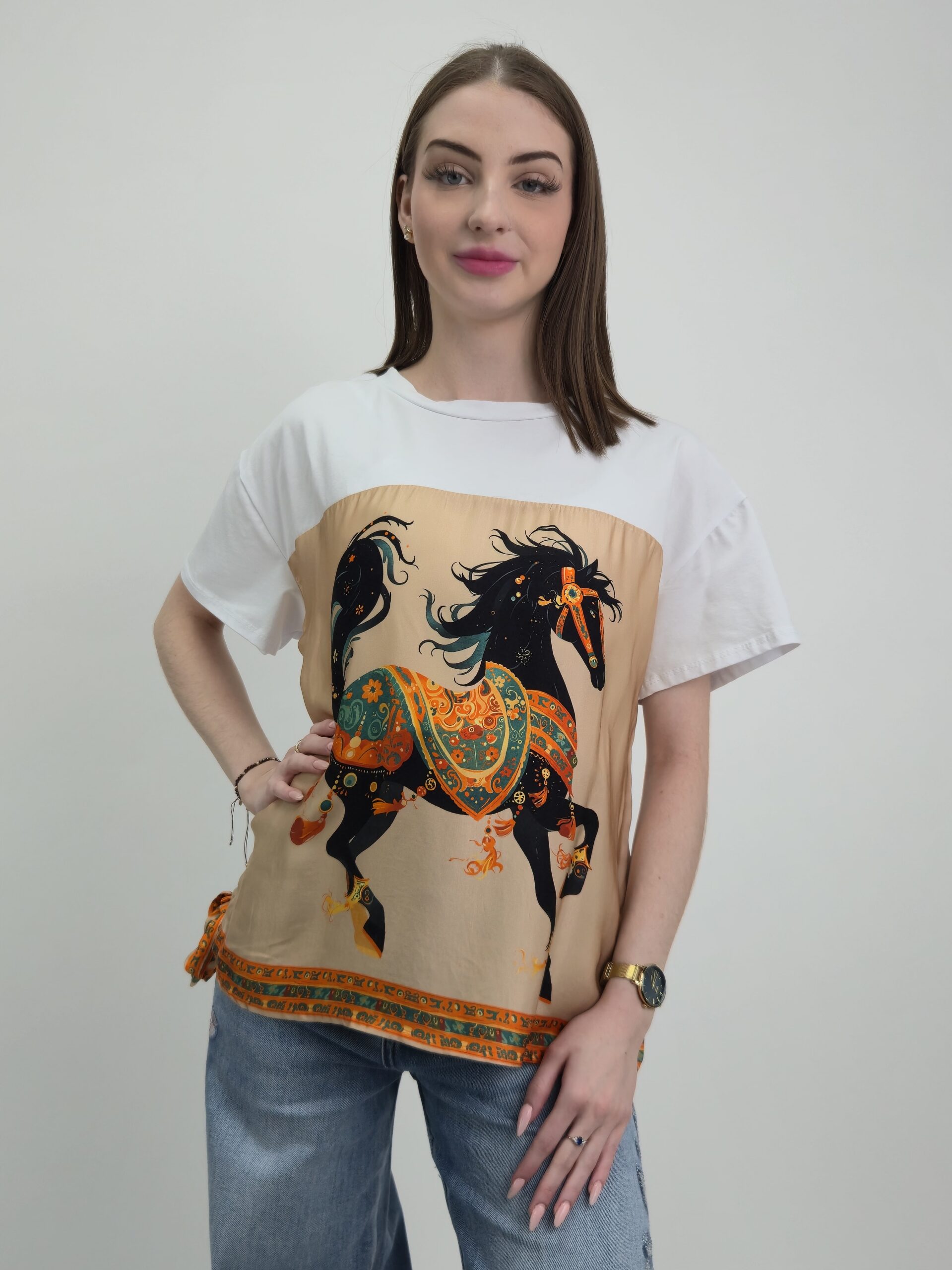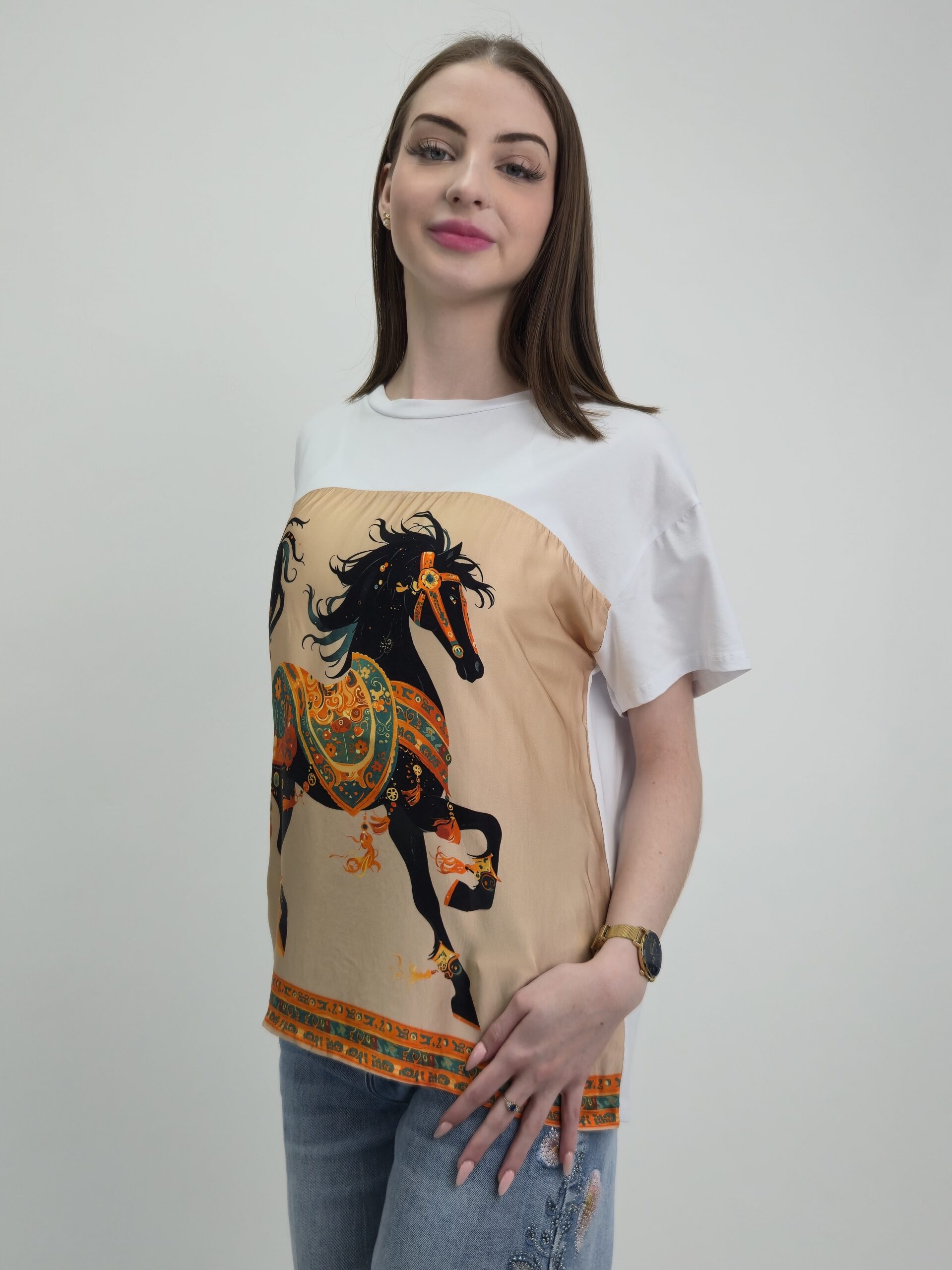 Wyjątkowa bluzka łącząca komfort naturalnej bawełny z elegancją jedwabnego wykończenia. Model wyróżnia się efektownym printem z motywem konia inspirowanym luksusową estetyką, który nadaje stylizacji oryginalnego i wyrafinowanego charakteru.