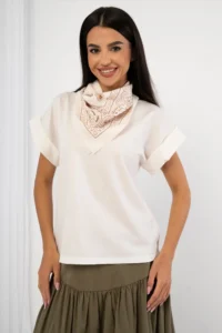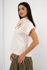 Przede wszystkim bluzka łączy wygodę z eleganckim stylem. Dodatkowo posiada unikalny detal w postaci apaszki. Co więcej, uniwersalny fason sprawia, że łatwo dopasujesz ją do wielu stylizacji.