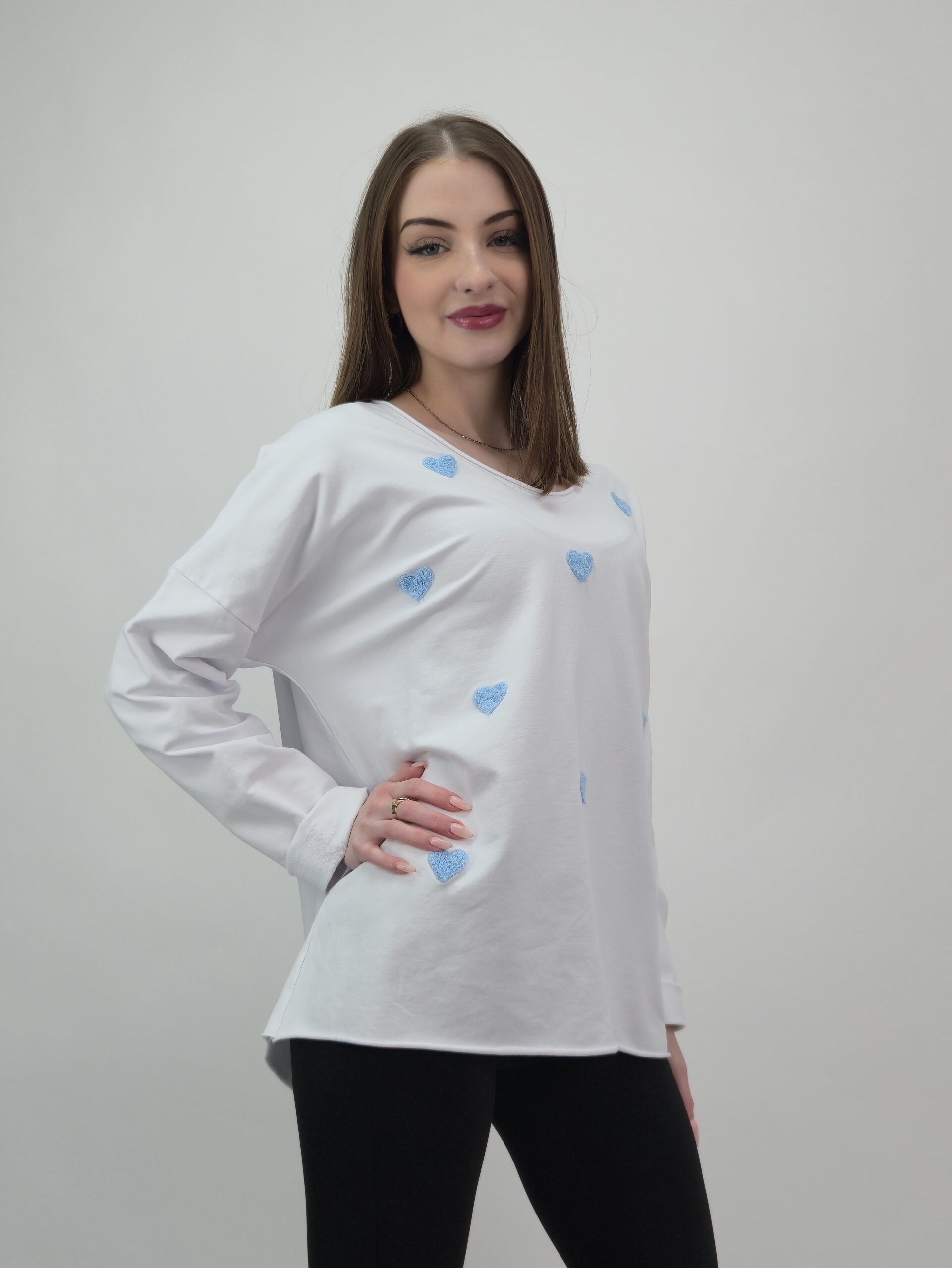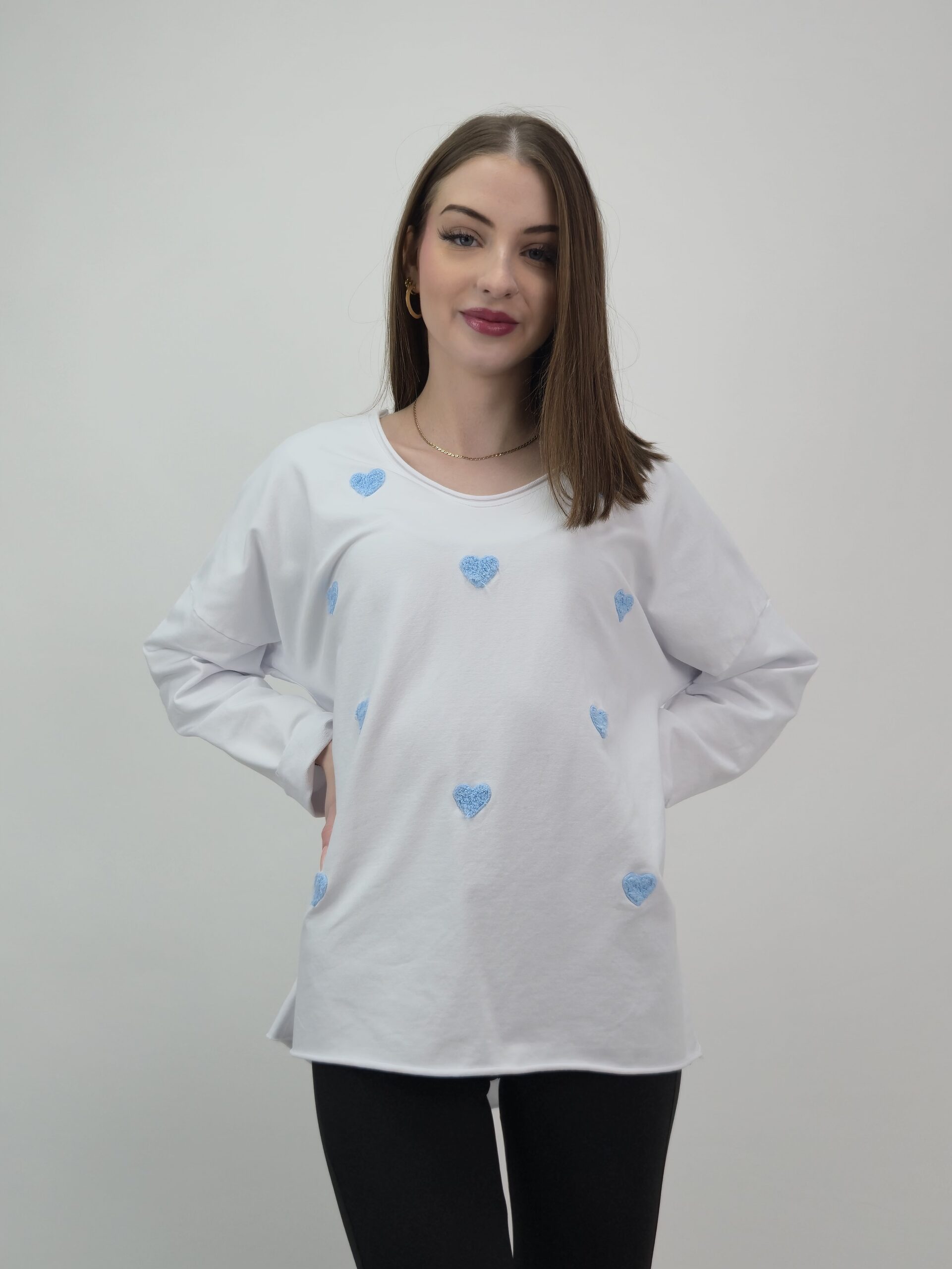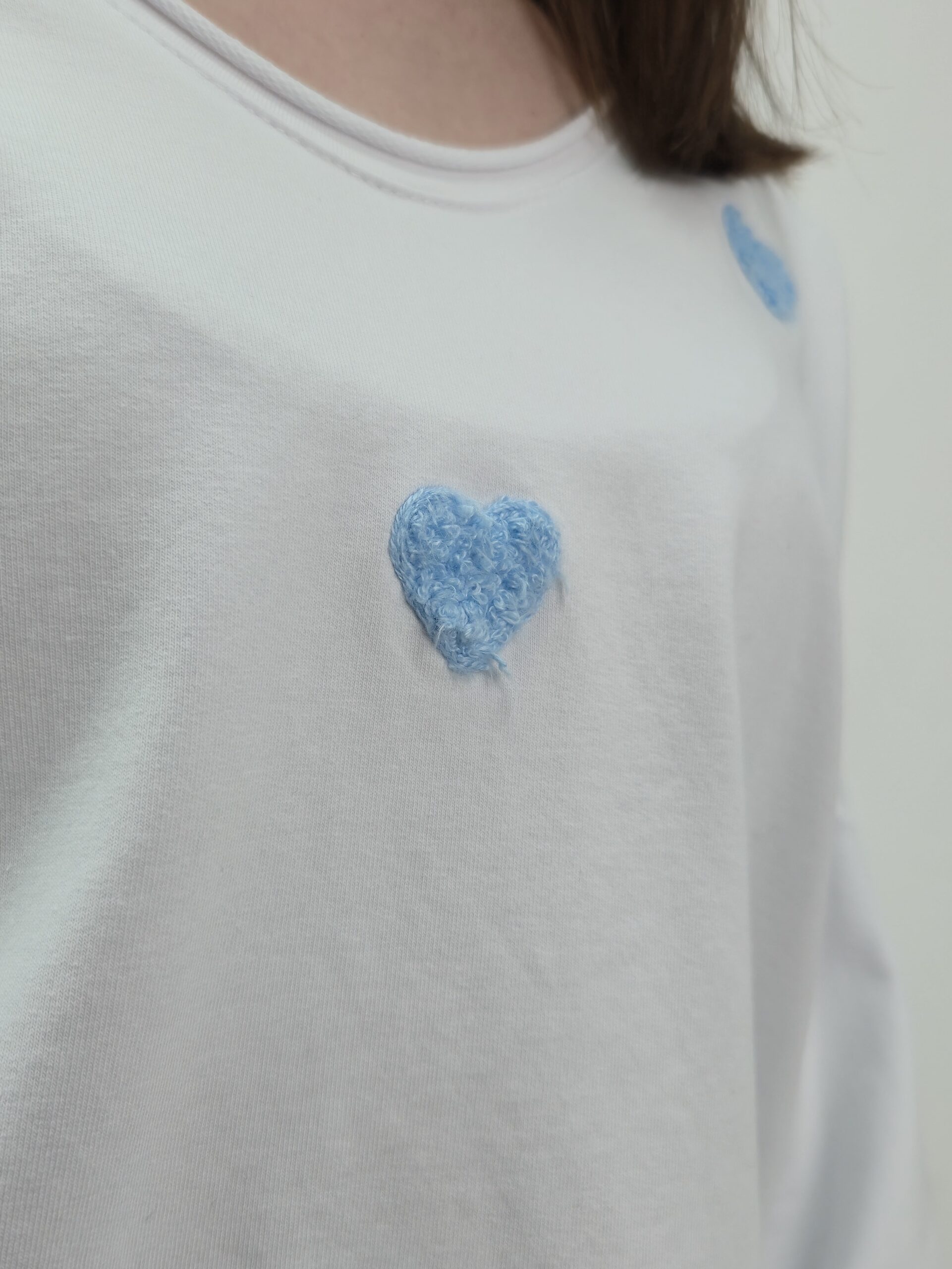 Efektowne Serduszka 3D: Przód bluzy zdobią wypukłe niebieskie serca o strukturze 3D, które nadają całości trójwymiarowego, uroczego charakteru.