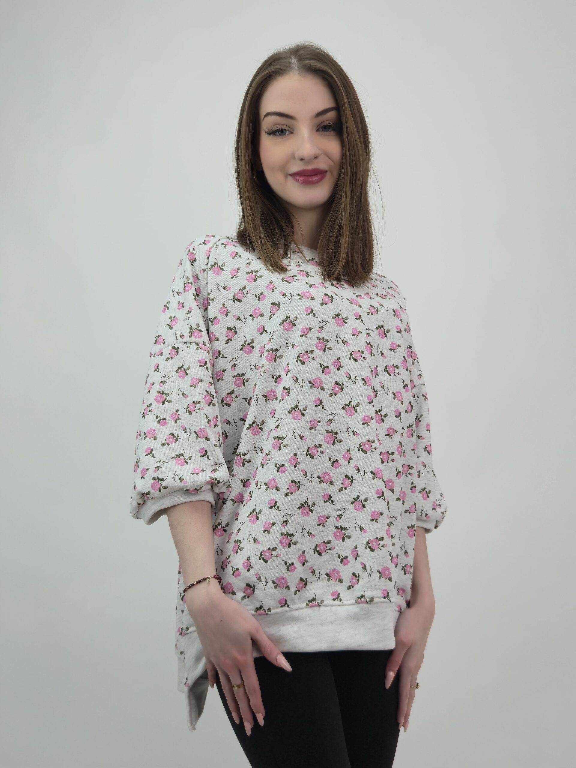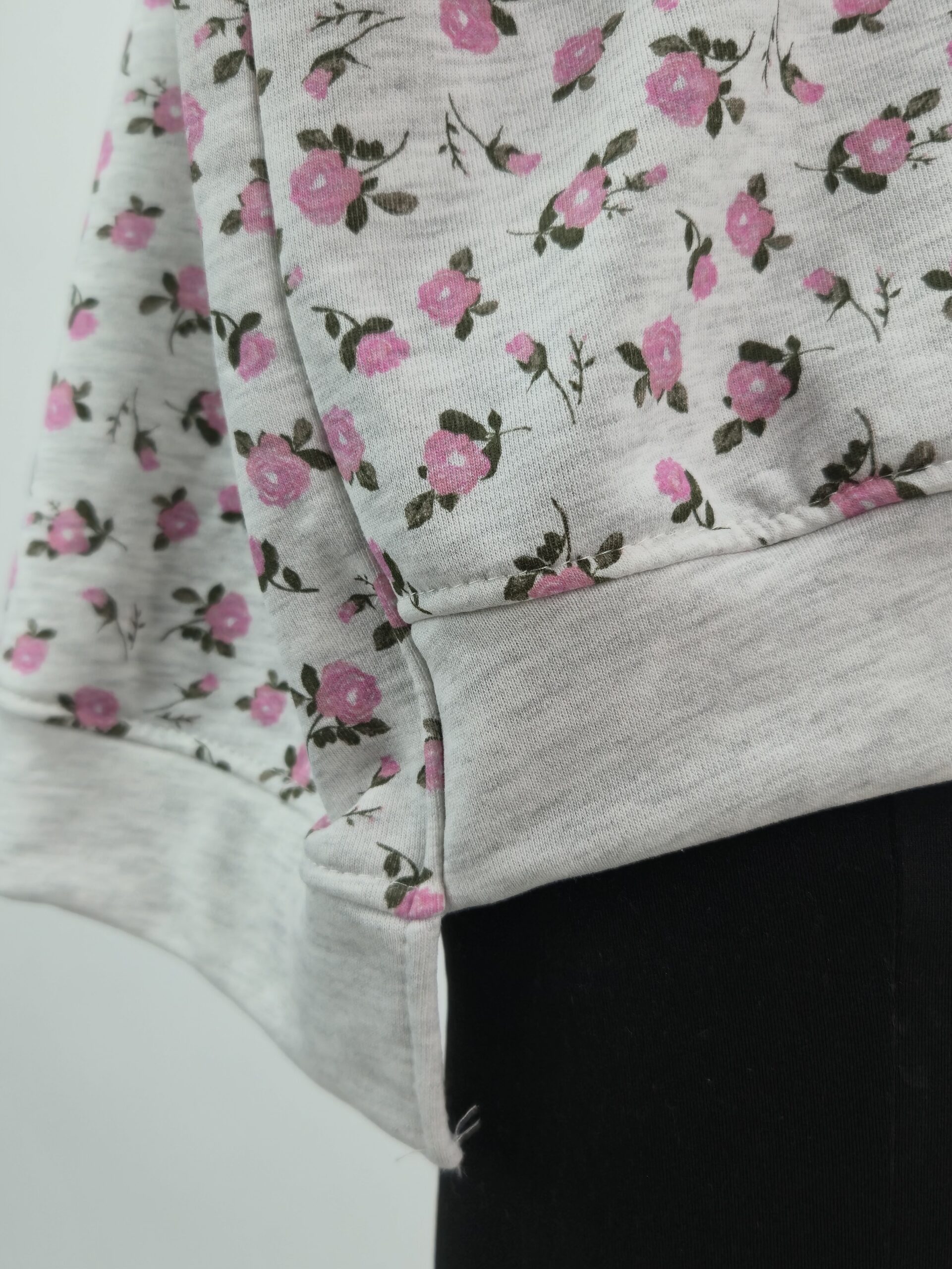 Szlachetny szary melanż: Wielotonowy odcień szarości stanowi doskonałe tło dla różanego wzoru, dodając bluzie nowoczesnego i szlachetnego wyglądu.