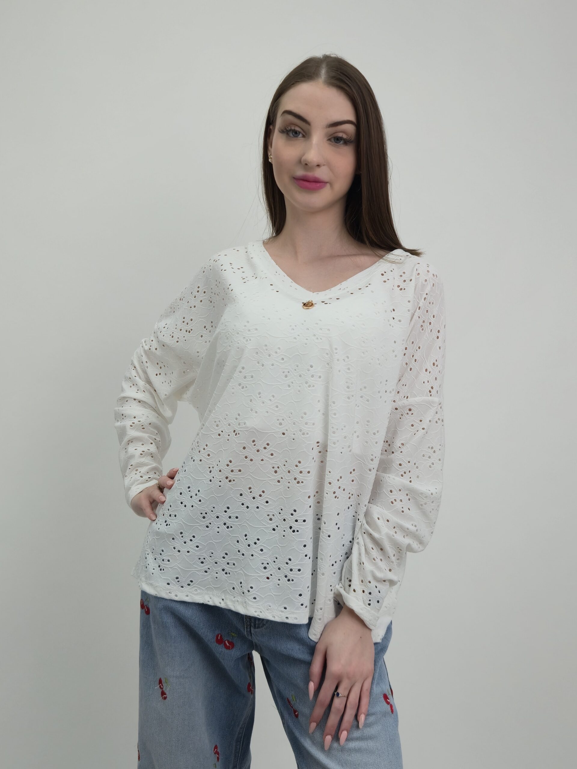 Elegancka i niezwykle kobieca bluzka z długim rękawem wykonana z bardzo miękkiej, przyjemnej w dotyku tkaniny. Model zachwyca subtelnym, florystycznym haftem ażurowym, który pokrywa całą powierzchnię materiału i nadaje stylizacji lekkości oraz romantycznego charakteru.
