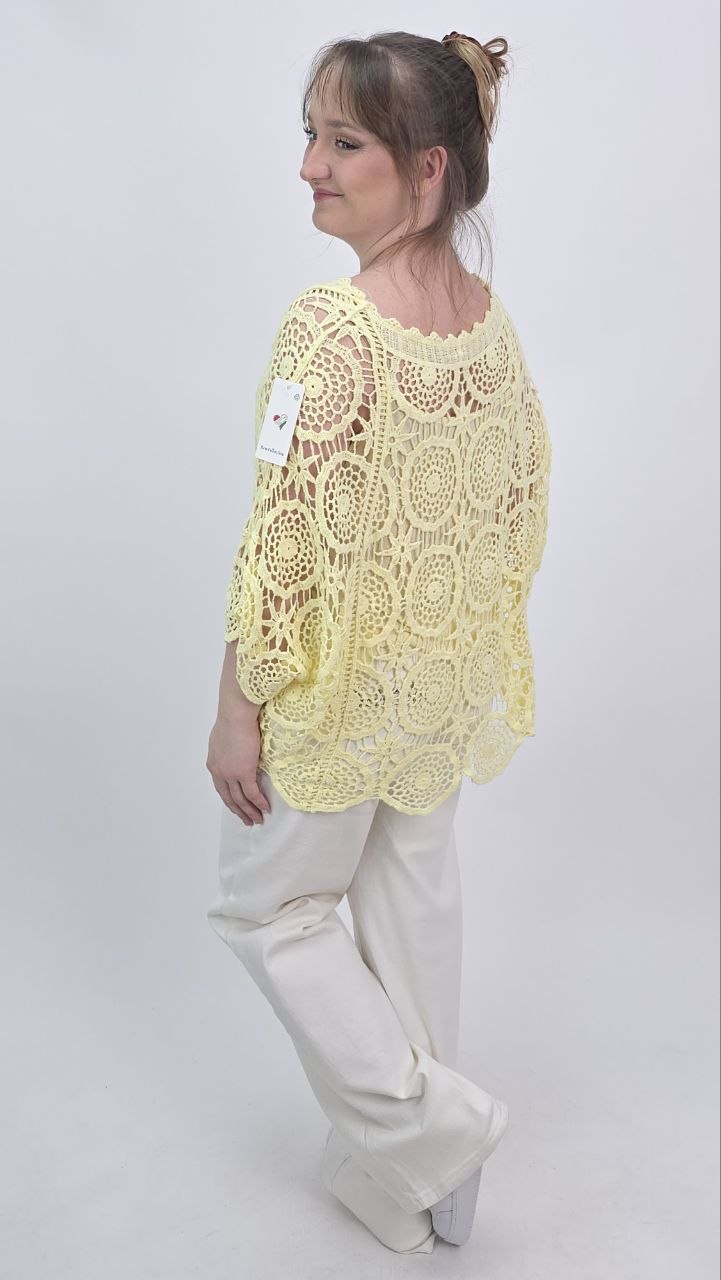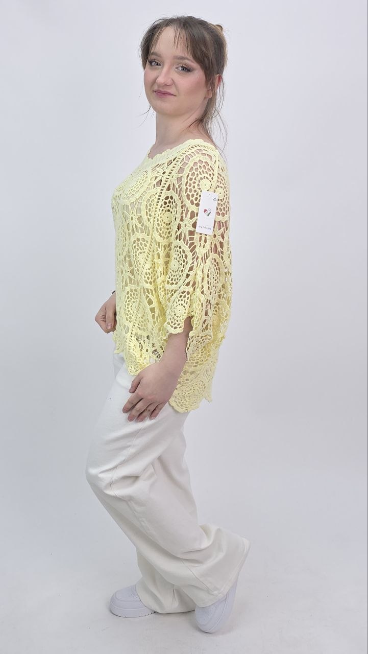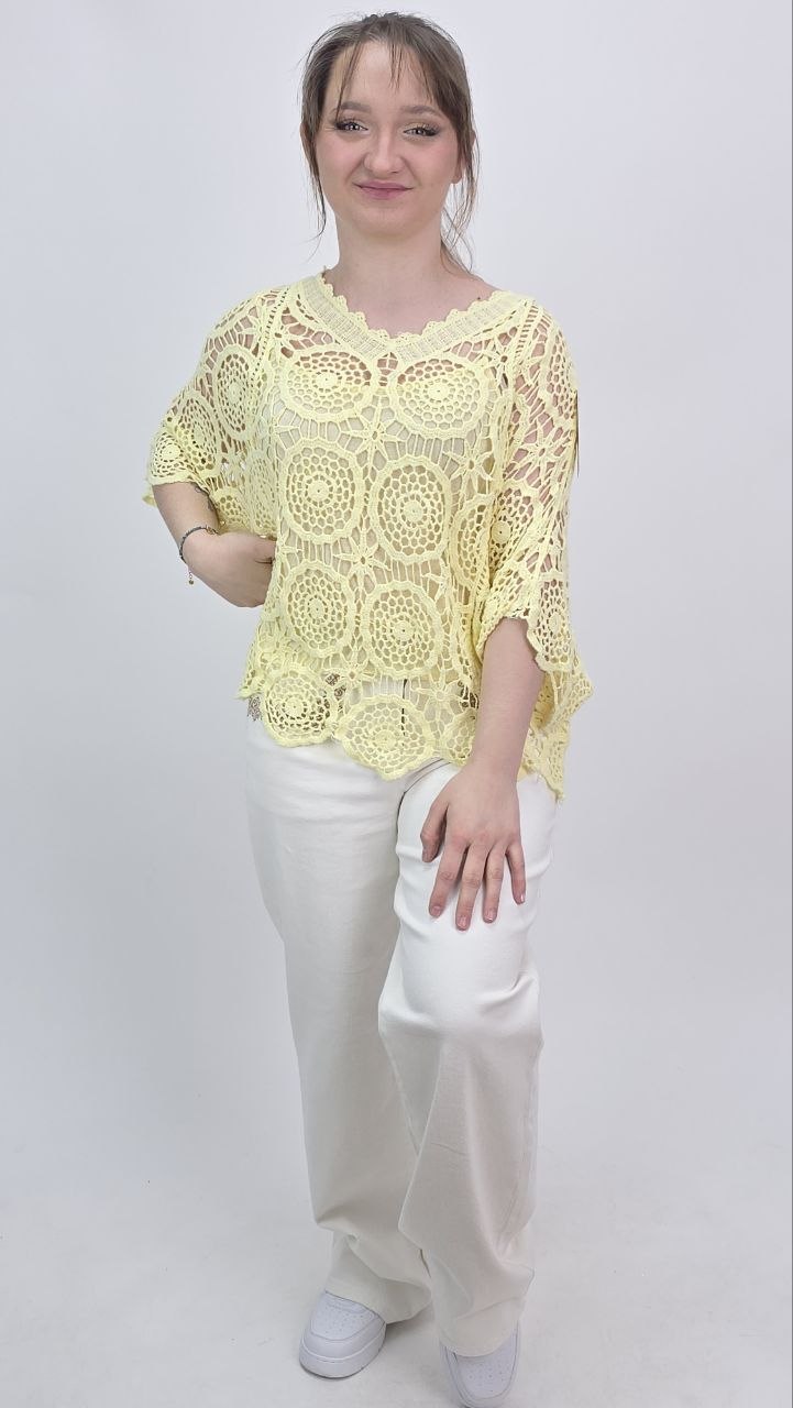 Wyjątkowa ażurowa bluzka o swobodnym kroju w subtelnym, pastelowym odcieniu, która zachwyca lekkością i kobiecym charakterem. Model wykonany z dekoracyjnej dzianiny o misternym splocie, tworzącym efektowny wzór typu crochet.
