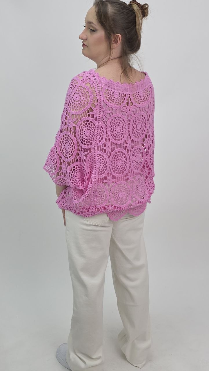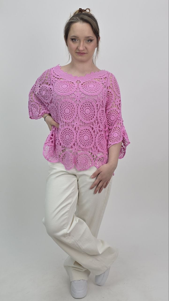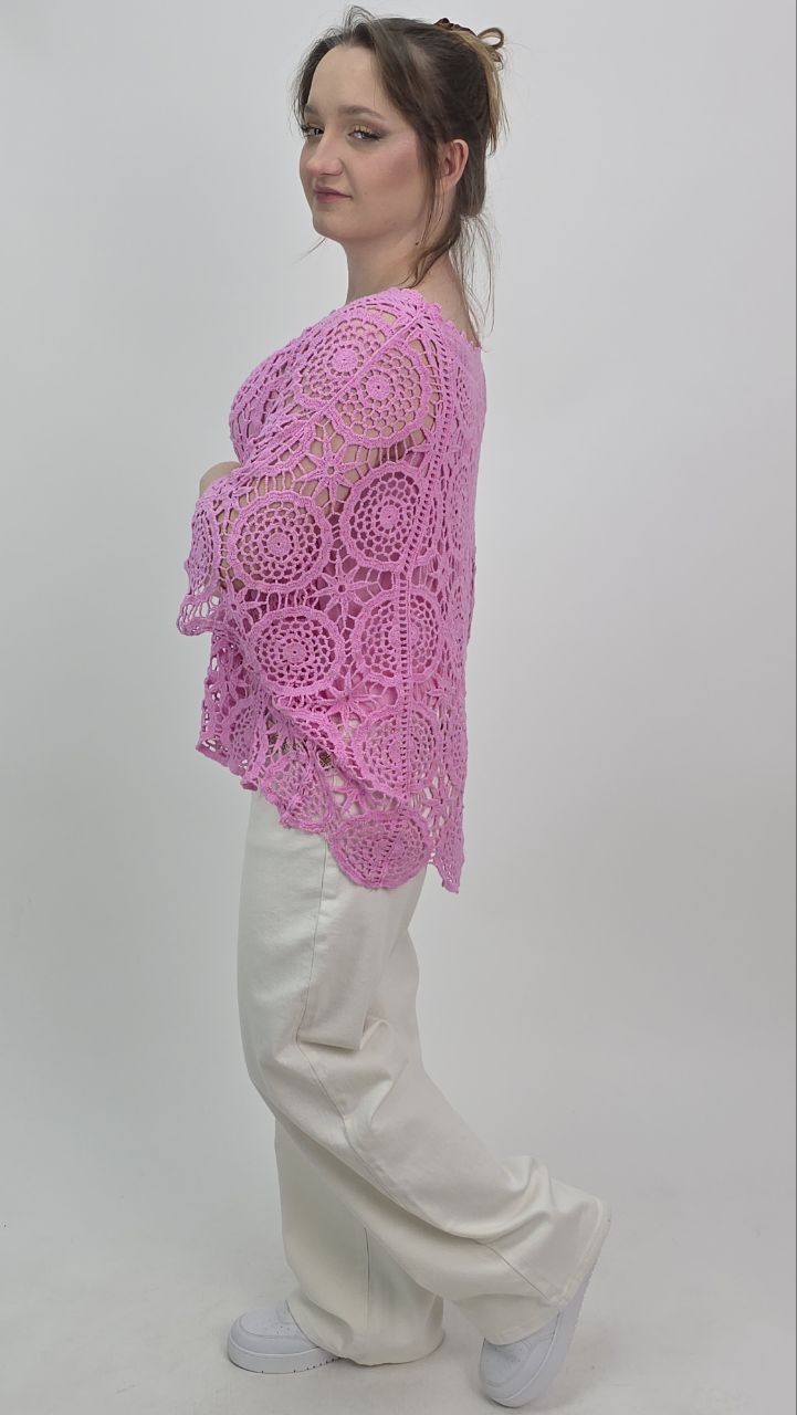 Wyjątkowa ażurowa bluzka o swobodnym kroju w subtelnym, różowym kolorze, która zachwyca lekkością i kobiecym charakterem. Model wykonany z dekoracyjnej dzianiny o misternym splocie, tworzącym efektowny wzór typu crochet.