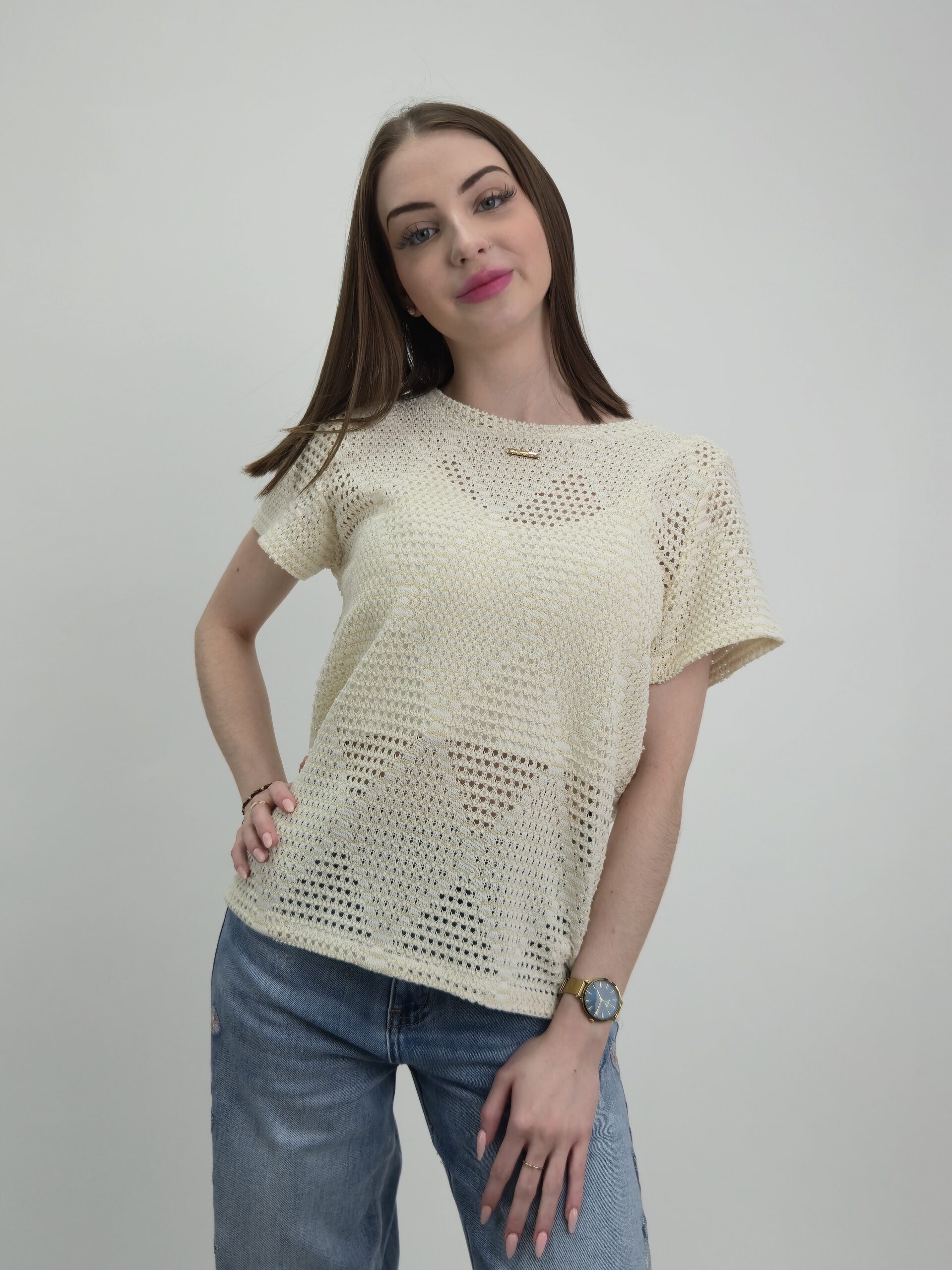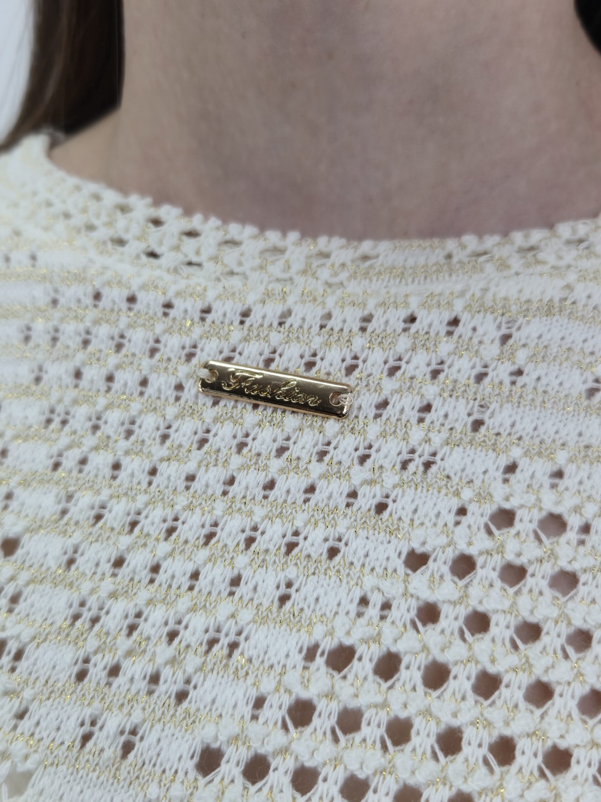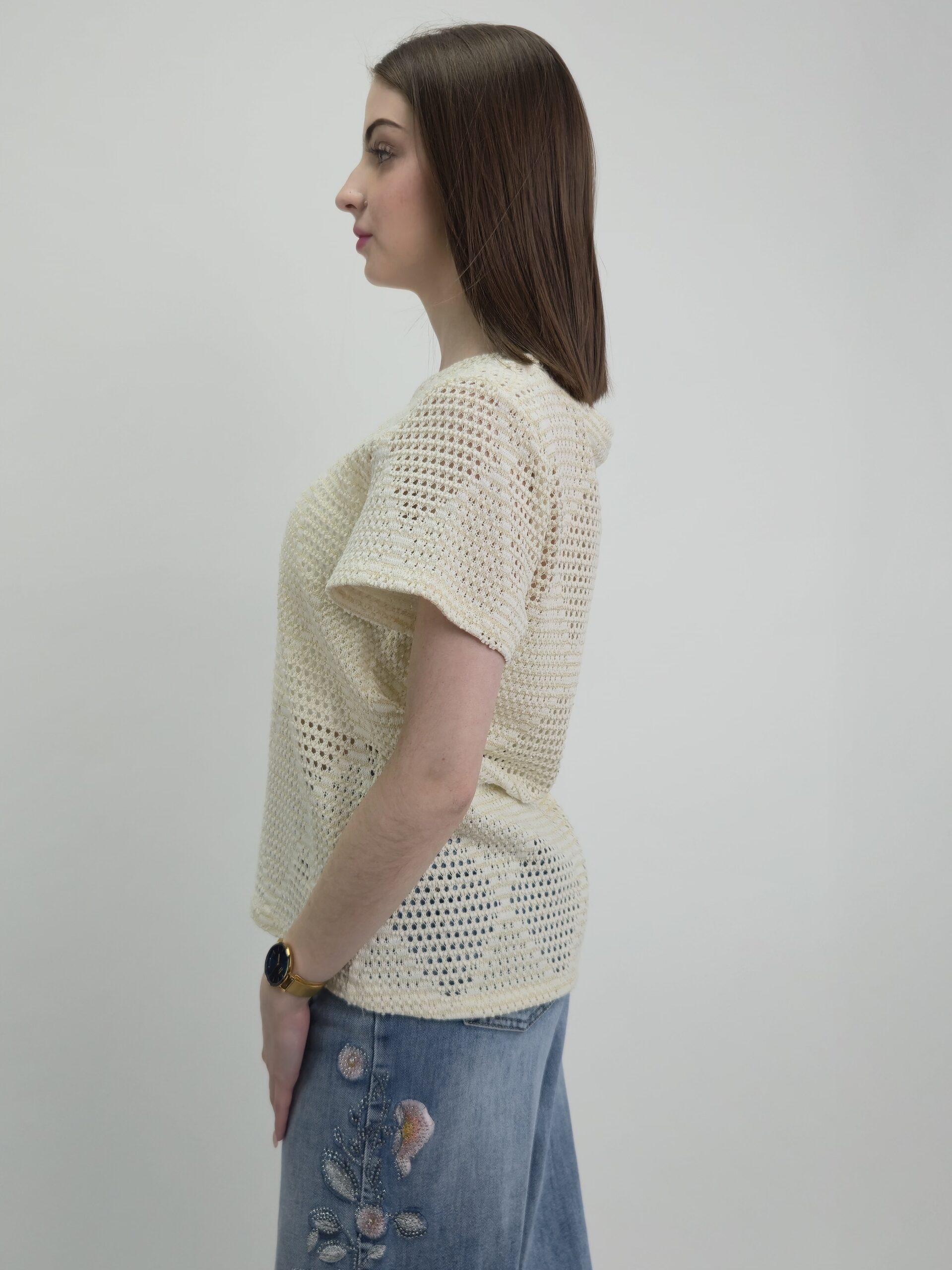 Stylowa bluzka ażurowa wykonana z delikatnej melanżowej przędzy w odcieniach bieli i koloru żółtego. Materiał subtelnie połyskuje dzięki dodatkowemu włóknu lurex, co nadaje całości eleganckiego, lekko biżuteryjnego efektu.