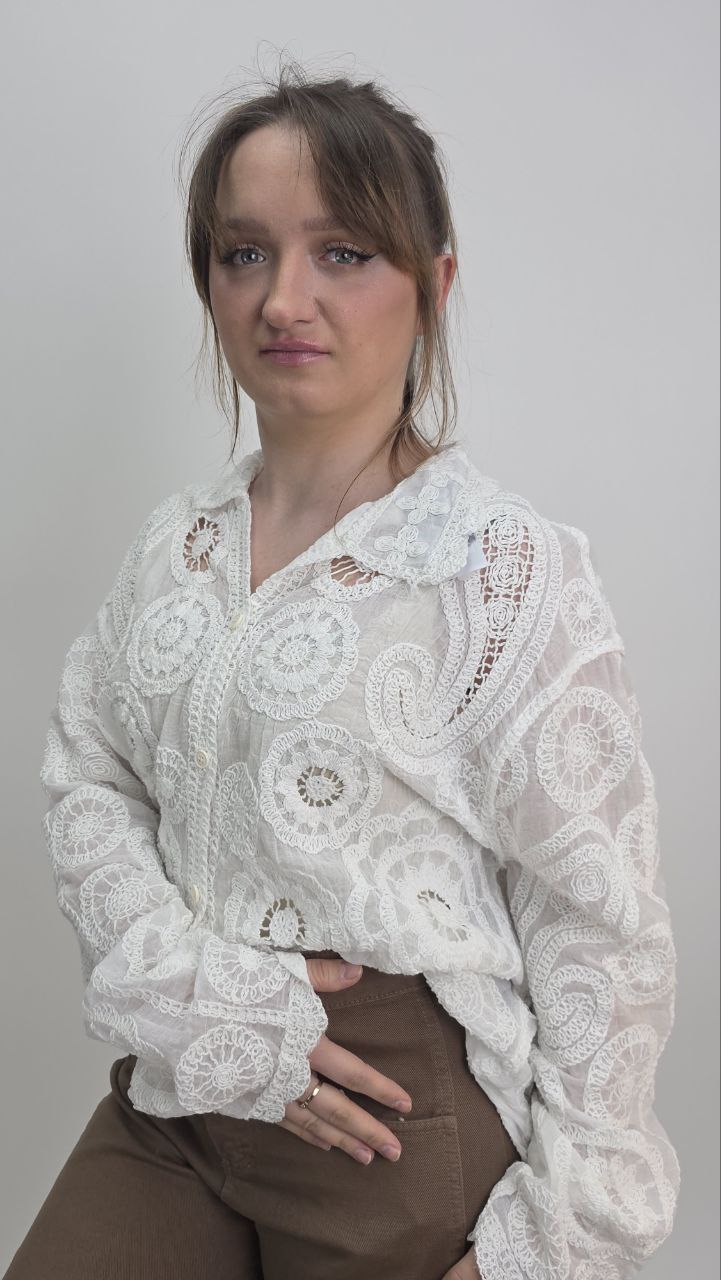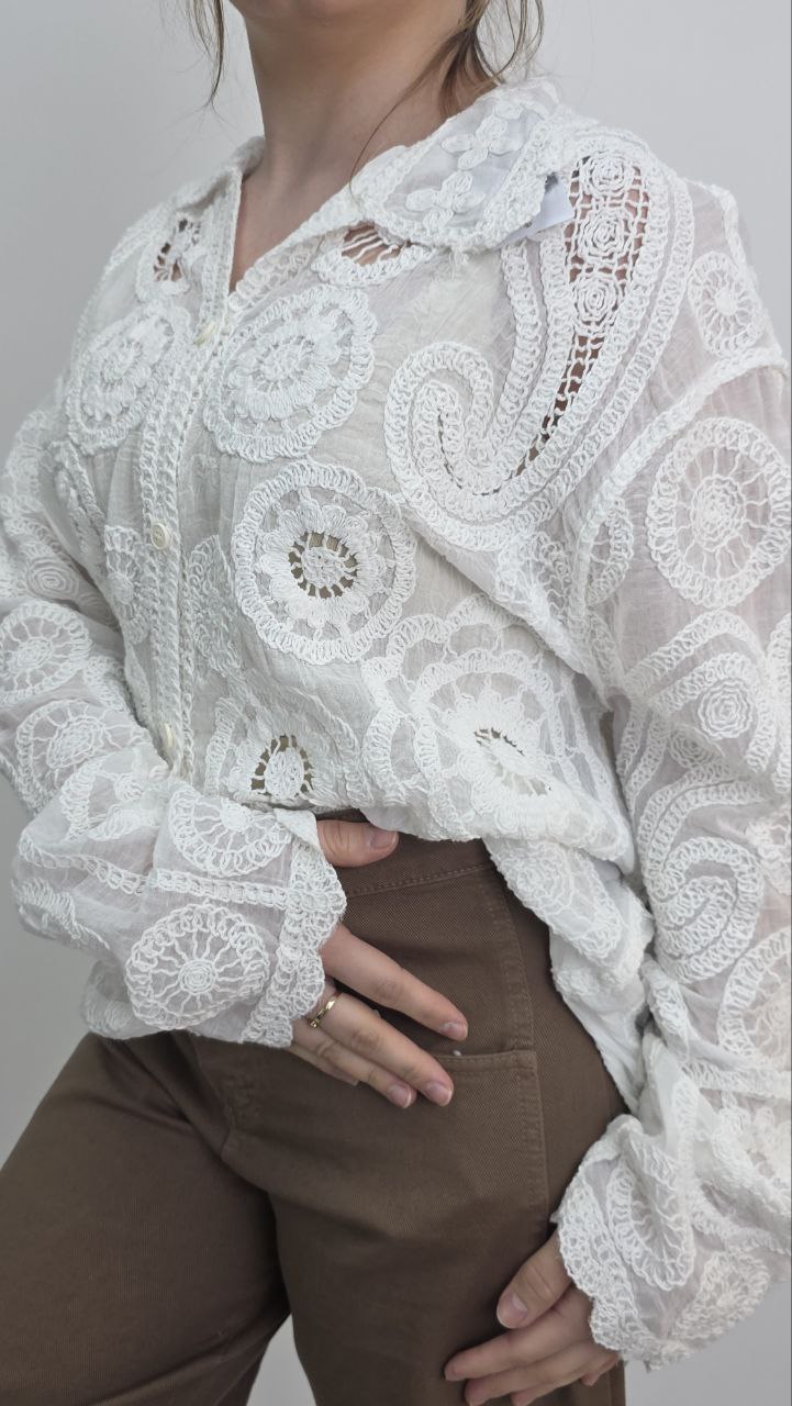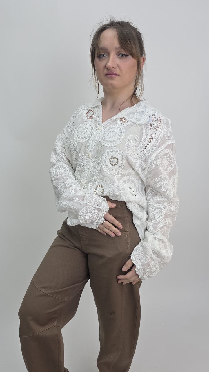 Bluzka posiada klasyczny kołnierzyk oraz zapięcie na guziki, dzięki czemu łączy romantyczny styl z ponadczasową formą koszulową. Delikatna, ażurowa struktura materiału sprawia, że model prezentuje się bardzo stylowo i przyciąga uwagę wyjątkowym wykończeniem.