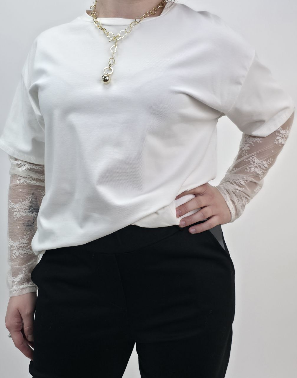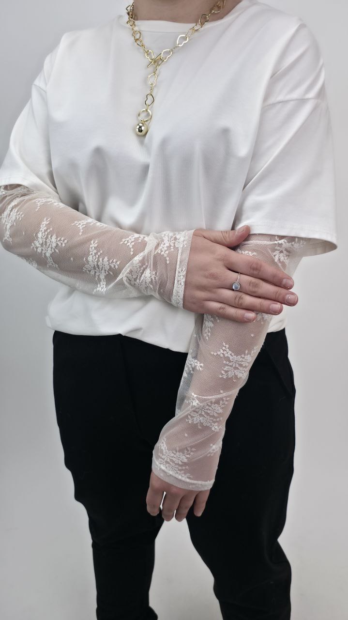Wyjątkowe Rękawy: Klasyczny krój został przedłużony o misterną koronkę z motywem kwiatowym, co nadaje bluzce biżuteryjnego charakteru.