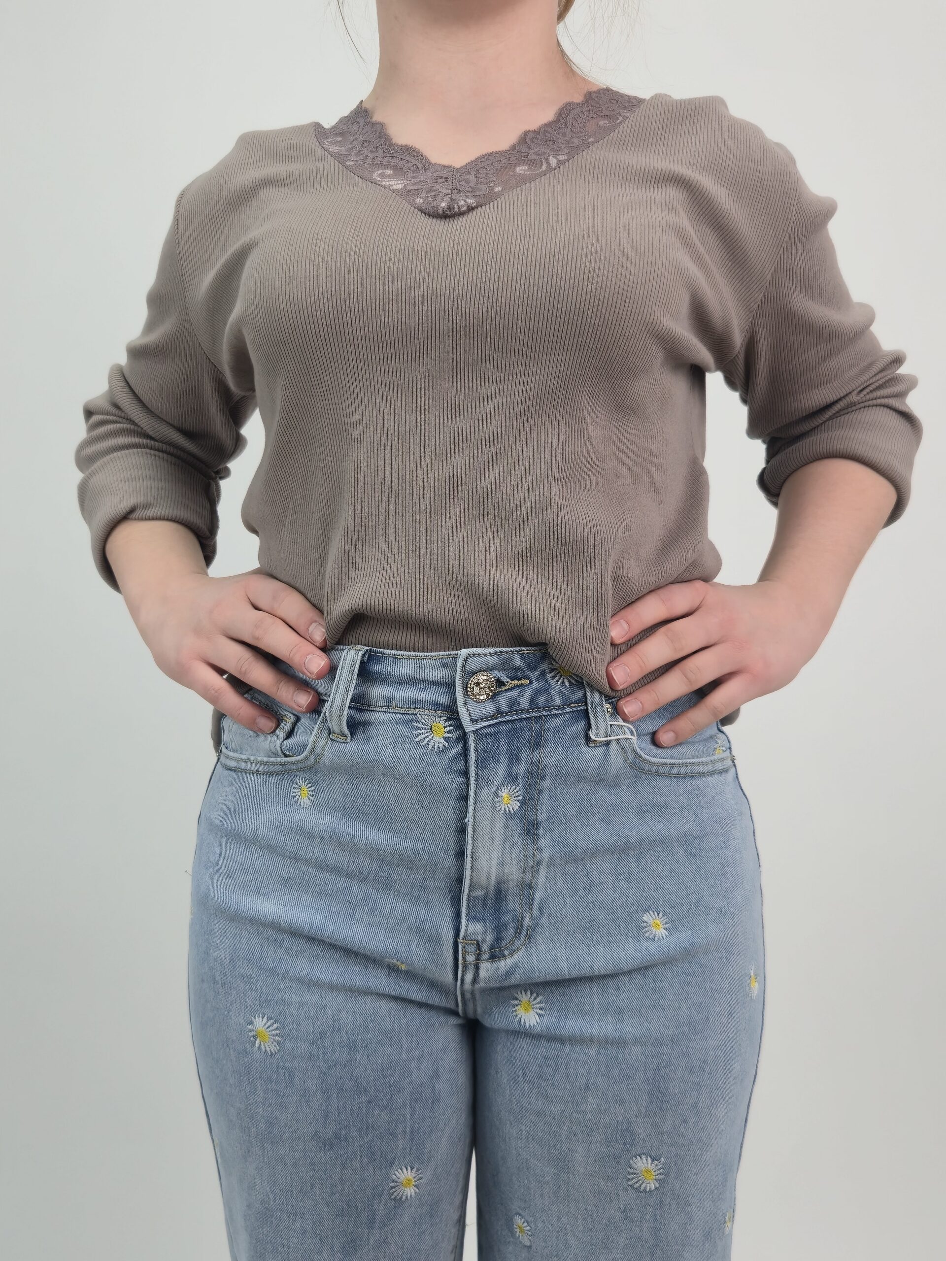 Klasyczna Bluzka Prążkowana z Koronkowym Wycięciem