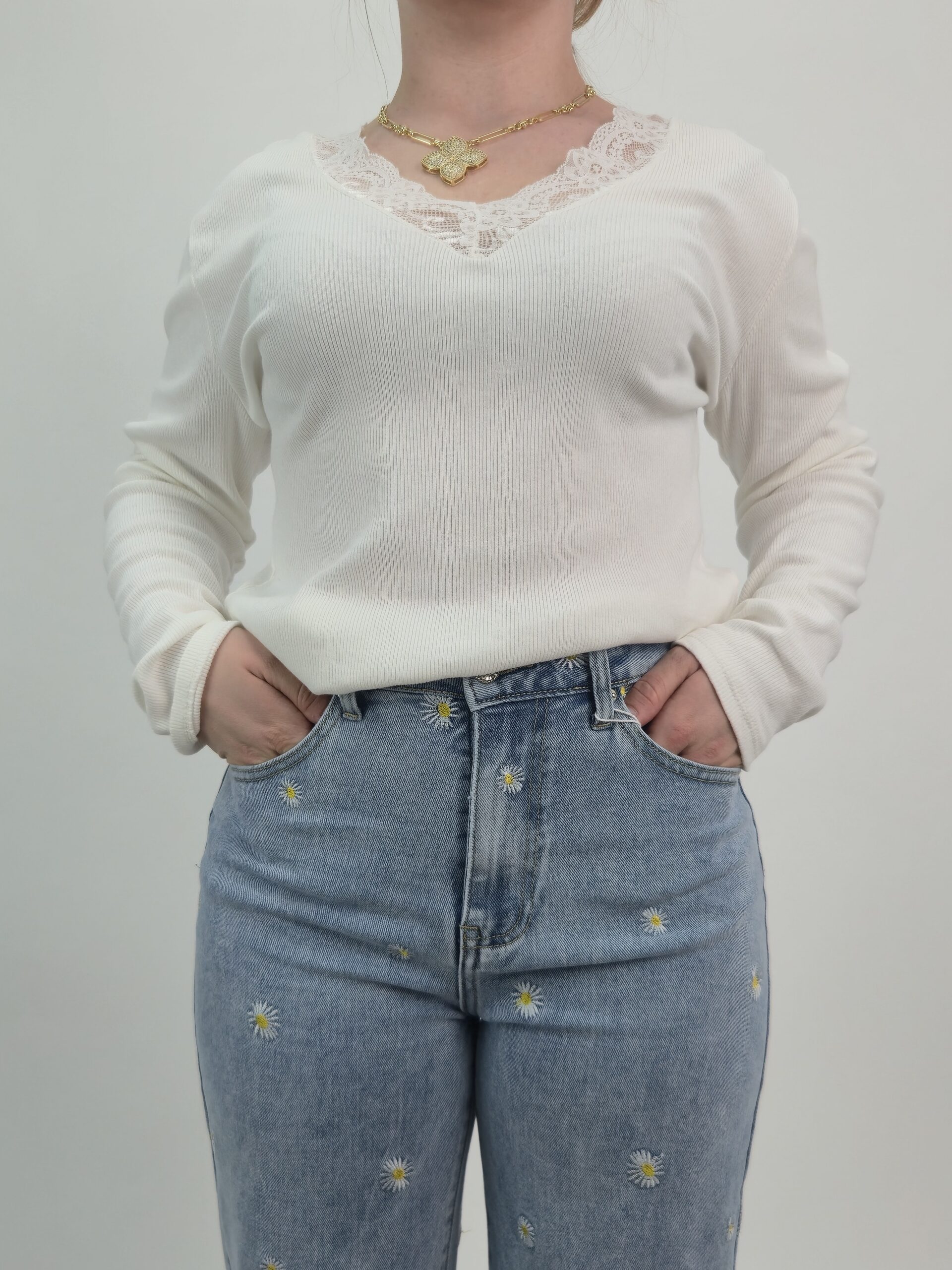 Klasyczna Bluzka Prążkowana z Koronkowym Wycięciem