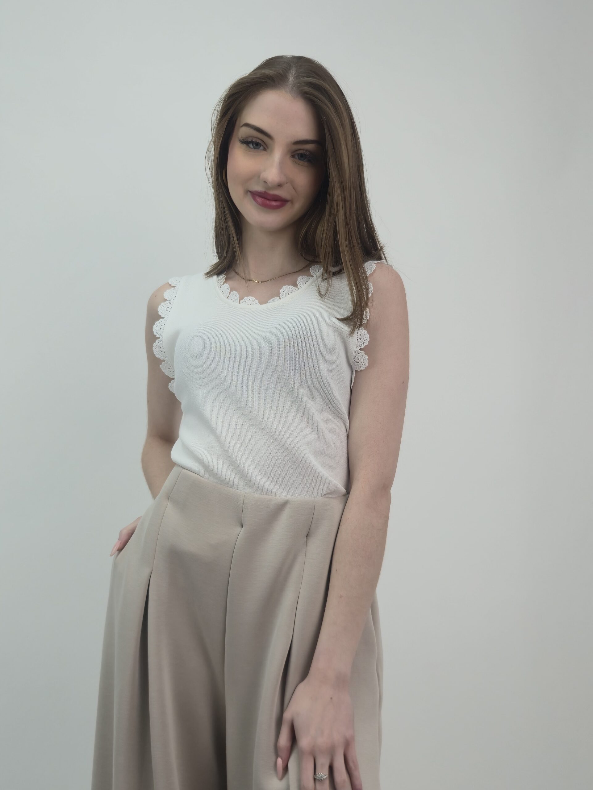 Przedstawiamy Państwu niezwykle subtelną i pełną wdzięku propozycję, która idealnie wpisuje się w lekkie, wiosenne trendy. Bluzka bez rękawów w odcieniu śmietankowym to połączenie swobody z wyrafinowanym detalem, stanowiące kwintesencję kobiecego stylu.