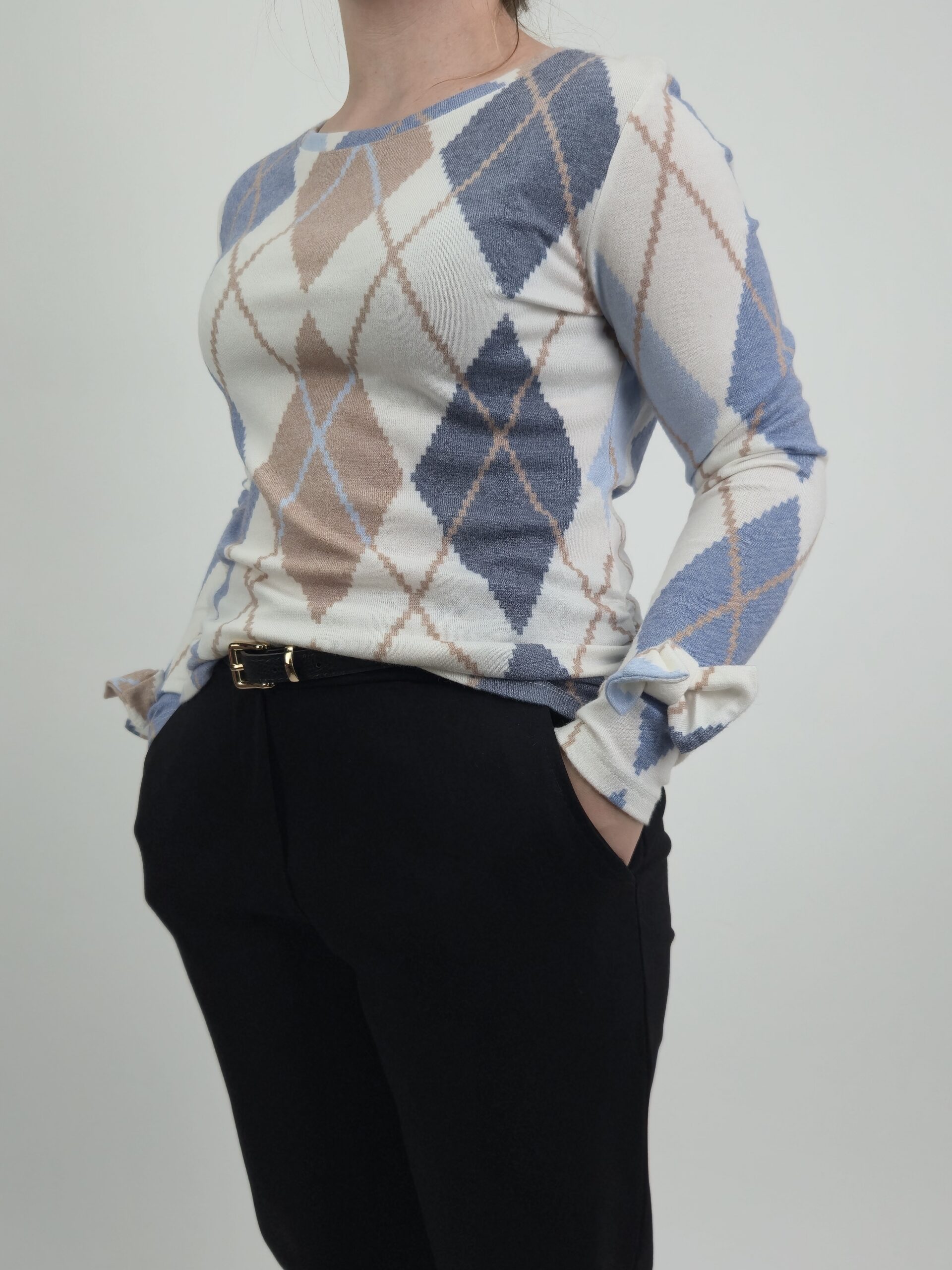 Przedstawiamy Państwu niezwykle kobiecą i stylową propozycję, która przyciąga wzrok unikatowym wzornictwem oraz dopracowanymi detalami. Ta dzianinowa bluzka w odcieniach beżu i niebieskiego to idealny wybór dla kobiet, które szukają ubrań z charakterem, nie rezygnując przy tym z najwyższej jakości materiałów.