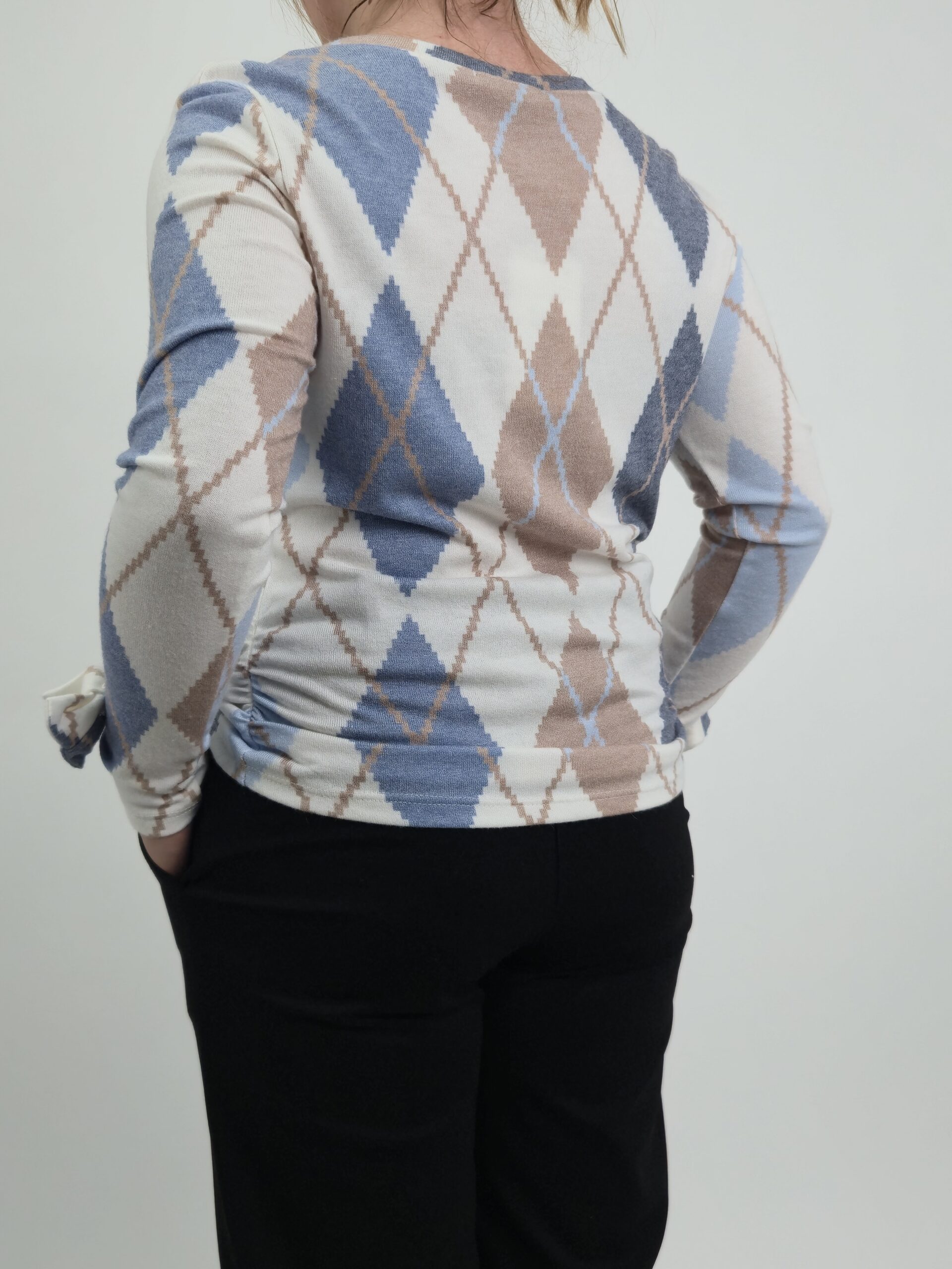 Efektowny Wzór: Klasyczny motyw rombów w beżowo-niebieskiej tonacji nadaje stylizacji głębi i nowoczesnego sznytu.