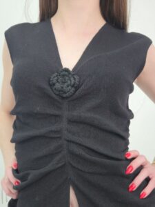 Kolor czarny to ponadczasowa klasyka, która pasuje do wielu stylizacji i sezonów. Dodatkowo ozdobny kwiat oraz marszczenie sprawiają, że bluzka wyróżnia się subtelną elegancją.
