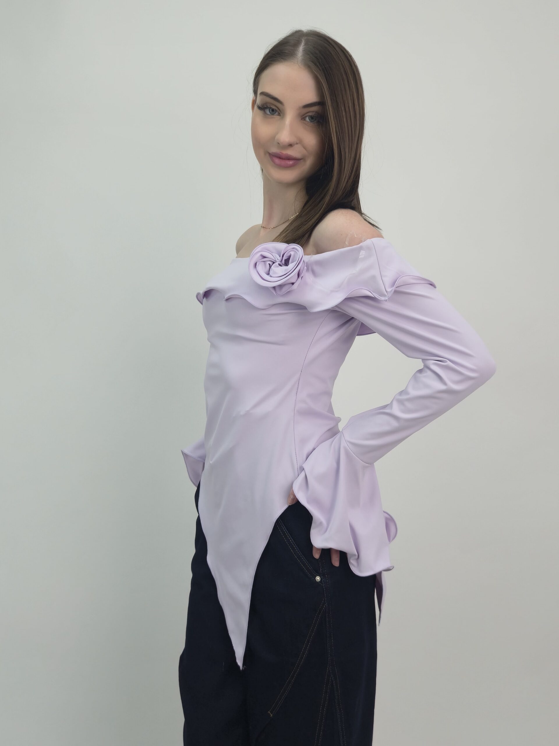 Dodatkowo ozdobna falbana oraz aplikacja w formie kwiatu przy dekolcie nadają całości romantycznego charakteru. W efekcie bluzka przyciąga uwagę, ale jednocześnie pozostaje bardzo stylowa.