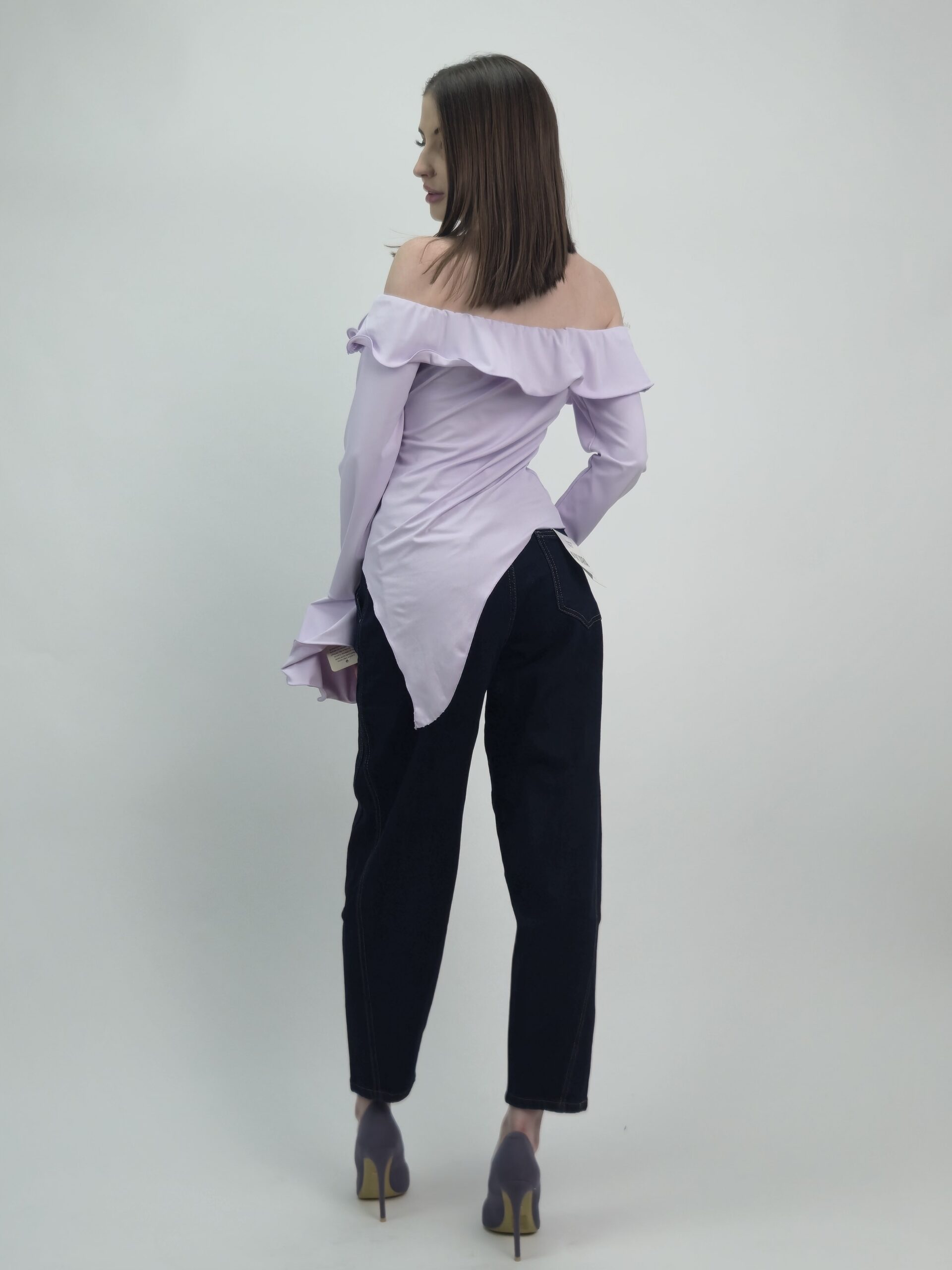 Bluzka typu hiszpanka pięknie eksponuje linię ramion, dzięki czemu stylizacja nabiera lekkości i subtelności. Ponadto asymetryczny dół dodaje nowoczesnego akcentu, co wyróżnia ten model na tle klasycznych bluzek.