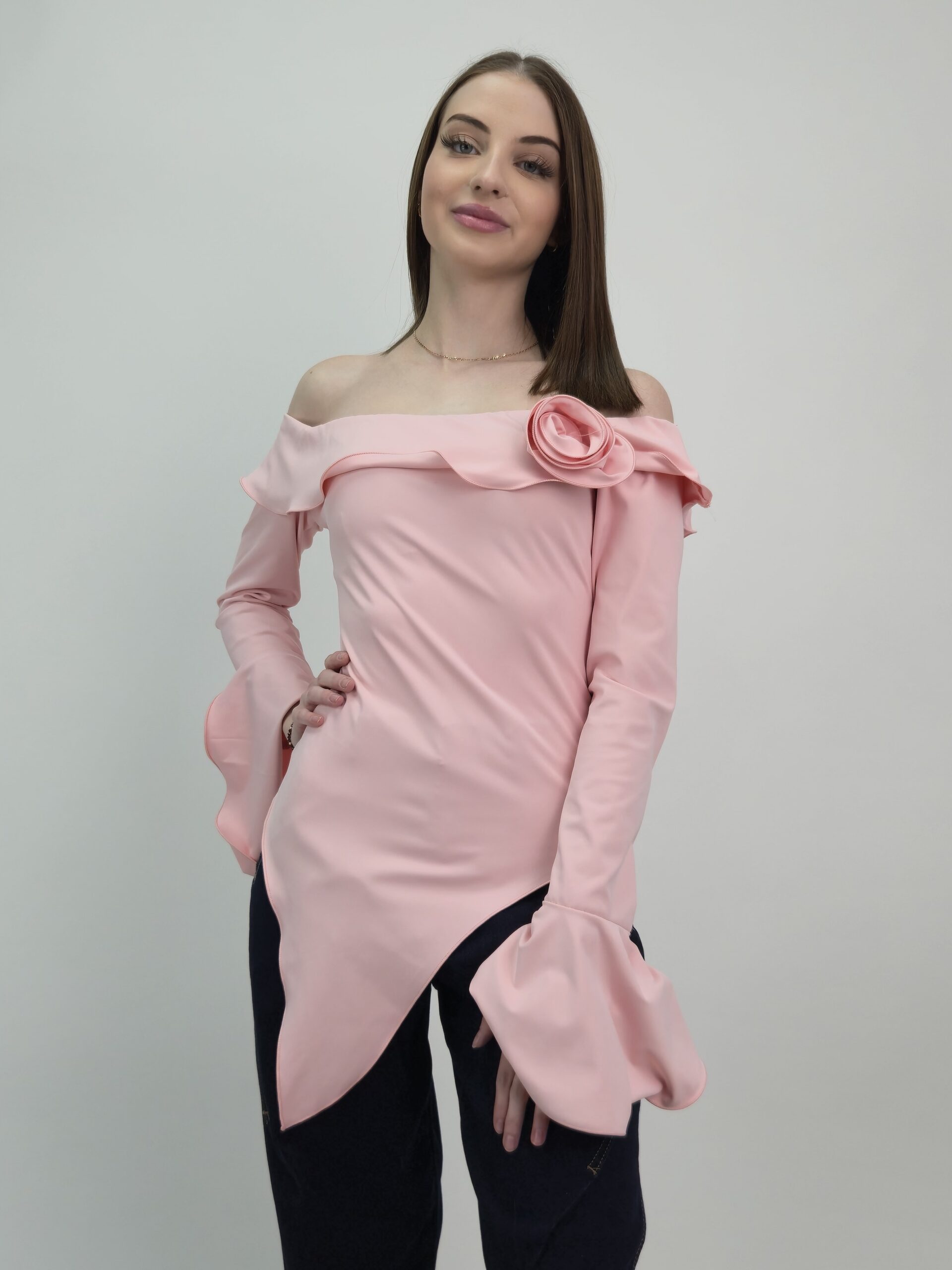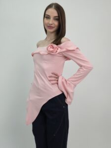Różowa bluzka damska hiszpanka z ozdobnym kwiatem