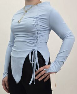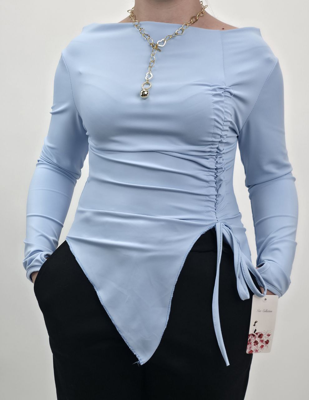 Bluzka damska błękitna to wyjątkowa propozycja dla kobiet, które cenią nowoczesny design i dopracowane detale. Dzięki marszczeniu na przodzie model subtelnie modeluje sylwetkę, a jednocześnie podkreśla talię. Co więcej, asymetryczny dół oraz wiązanie nadają całości oryginalnego charakteru, dlatego bluzka przyciąga uwagę i wyróżnia się na tle klasycznych modeli.