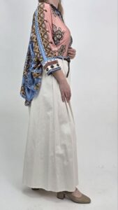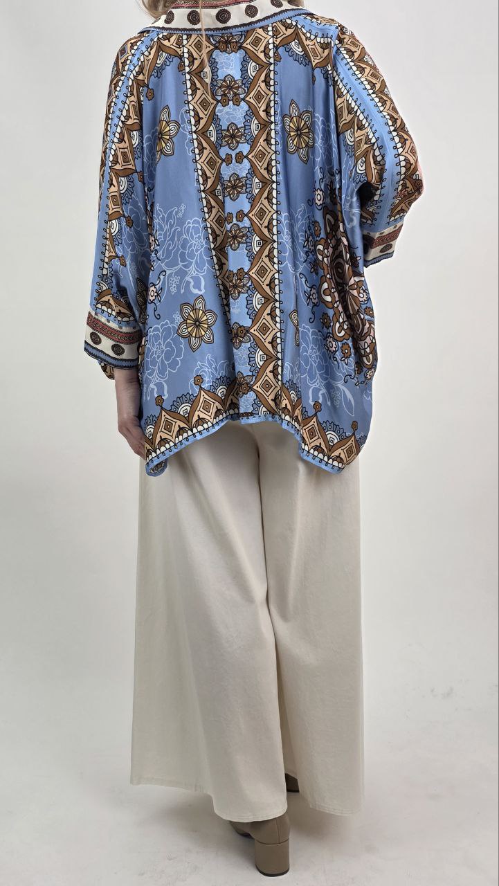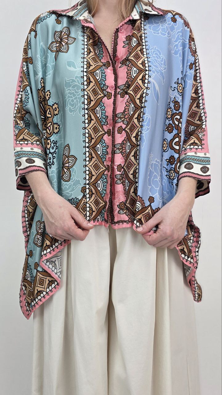 Tunika damska oversize w stylu boho to wyjątkowa propozycja dla kobiet, które cenią modę, wygodę oraz delikatne kolory. Model wyróżnia się pastelowym połączeniem błękitu, mięty oraz różu, dzięki czemu prezentuje się lekko, świeżo i bardzo kobieco. Dodatkowo efektowne wzory nadają całości modnego charakteru.