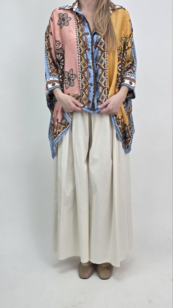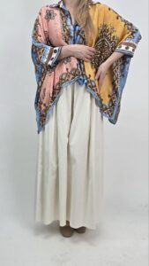 Tunika damska oversize w stylu boho to wyjątkowa propozycja dla kobiet, które lubią wyróżniać się stylem. Ten model zachwyca połączeniem kolorów – różu, błękitu oraz musztardowego, dzięki czemu tworzy niezwykle efektowny i modny look. Dodatkowo wzory inspirowane stylem boho nadają całości charakteru i oryginalności.