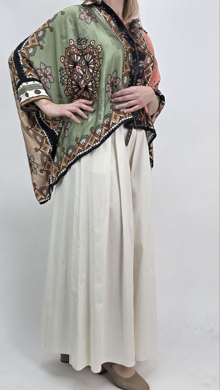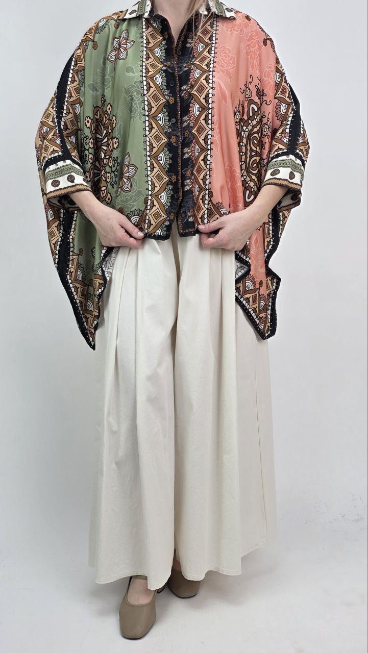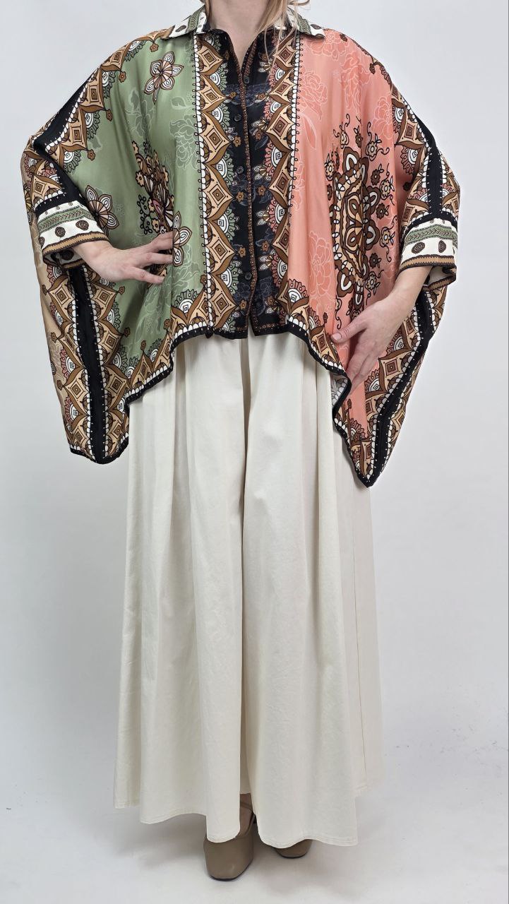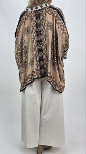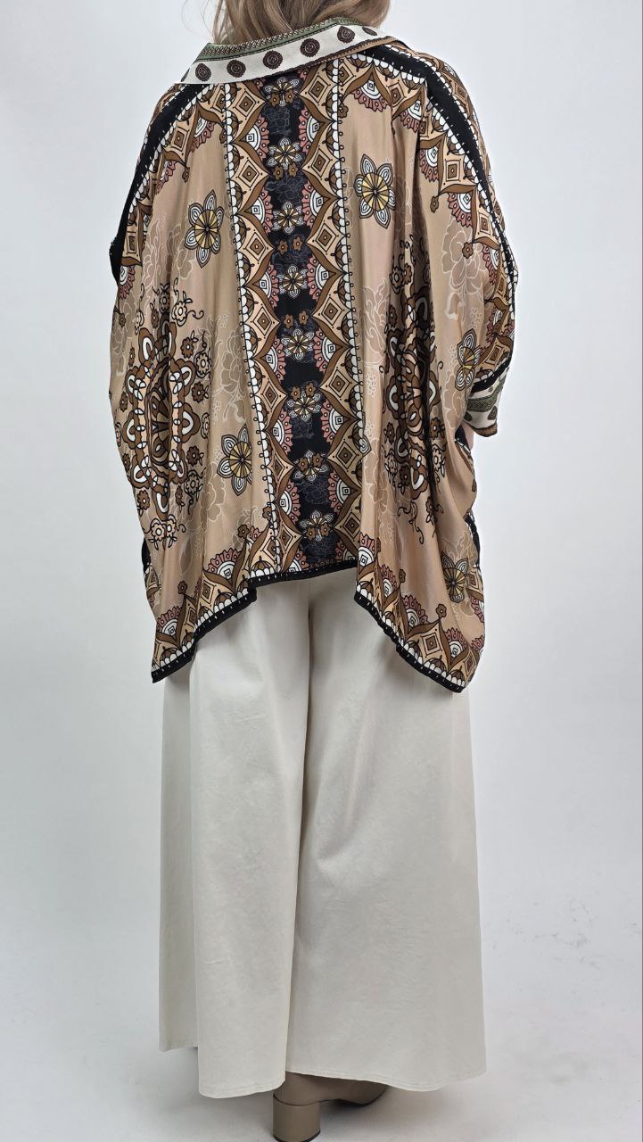 Tunika damska oversize w stylu boho to doskonały wybór dla kobiet, które cenią wygodę, modę oraz unikalne wzory. Model wyróżnia się efektownym printem w odcieniach beżu, brązu oraz zieleni, dlatego przyciąga uwagę i nadaje stylizacji wyjątkowego charakteru. Dodatkowo modny design sprawia, że tunika wpisuje się w aktualne trendy.