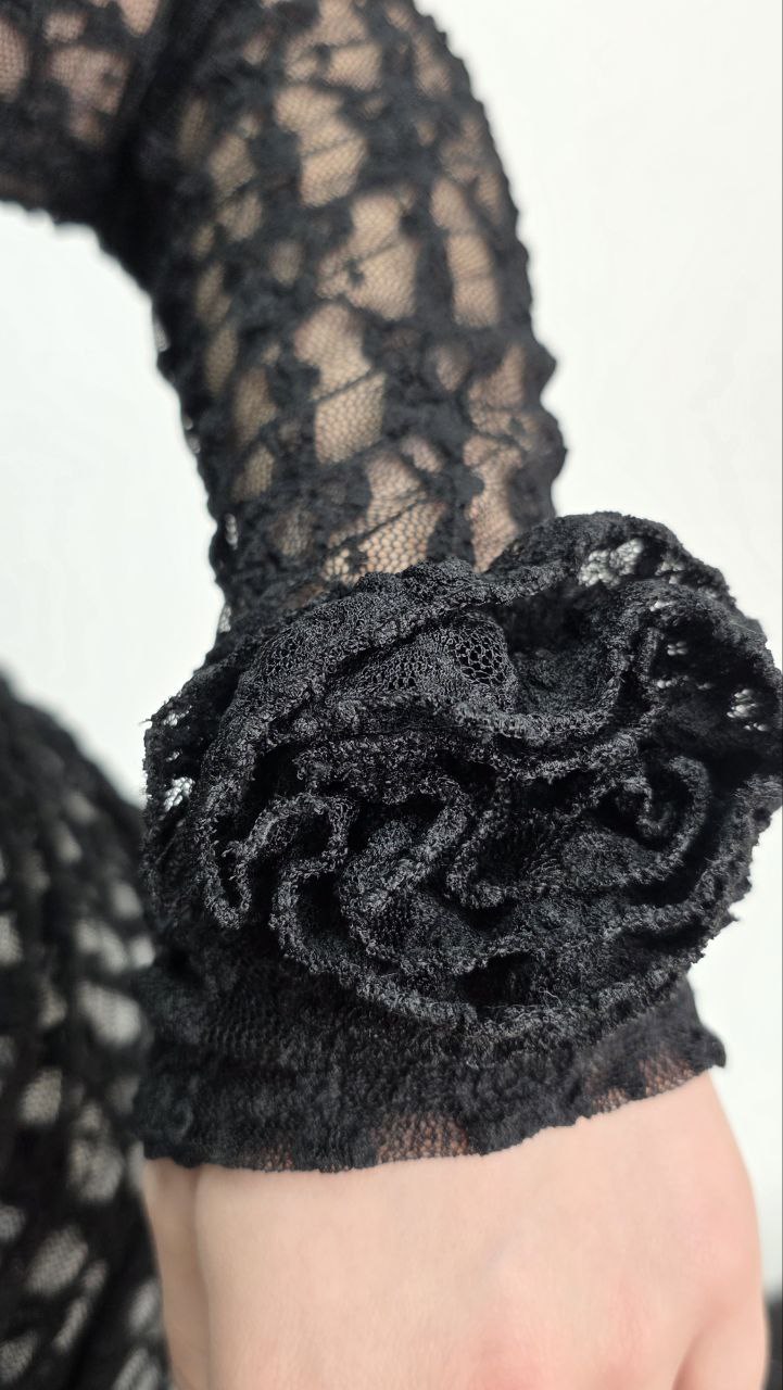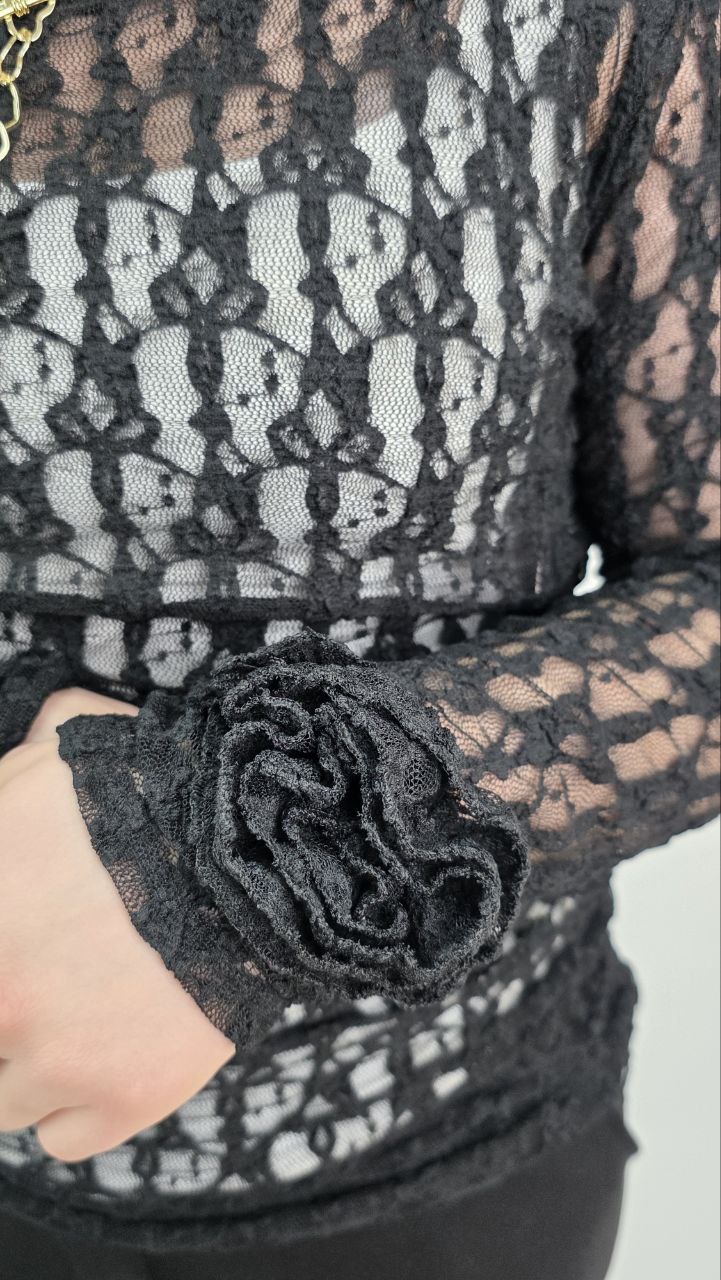 Elegancka Bluzka Koronkowa z Różami – Czarny