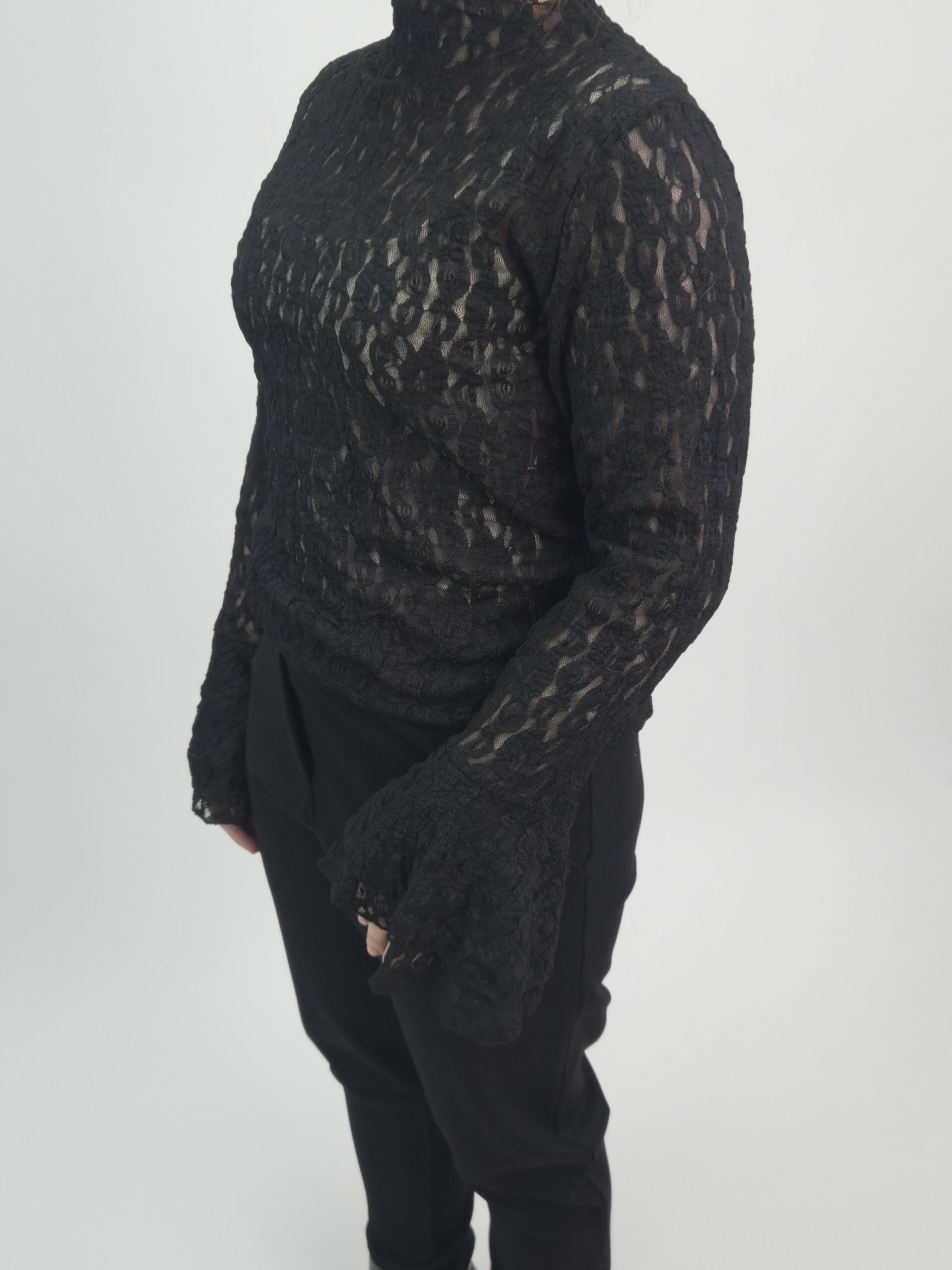 Przedstawiamy Państwu niezwykle romantyczną propozycję, która w subtelny sposób definiuje kobiecy szyk. Bluzka wykonana z miękkiej, kunsztownej koronki w czarnym odcieniu to model stworzony z myślą o wyjątkowych okazjach, gdzie elegancja spotyka się z niebywałą delikatnością.