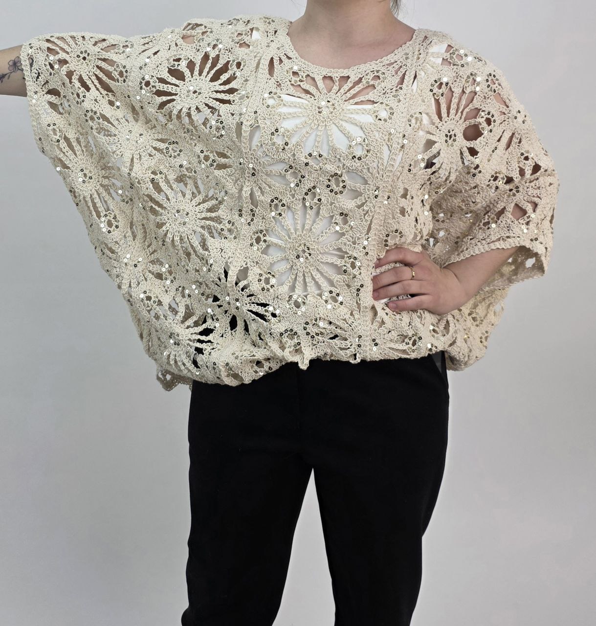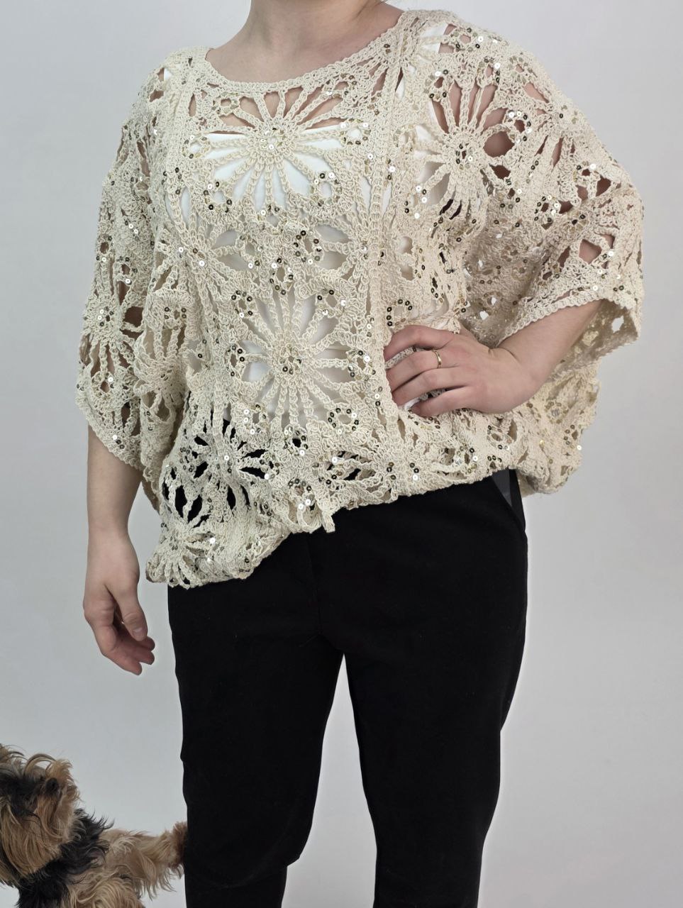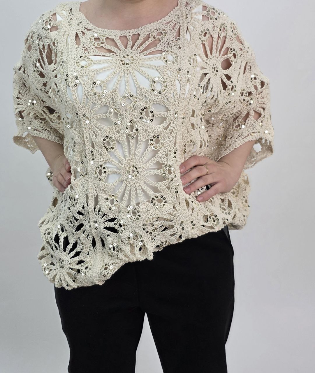 Bluzka siateczkowa „nietoperz” bawełniana z cekinowym zdobieniem – beżowa