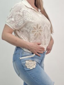 Naszywane kwiaty przyciągają uwagę i wyróżniają ten model na tle klasycznych bluzek. Dodatkowo ażurowe wykończenie podkreśla lekkość stylizacji i wpisuje się w aktualne trendy. Dzięki temu możesz stworzyć look, który wygląda modnie i świeżo.