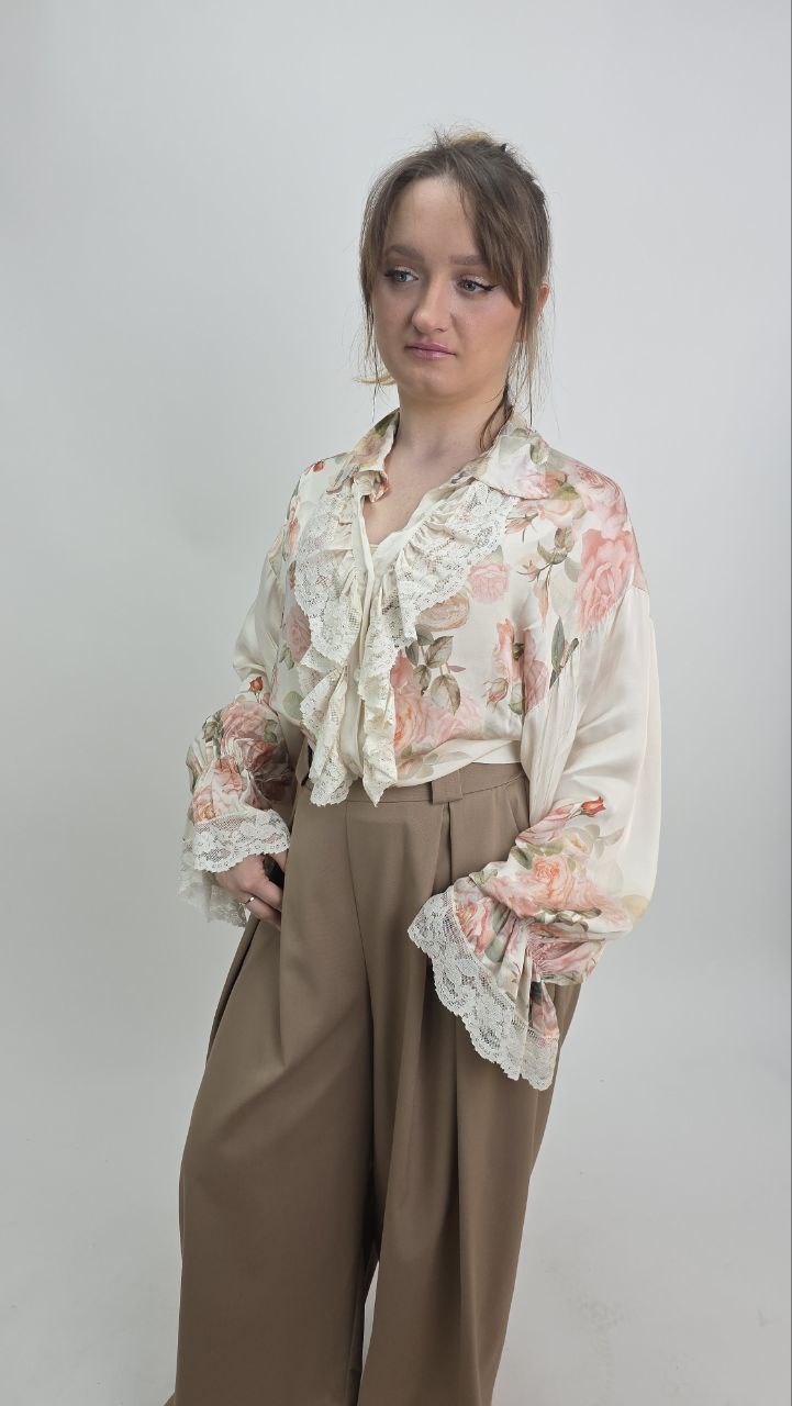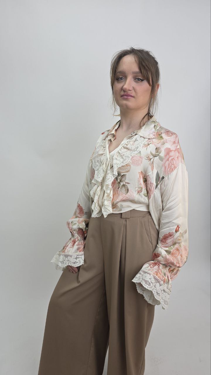 Elegancka i niezwykle kobieca bluzka wykonana z delikatnie satynowanej wiskozy, ozdobiona romantycznym printem róż w subtelnej, śmietankowej kolorystyce. Lekki, miękki materiał pięknie układa się na sylwetce i nadaje stylizacji wyjątkowej elegancji.