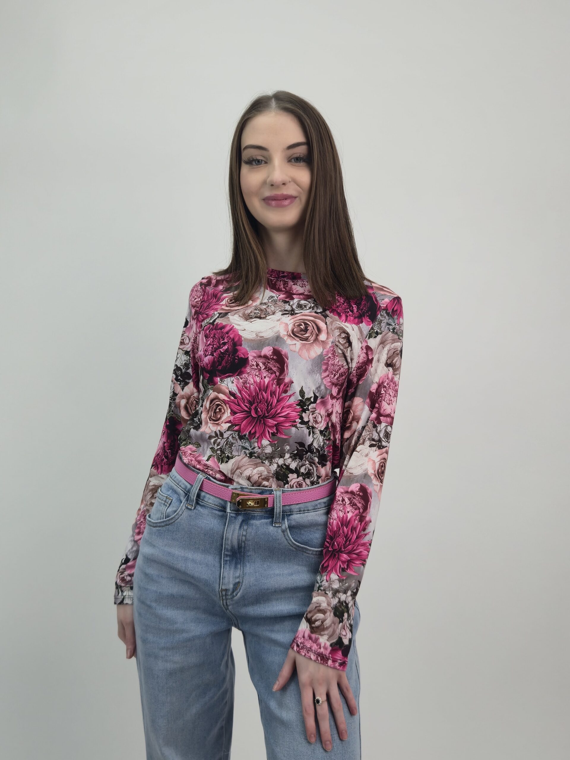 Zachwycająca bluzka o dopasowanym kroju, która podkreśla sylwetkę i dodaje stylizacji wyjątkowej kobiecości. Model wyróżnia się efektownym, artystycznym printem w odcieniach różu, bordo i beżu, tworząc elegancką kompozycję kwiatową, która przyciąga spojrzenia i nadaje całości luksusowego charakteru.