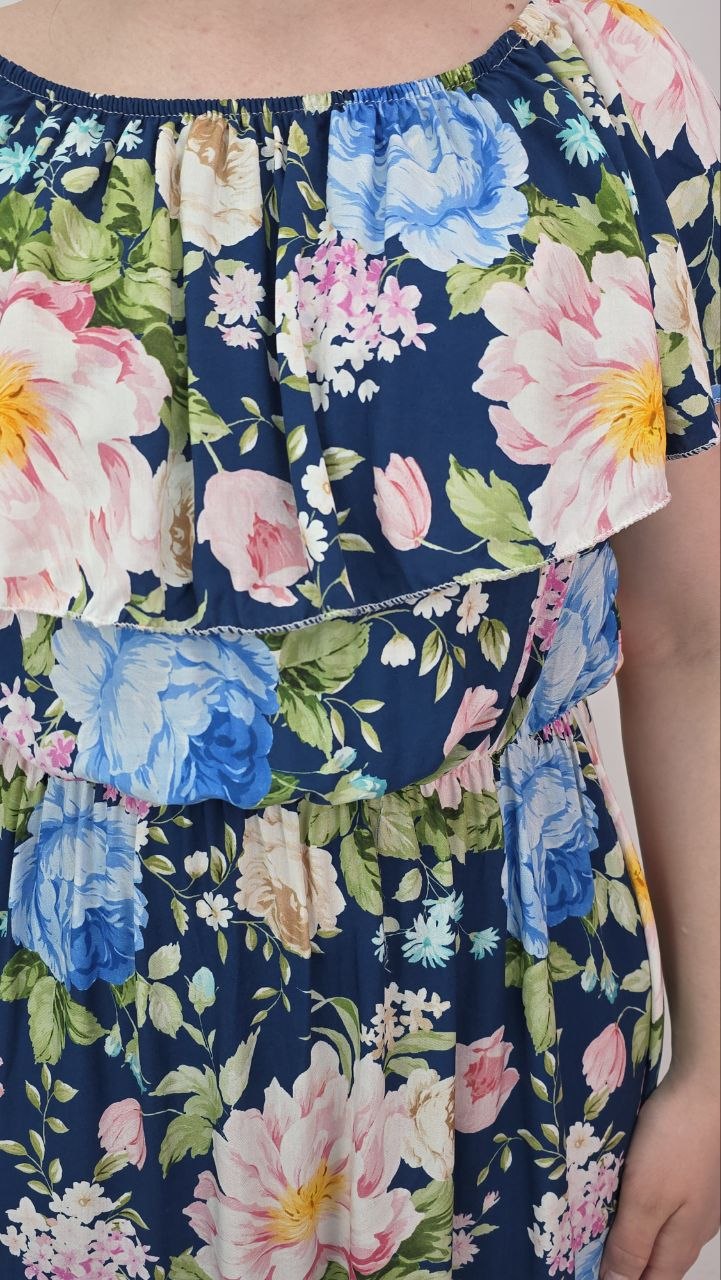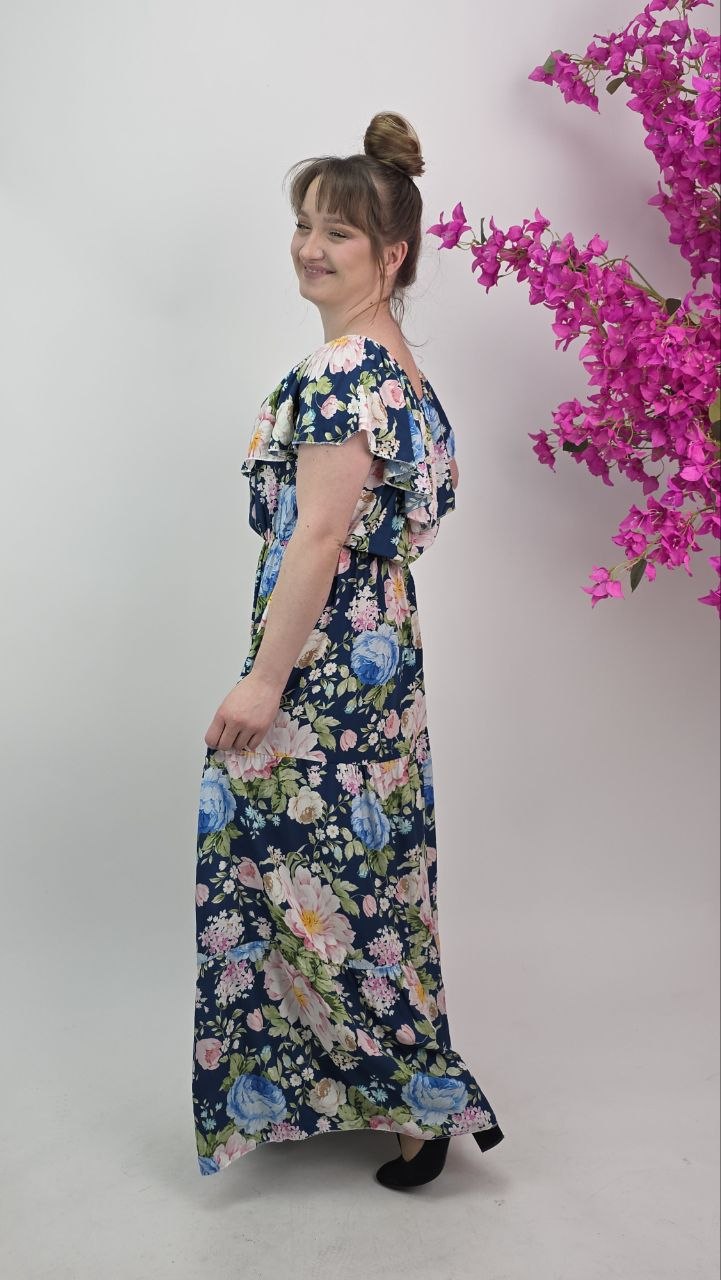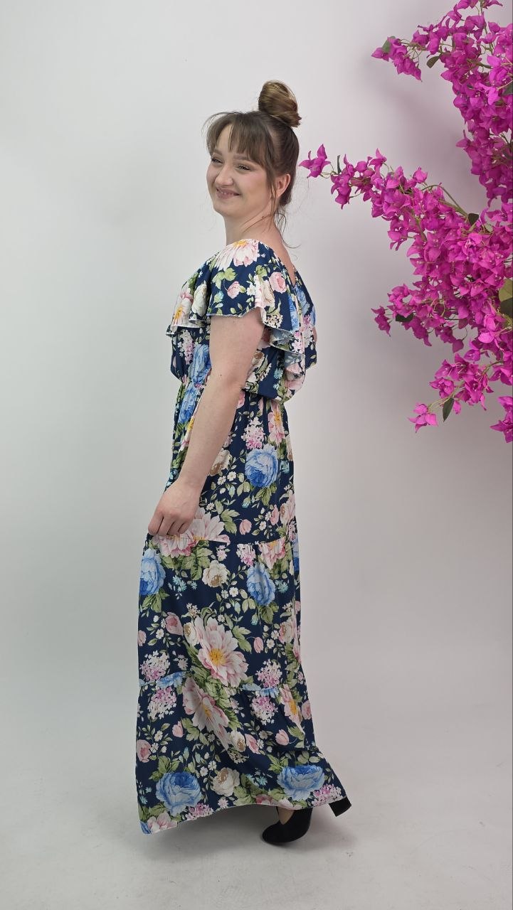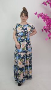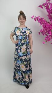 Długa sukienka w kwiaty na granatowym tle to wyjątkowa propozycja dla kobiet, które szukają połączenia komfortu i efektownego wyglądu. Delikatny, pastelowy print florystyczny pięknie kontrastuje z głębokim kolorem tkaniny, tworząc elegancką, a jednocześnie romantyczną całość.