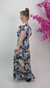 Ta długa sukienka w kwiaty daje wiele możliwości stylizacyjnych. Możesz zestawić ją z sandałami na płaskiej podeszwie, espadrylami lub eleganckimi butami na obcasie.