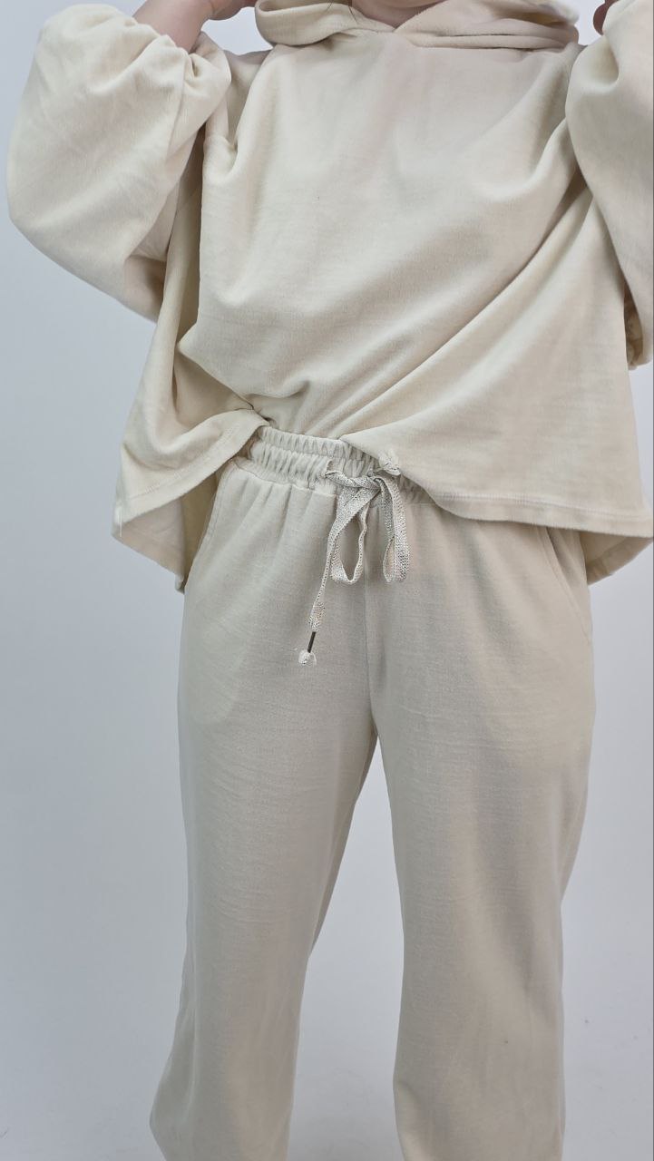 Stylowy komplet dresowy wykonany z luksusowo miękkiego weluru. Model ten to idealne połączenie codziennej wygody z unikalnymi detalami, które wyróżniają go na tle klasycznych dresów.
