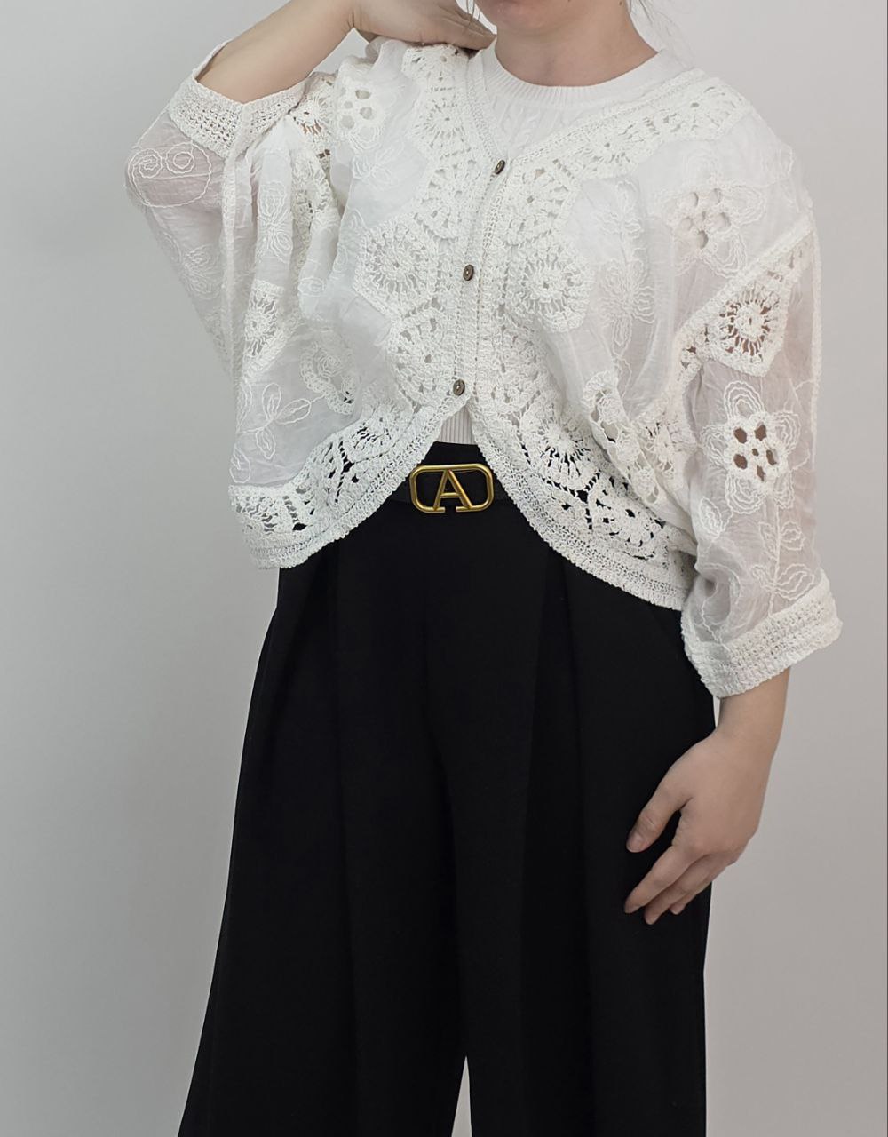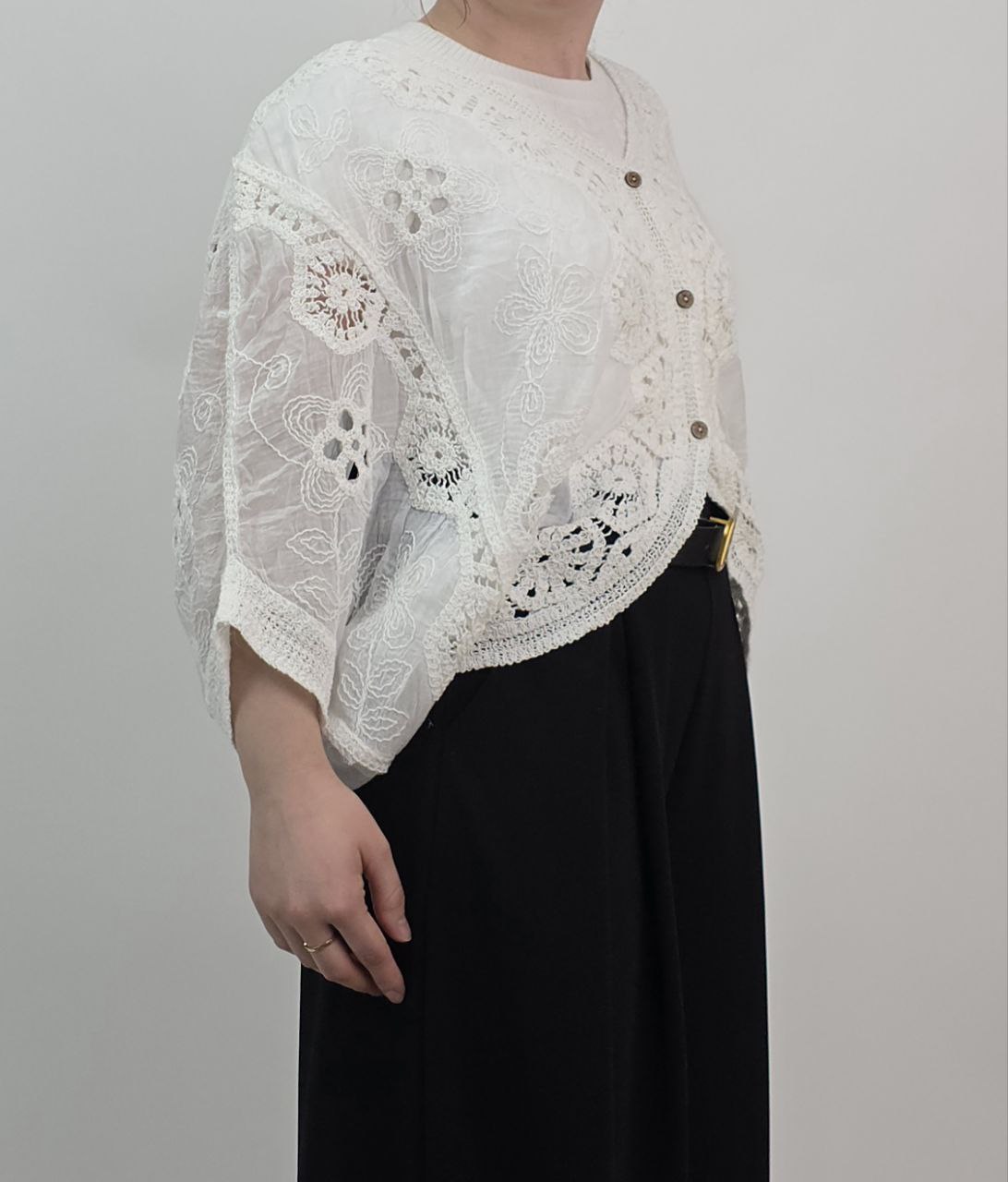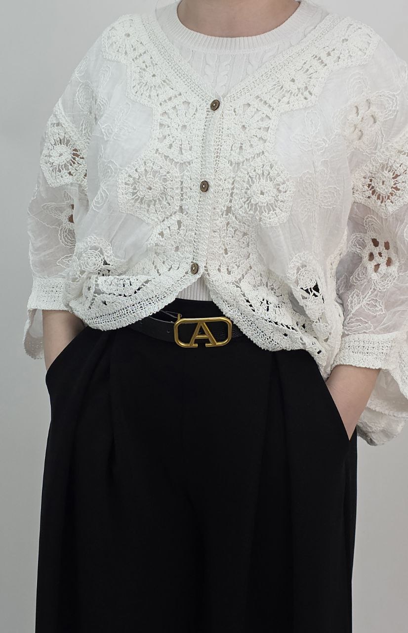 Kardigan damski wyróżnia się pięknymi haftami oraz ażurowymi detalami, które nadają mu lekkości i kobiecego charakteru. Co więcej, subtelne zdobienia tworzą efekt stylu boho i vintage.