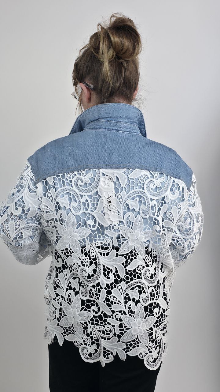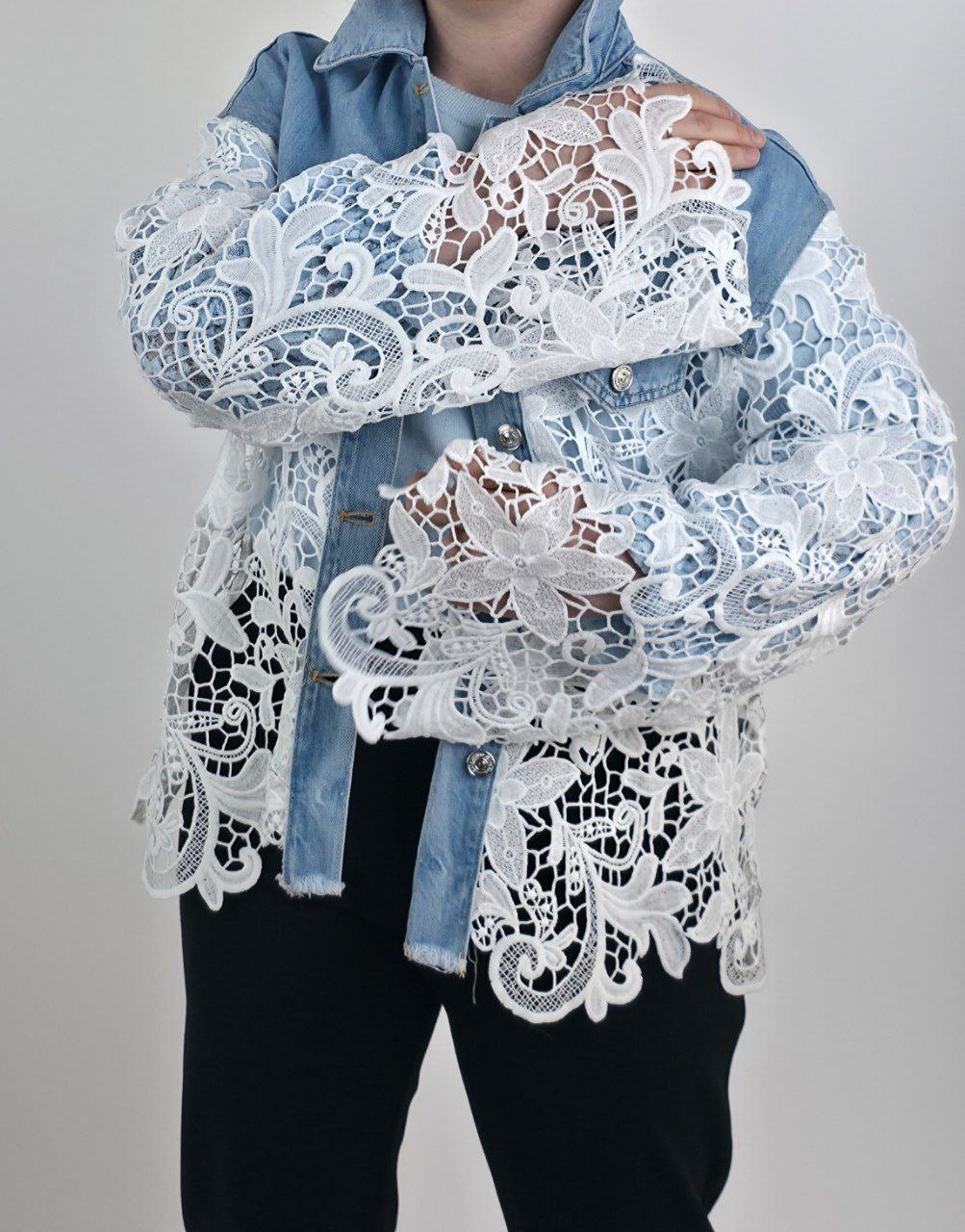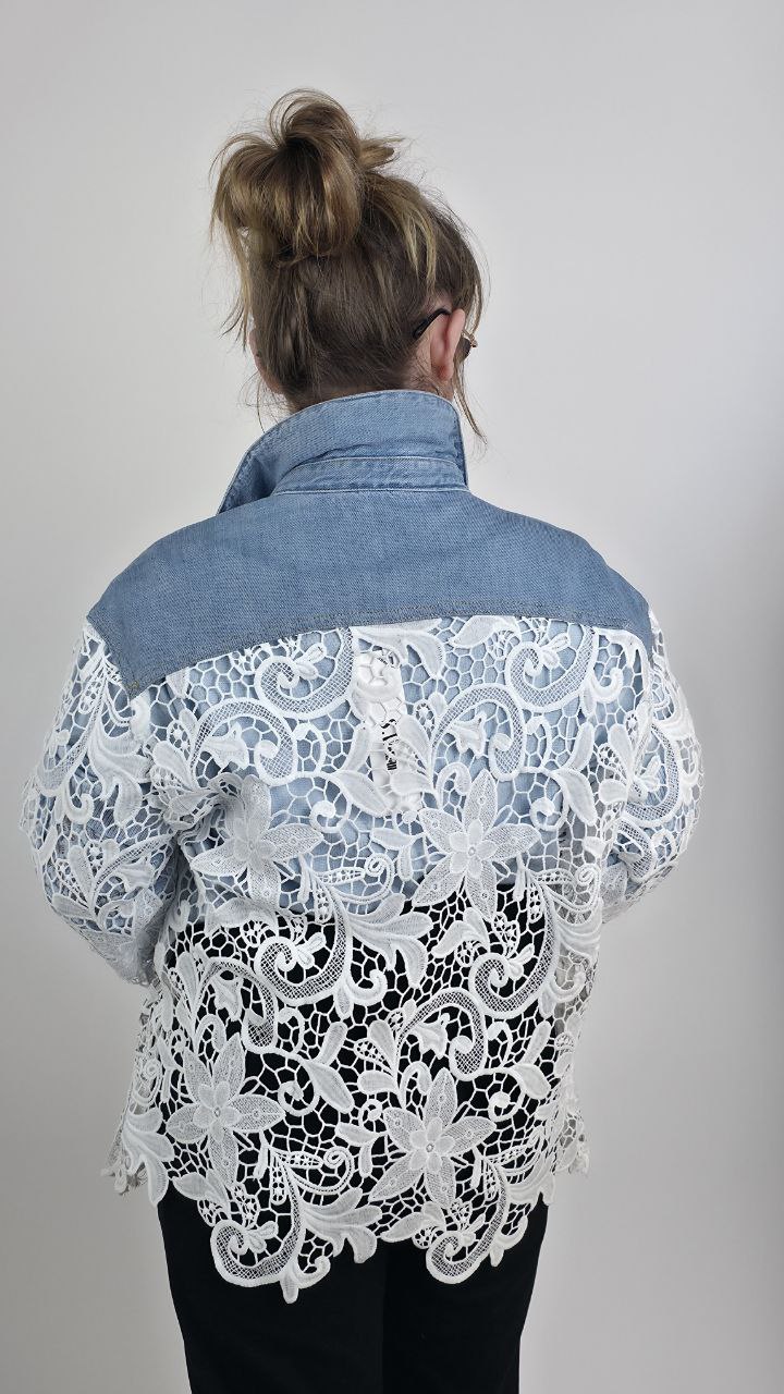 Spektakularne połączenie: Górna część wykonana z klasycznego jeansu idealnie kontrastuje z dołem oraz rękawami z bogato zdobionej, białej koronki o motywie kwiatowym.