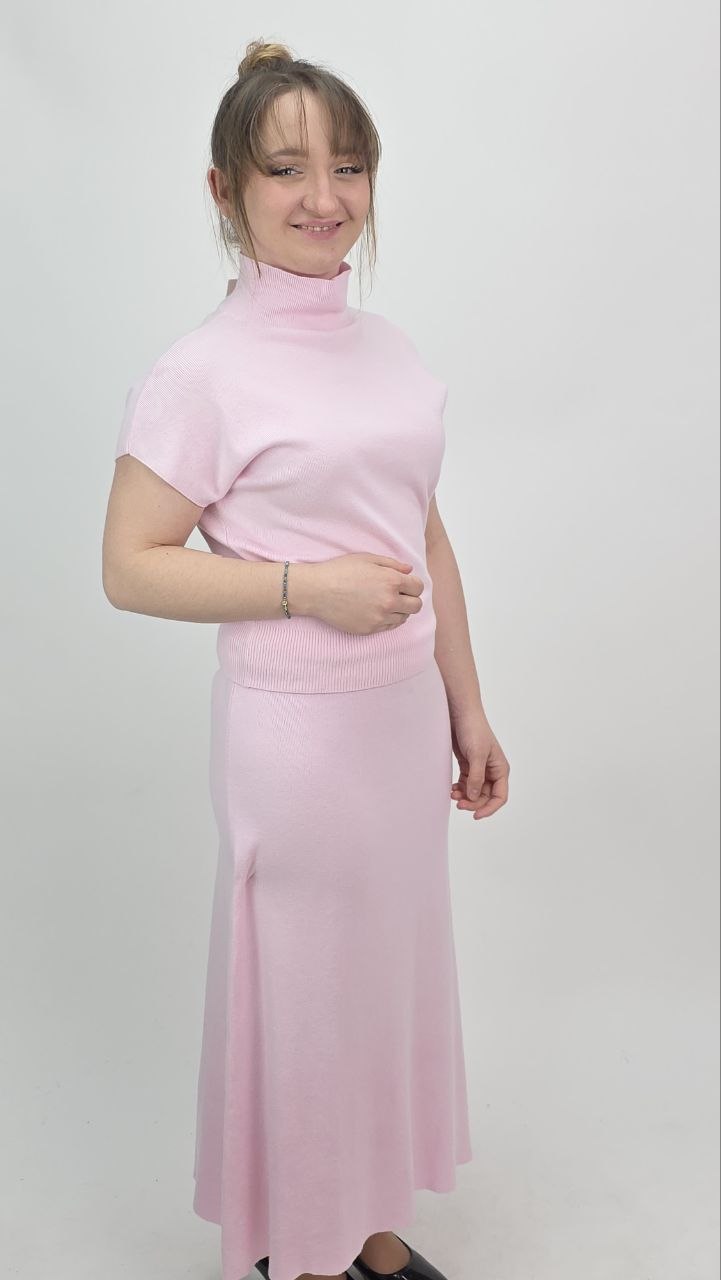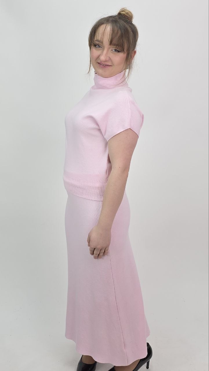 Stylowy komplet dzianinowy w subtelnym, pudrowym różu, który podkreśla kobiecość i dodaje lekkości każdej stylizacji.