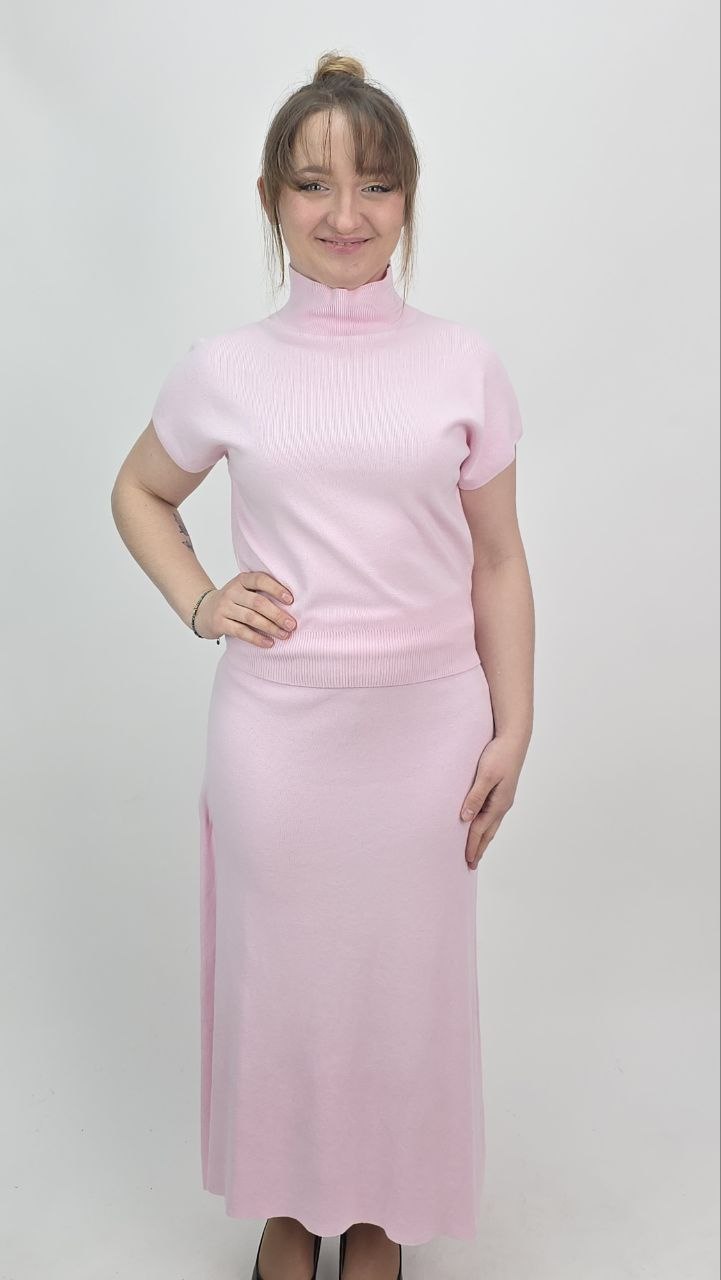 Bluzka ze stójką i krótkim rękawem tworzy elegancki, minimalistyczny look, a dopasowana spódnica midi pięknie modeluje sylwetkę. Elastyczna dzianina zapewnia komfort i swobodę noszenia.