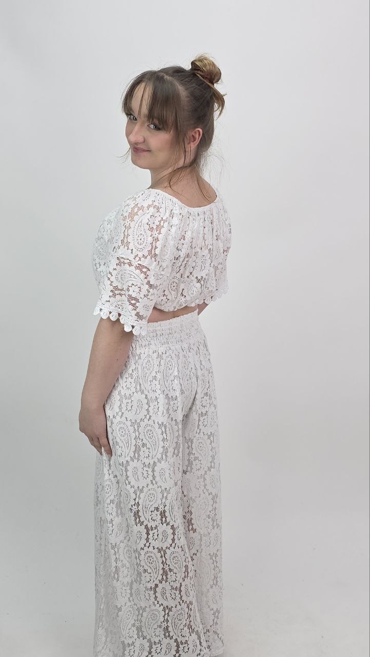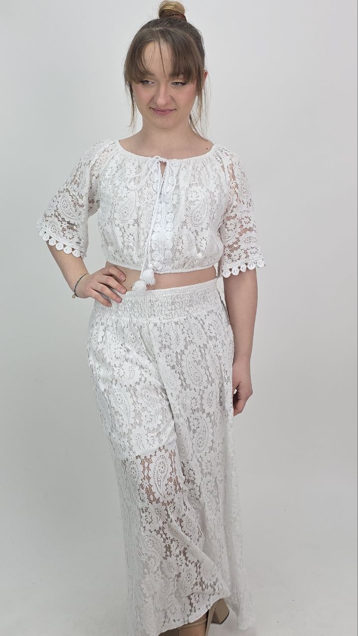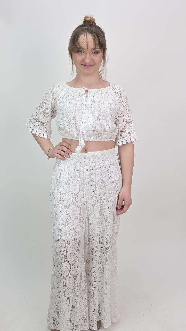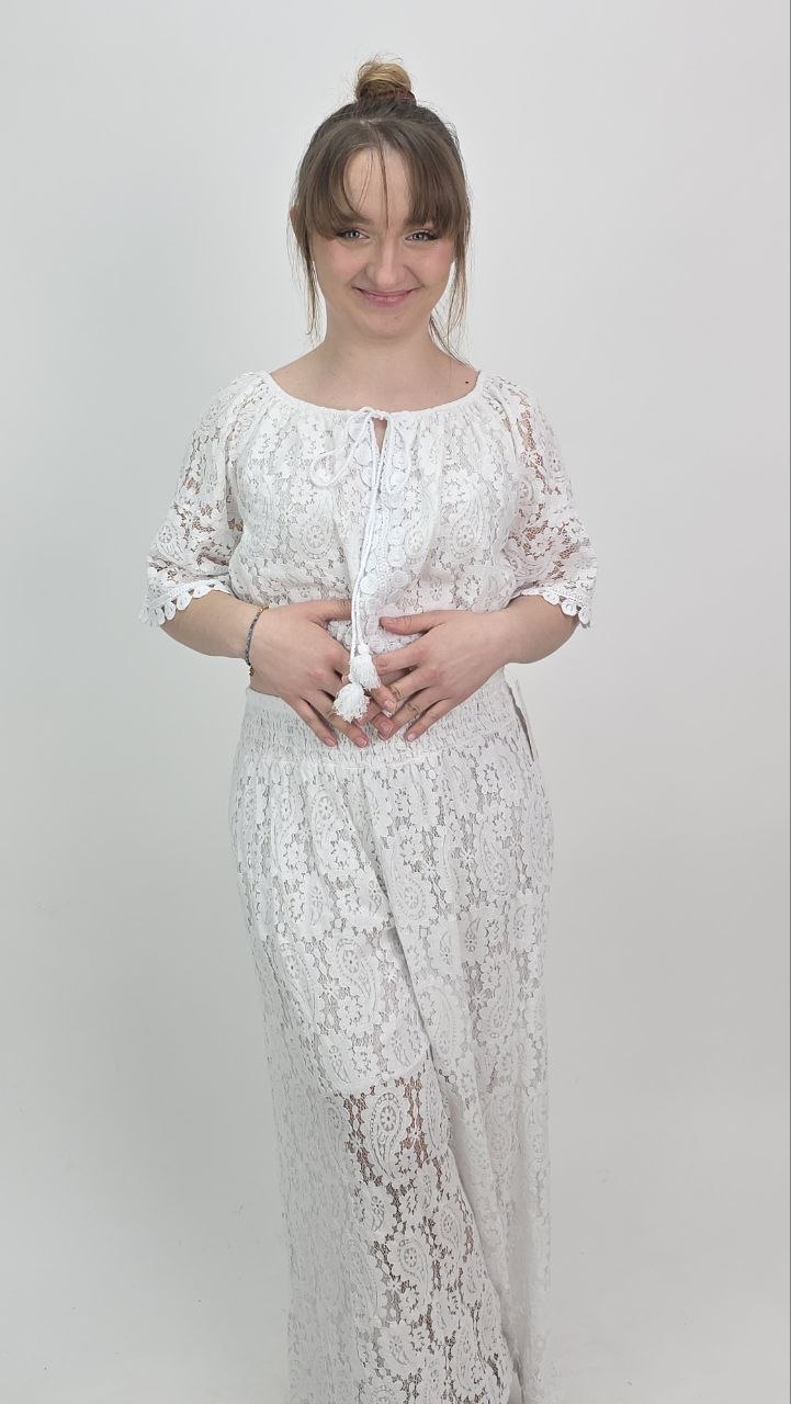 Zjawiskowy komplet koronkowy w odcieniu białym, który zachwyca lekkością, kobiecością i romantycznym charakterem. Idealna propozycja na lato — stylowa, wygodna i niezwykle efektowna.