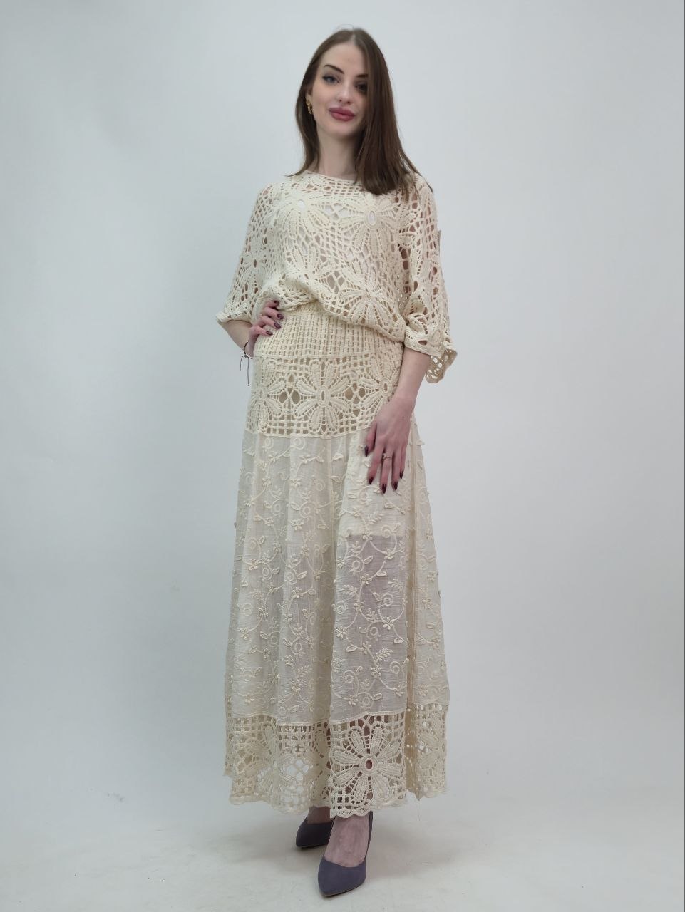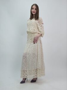 Ten komplet damski w odcieniu ecru zachwyca delikatnością oraz eleganckim wykończeniem. Już na pierwszy rzut oka przyciąga uwagę wyjątkowa koronka, która nadaje stylizacji luksusowego charakteru.