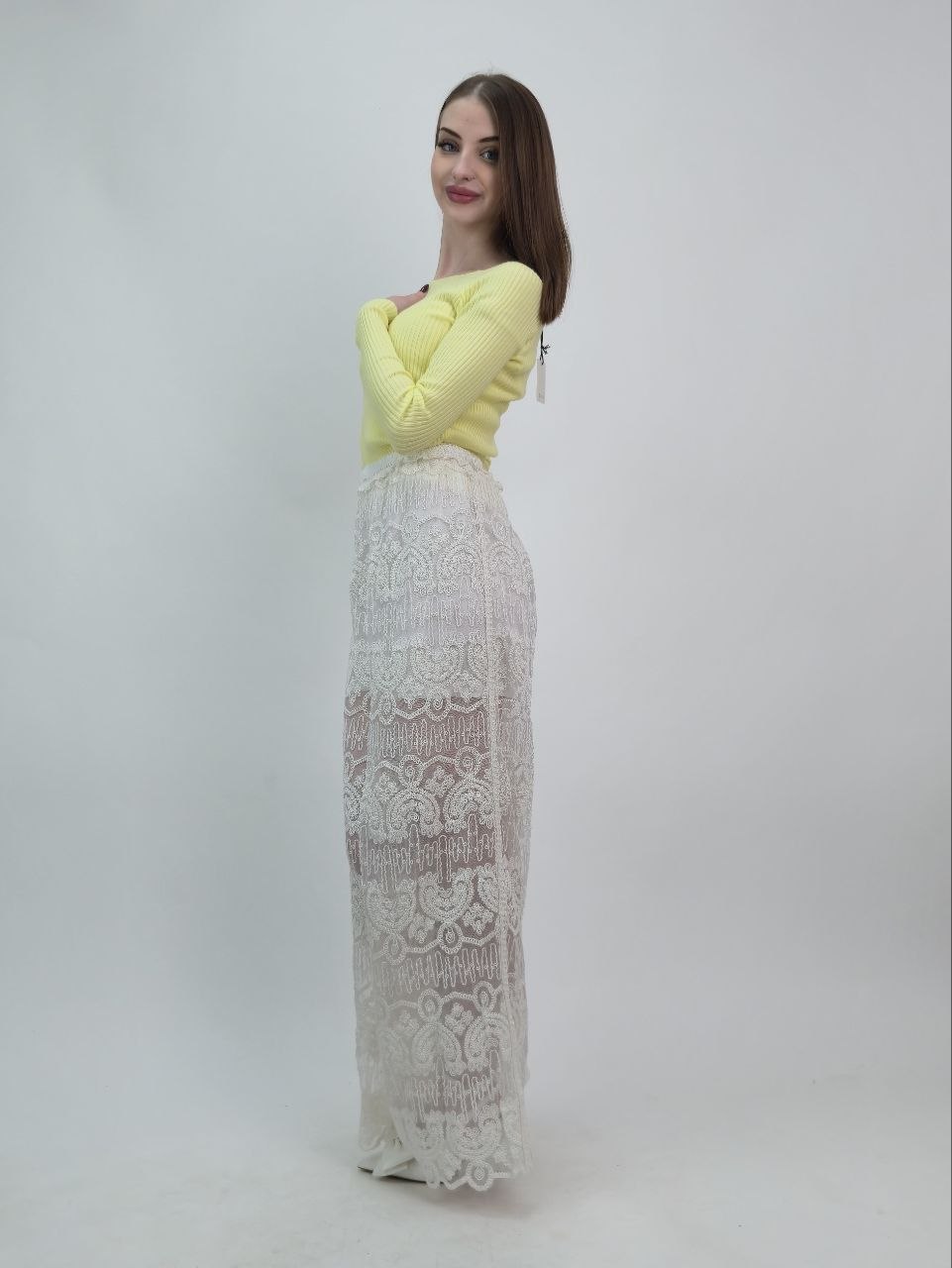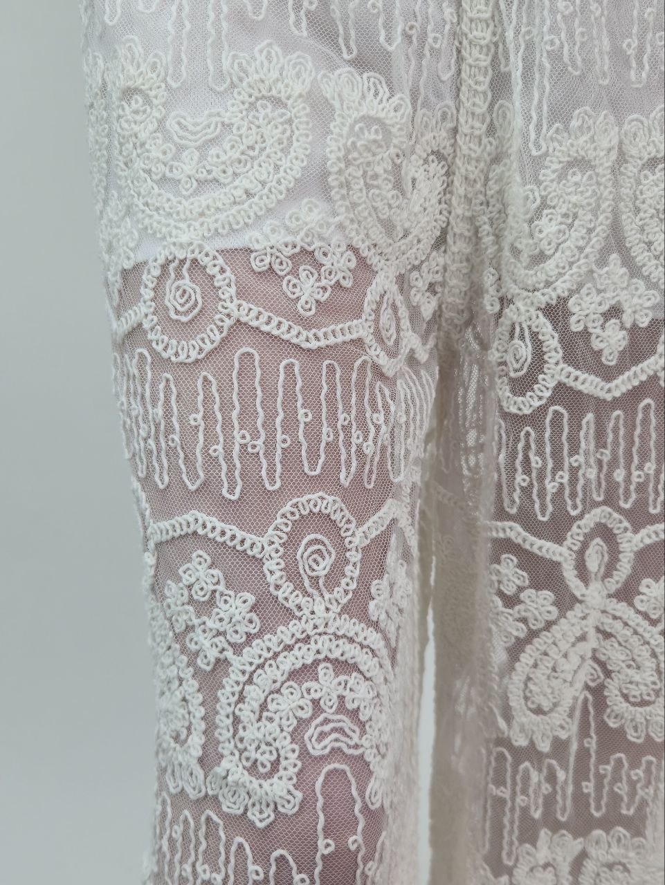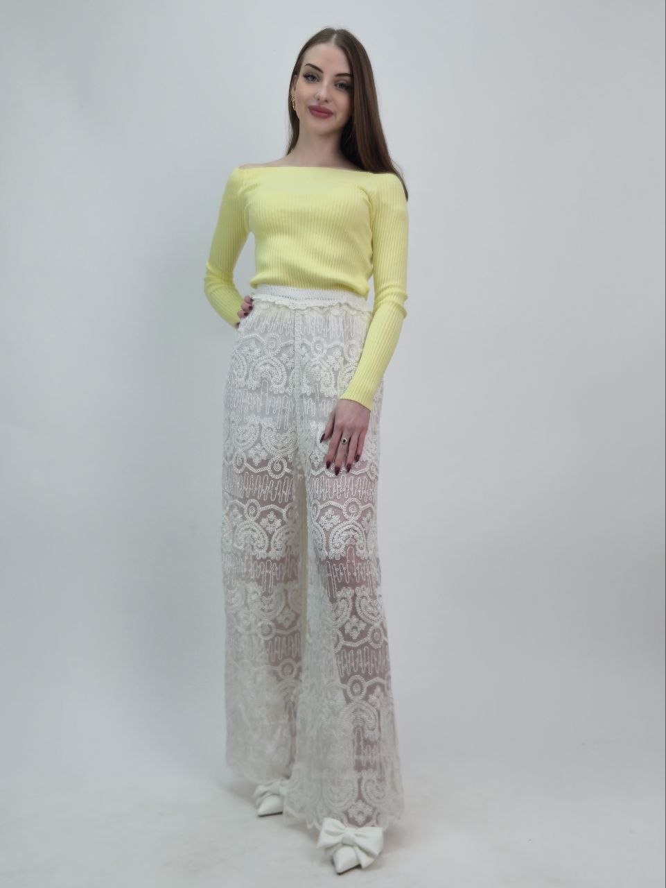 Ażurowy charakter tkaniny subtelnie odsłania nogi, dzięki czemu stylizacja nabiera lekkości i kobiecego wyrazu. Jednocześnie całość zachowuje klasę i ponadczasowy styl.