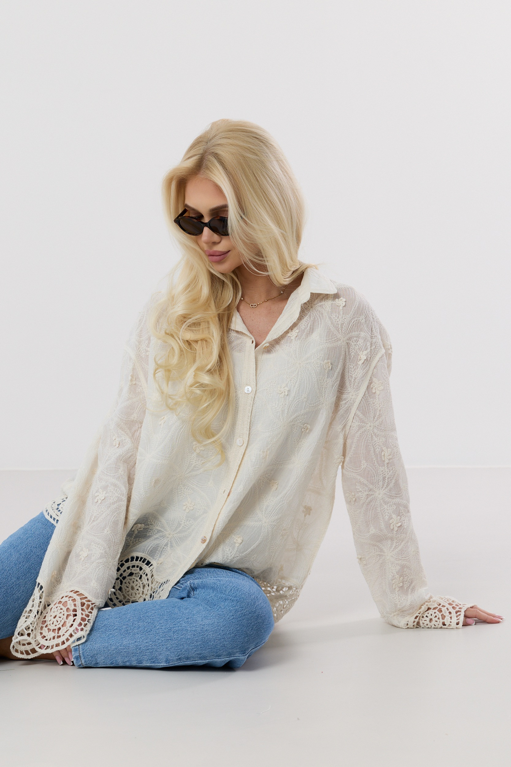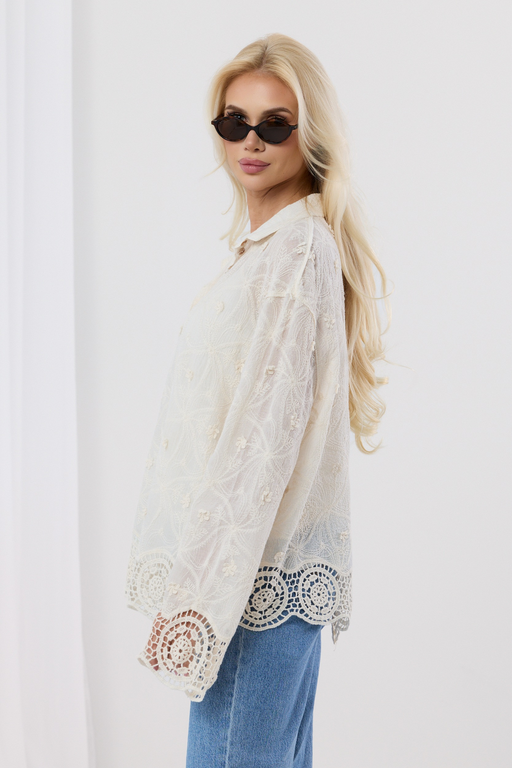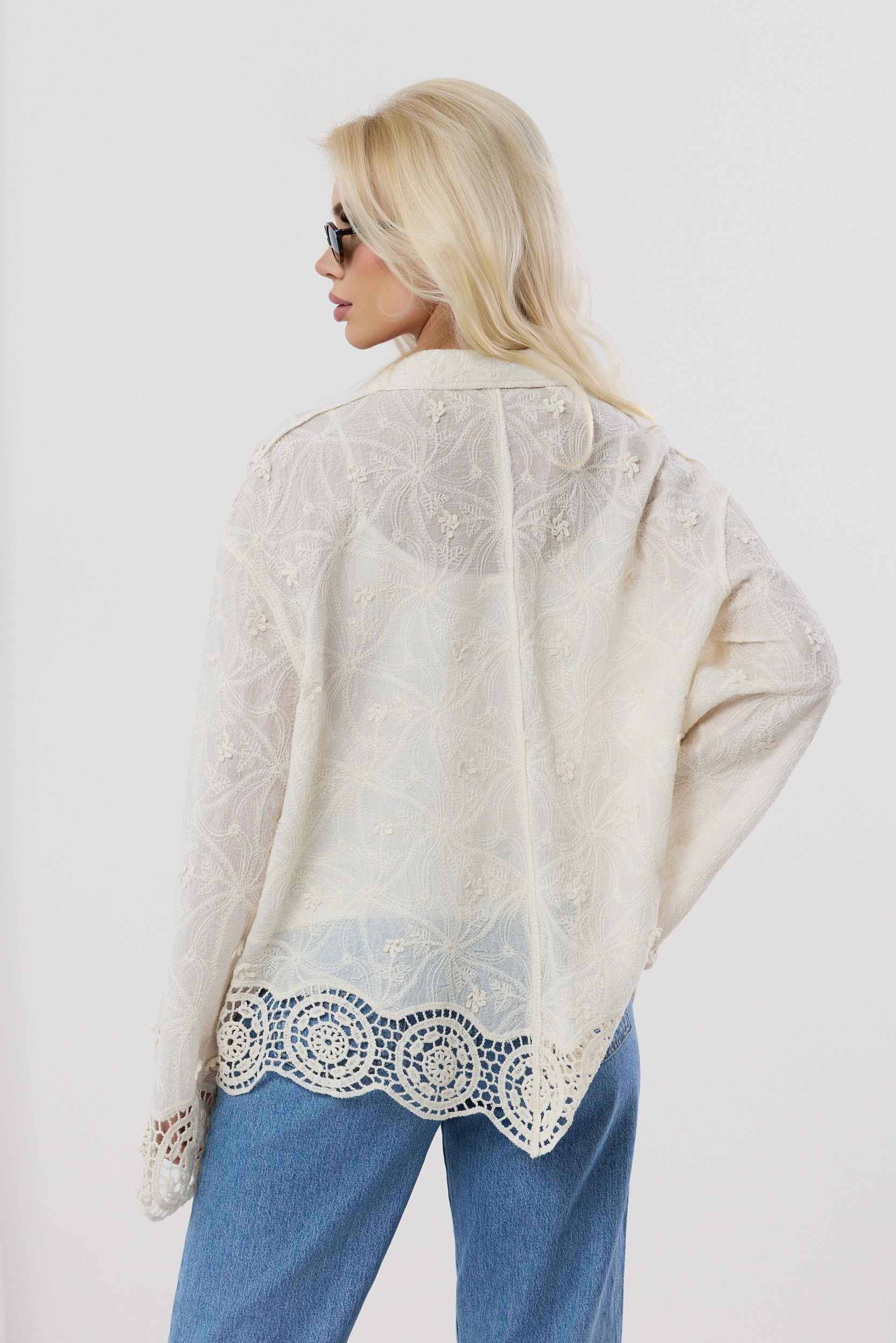 Wyjątkowa koszula w kolorze kremowym o swobodnym kroju, która przyciąga uwagę bogatymi zdobieniami i lekką, zwiewną formą. Wykonana z delikatnie transparentnego materiału, w całości pokryta subtelnym haftem o motywach roślinnych, tworzy efekt eleganckiej, ażurowej struktury.