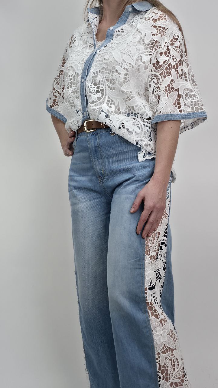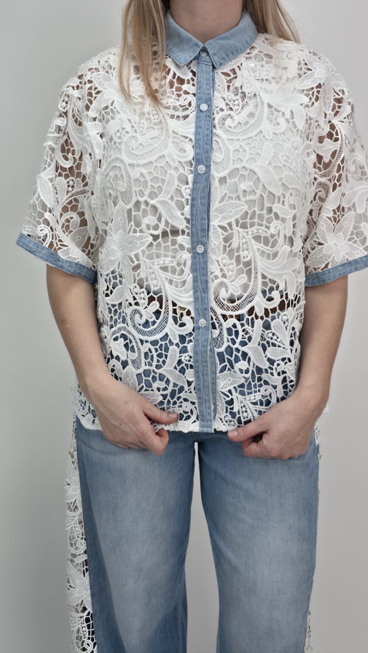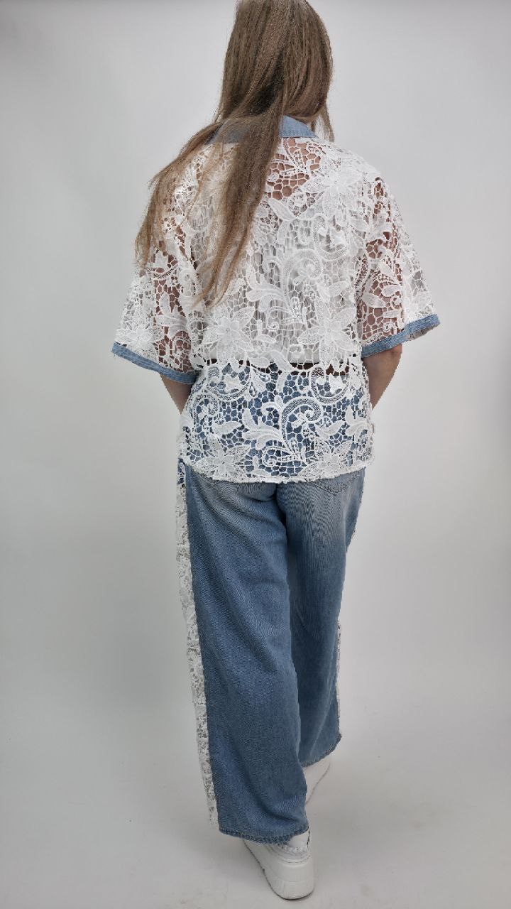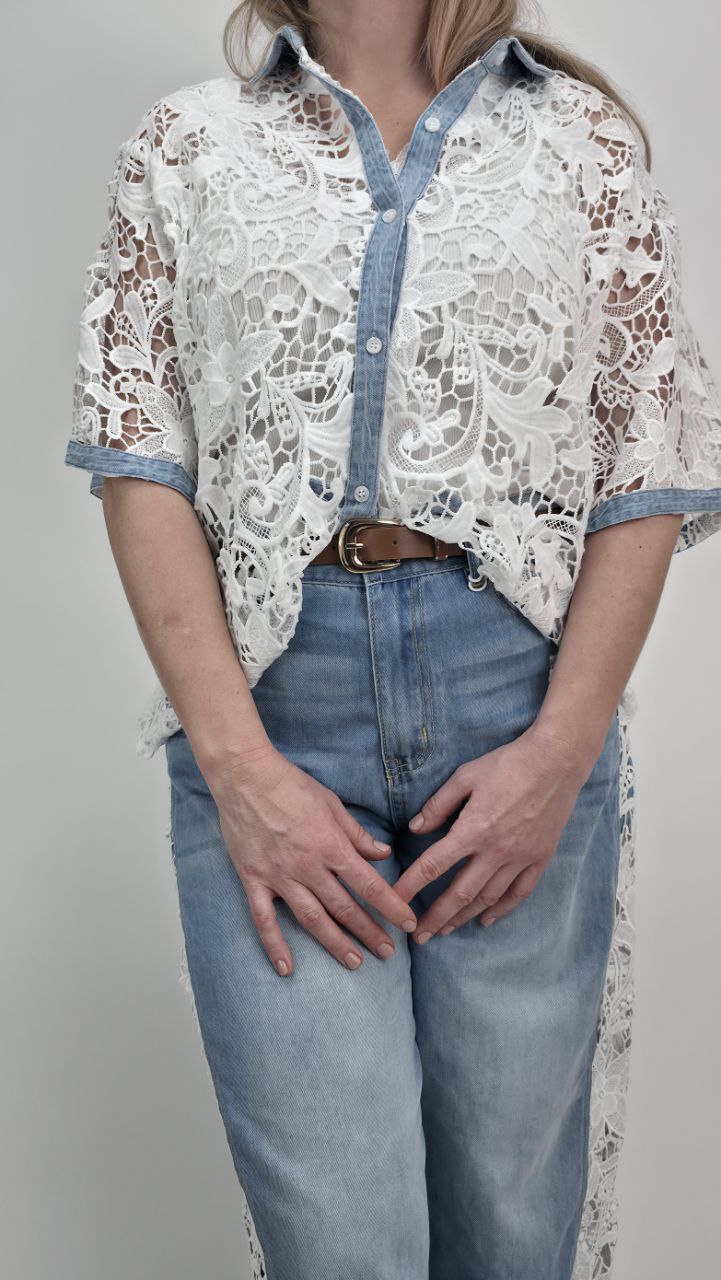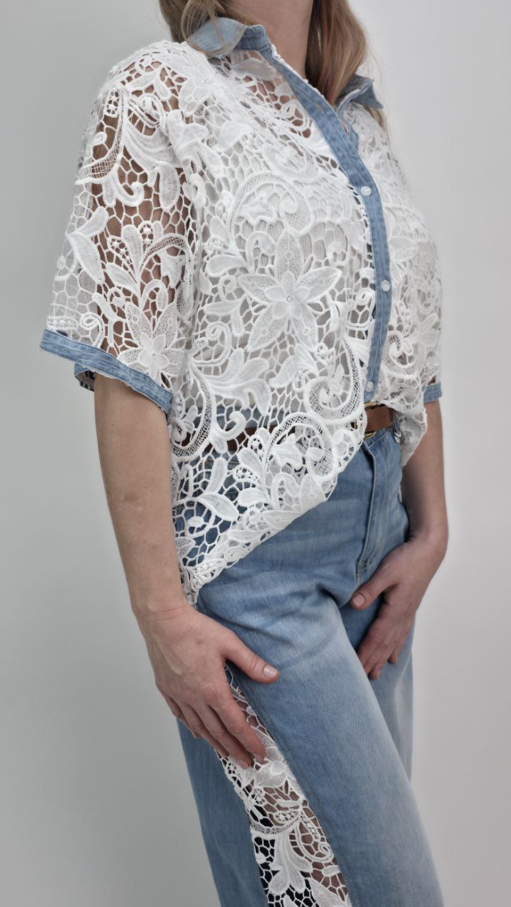 Całość została stylowo połączona z elementami jasnego denimu – kołnierzykiem, listwą guzikową oraz wykończeniem rękawów, co tworzy oryginalny kontrast pomiędzy delikatną koronką a casualowym stylem jeansu. Dzięki temu koszula prezentuje się bardzo nowocześnie i przyciąga uwagę.