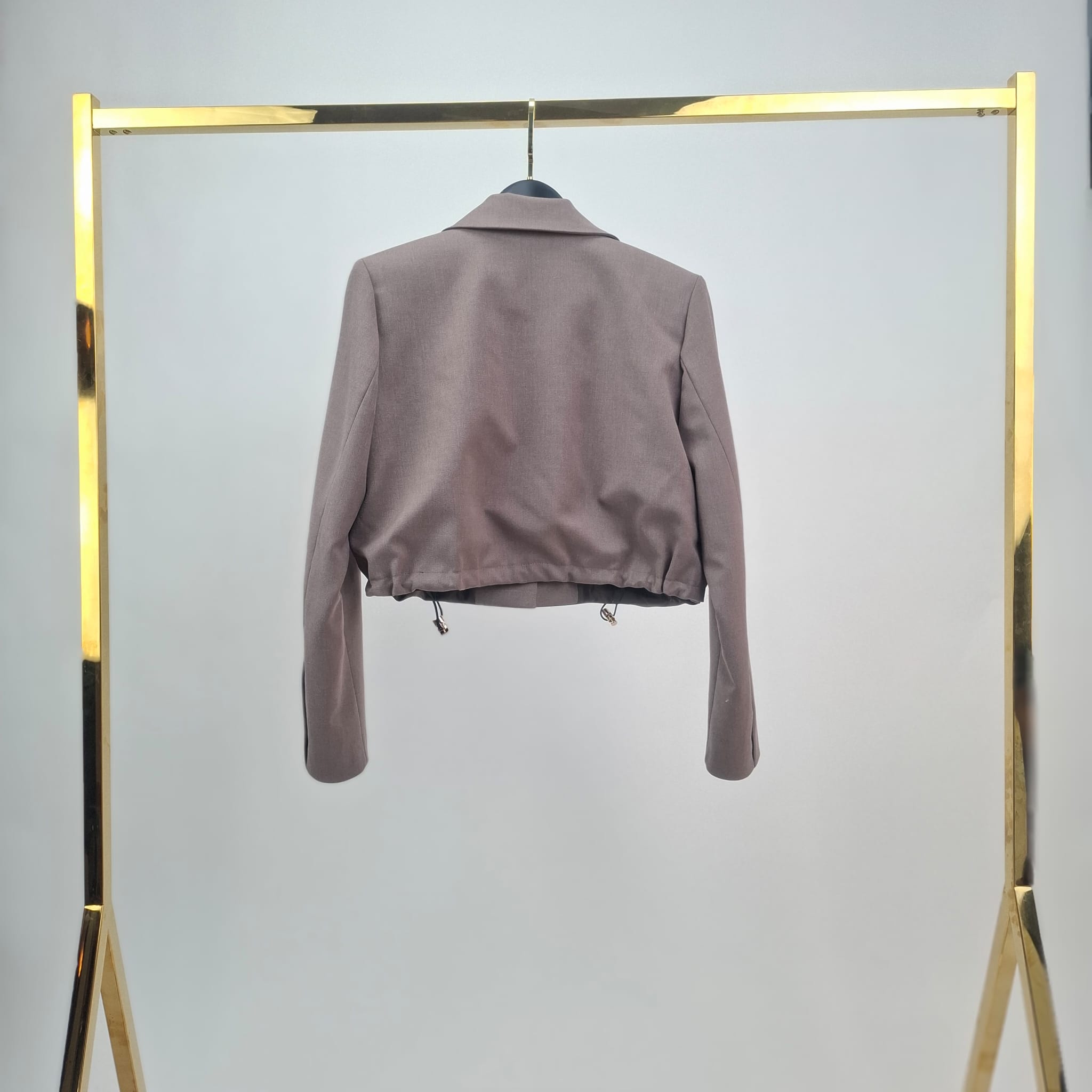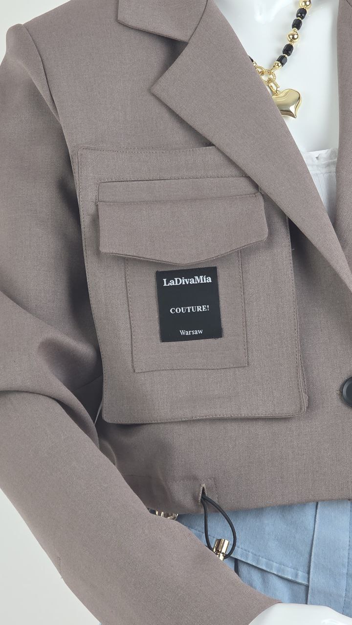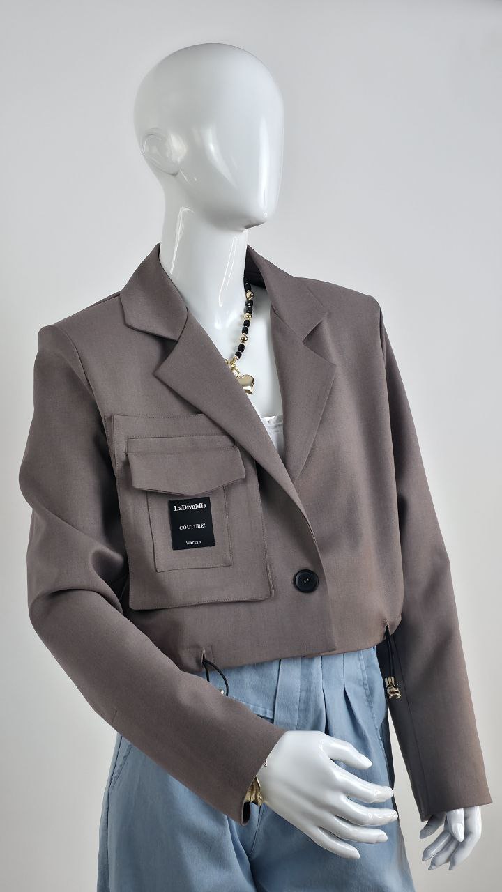 Nowatorski Fason: Krótka forma żakietu została przełamana regulowanym marszczeniem u dołu, co pozwala na indywidualne dopasowanie szerokości i nadanie sylwetce pożądanych proporcji.
