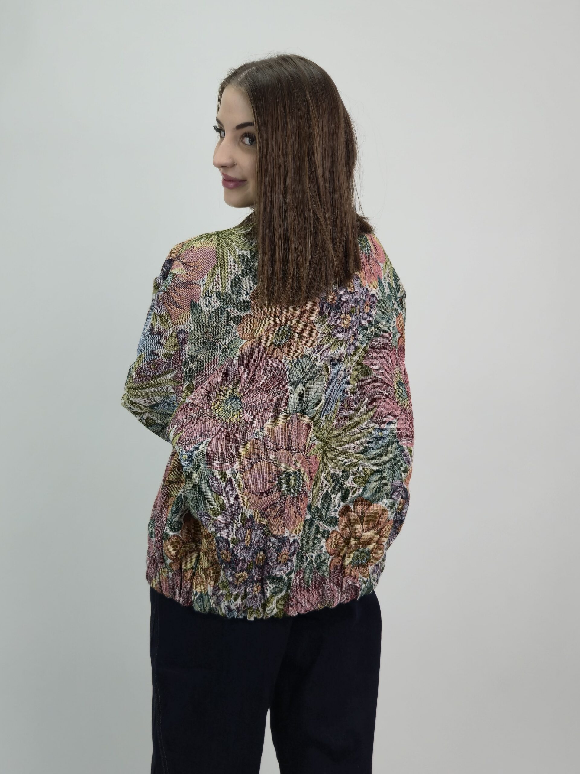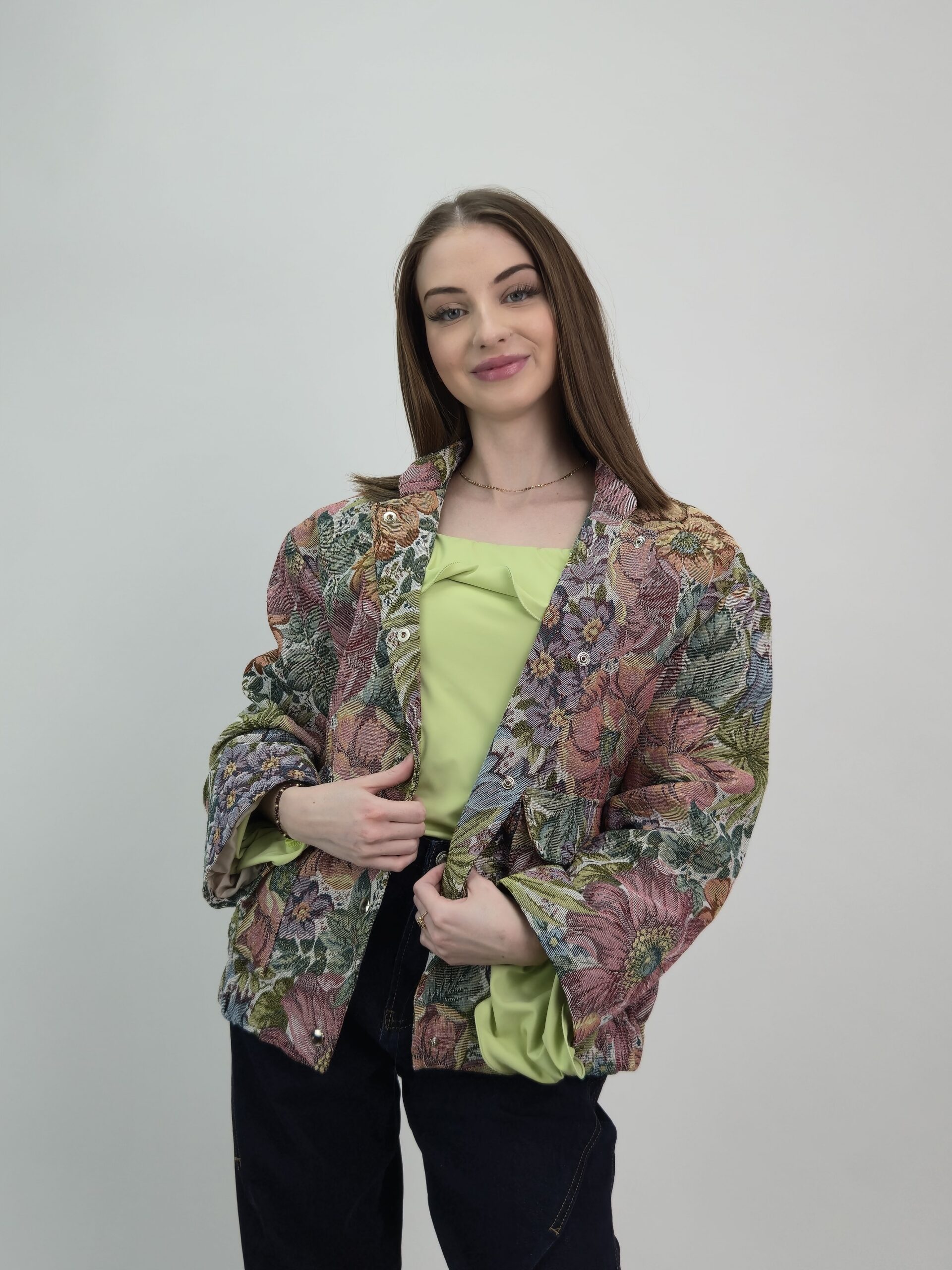 Wyjątkowa kurtka w stylu ramoneski wykonana z efektownej tkaniny żakardowej o artystycznym, kwiatowym wzorze. Model przyciąga spojrzenia subtelną paletą barw i szlachetną strukturą materiału, która nadaje stylizacji luksusowego charakteru. Fason lekko oversize zapewnia swobodę ruchu i modny, nonszalancki efekt, a praktyczne kieszenie po bokach dodają funkcjonalności. Całość wykończona jest podszewką, dzięki czemu kurtka pięknie układa się na sylwetce i komfortowo się nosi. To idealna propozycja dla kobiet, które lubią wyróżniać się eleganckim detalem i niebanalnym designem.