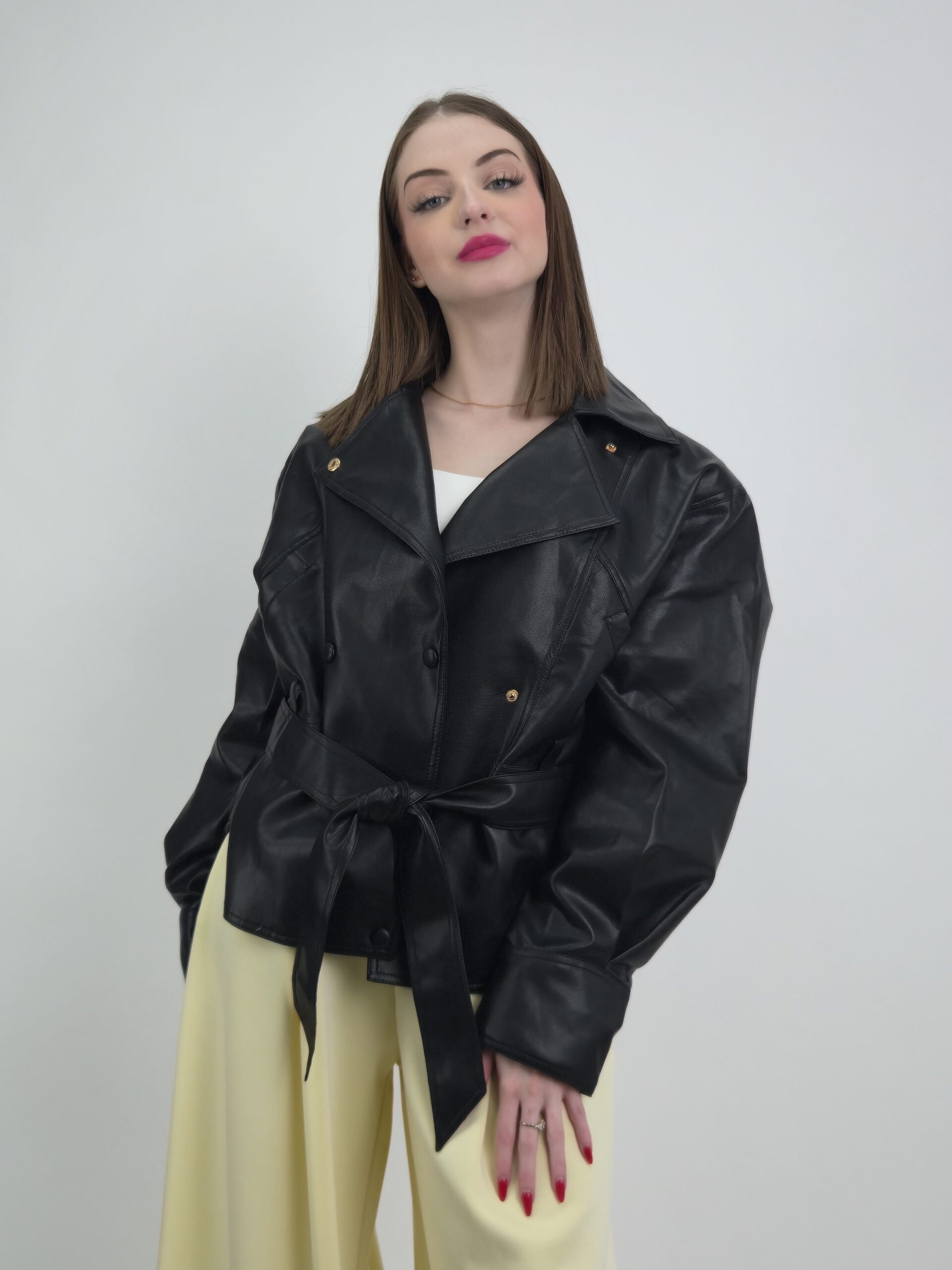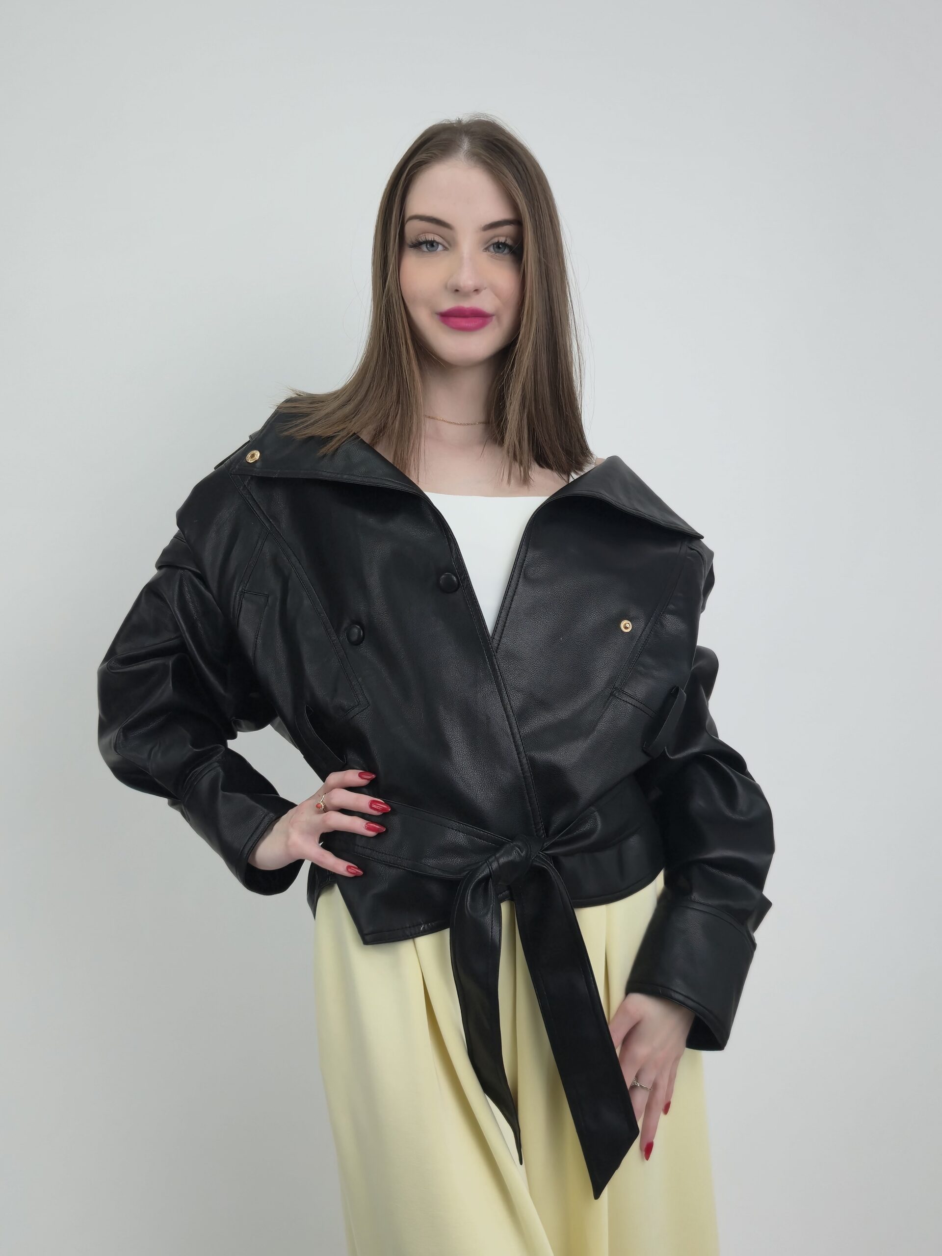 Ta czarna kurtka damska z eko skóry łączy minimalistyczny design z wyrazistymi detalami. Klasyczny kolor sprawia, że model pasuje do wielu stylizacji, a jednocześnie podkreśla elegancki charakter.