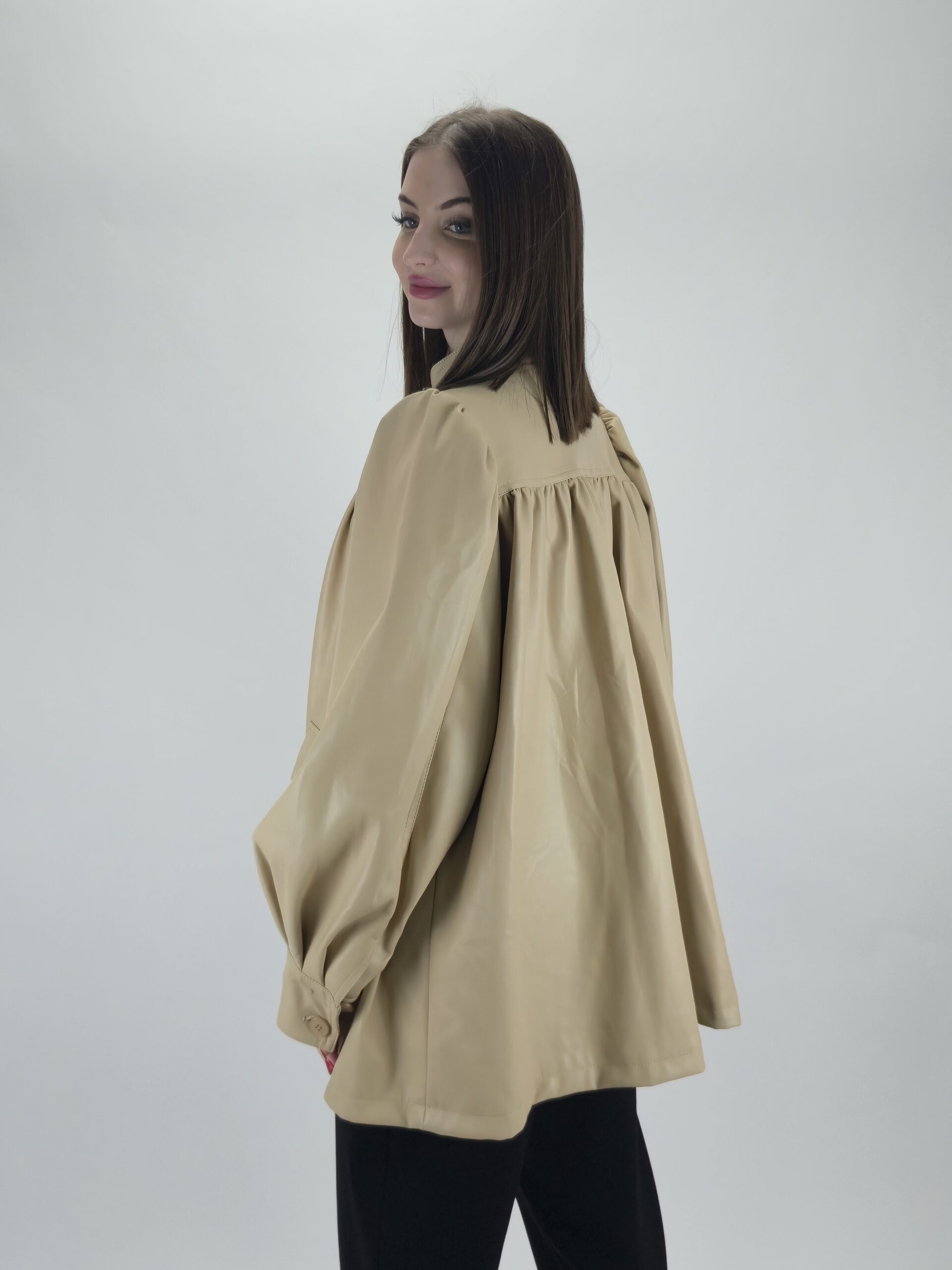 Kurtka posiada rękawy o kroju typu bufka, które dodają stylizacji nowoczesności. Wykończenie mankietami nadaje elegancji i porządkuje całość.