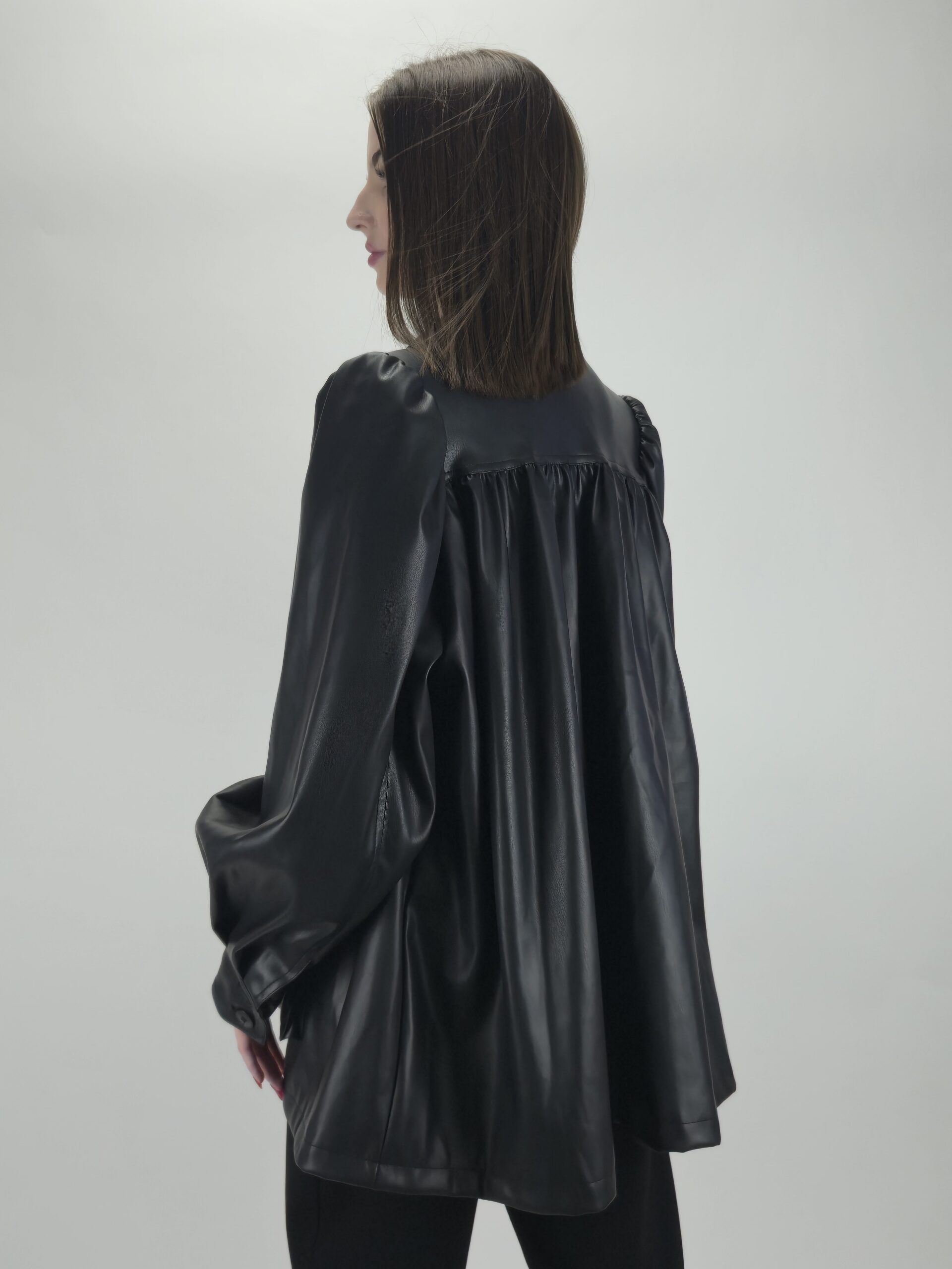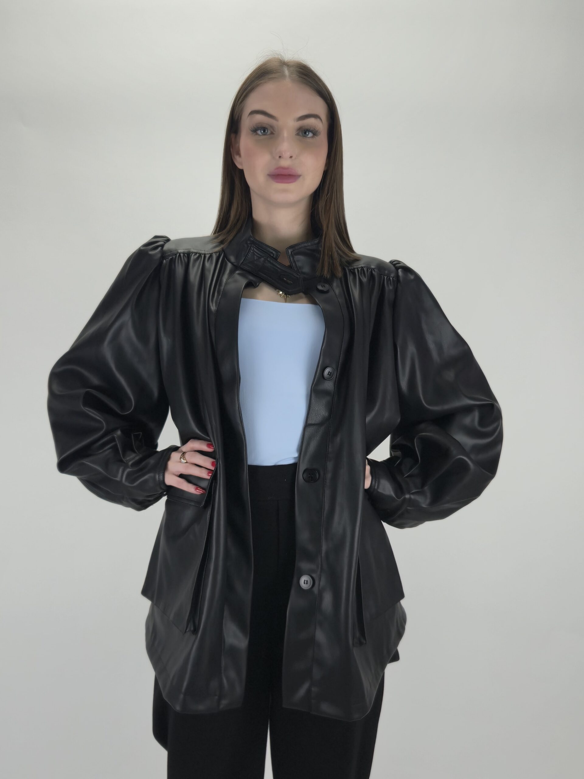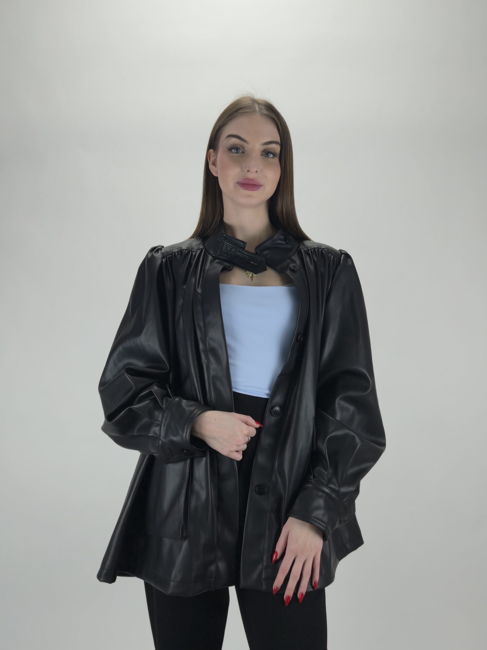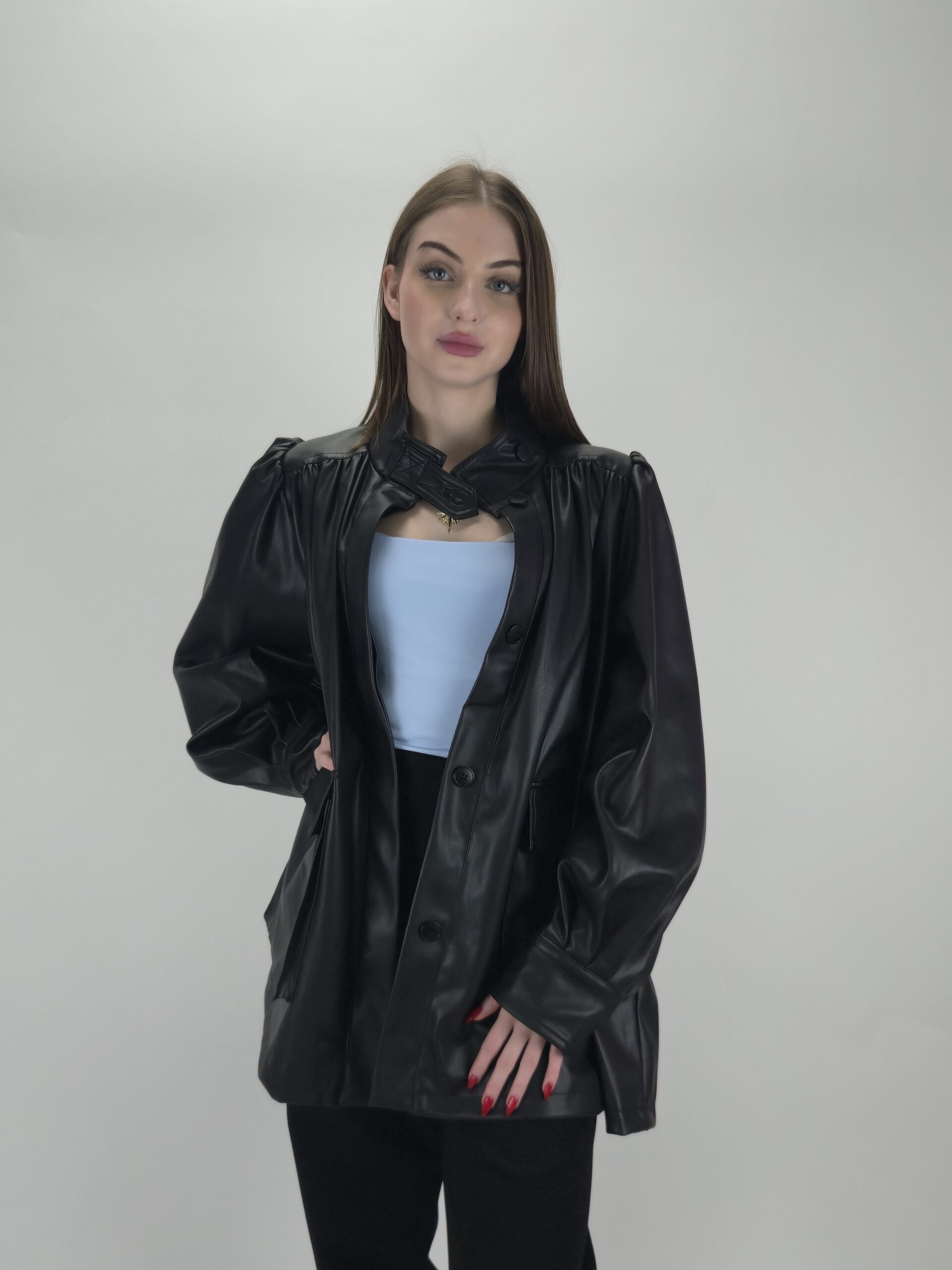Ta czarna kurtka damska z eko skóry łączy klasyczny styl z nowoczesnymi detalami. Ponadczasowy kolor sprawia, że model pasuje do wielu stylizacji, a jednocześnie zachowuje elegancki i wyrazisty charakter.
