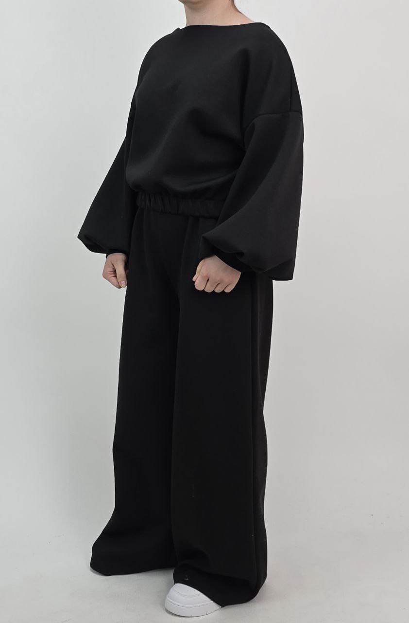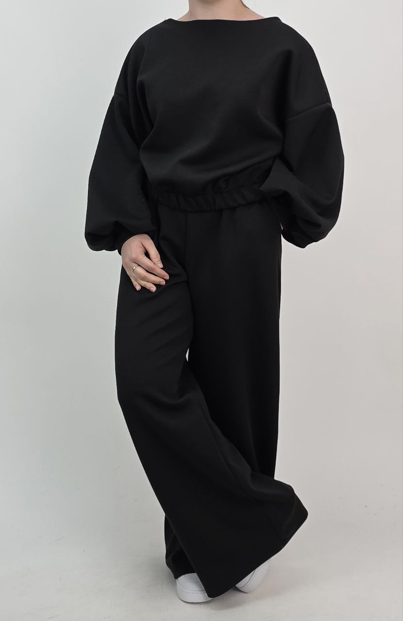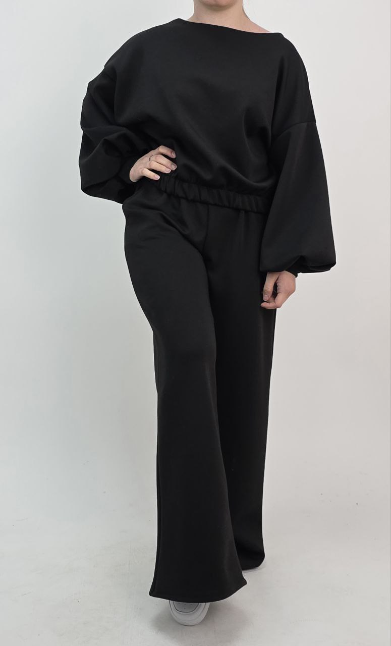 Przedstawiamy Państwu absolutny synonim komfortu w luksusowym wydaniu. Ten czarny komplet dresowy został wykonany z materiału o „masełkowej” strukturze, która jest niezwykle miękka i aksamitna. To nasza propozycja dla kobiet ceniących nowoczesne formy – teraz dostępna jako wyjątkowy HIT CENOWY! 🕊️✨