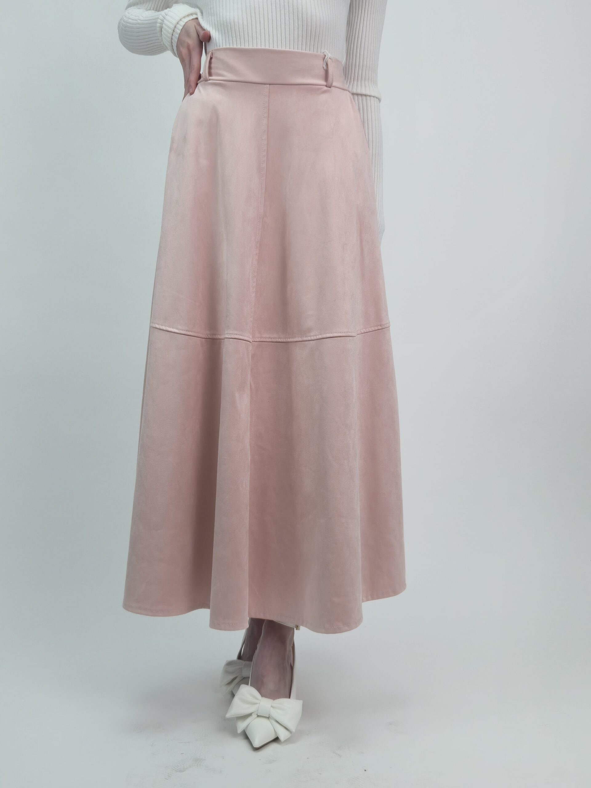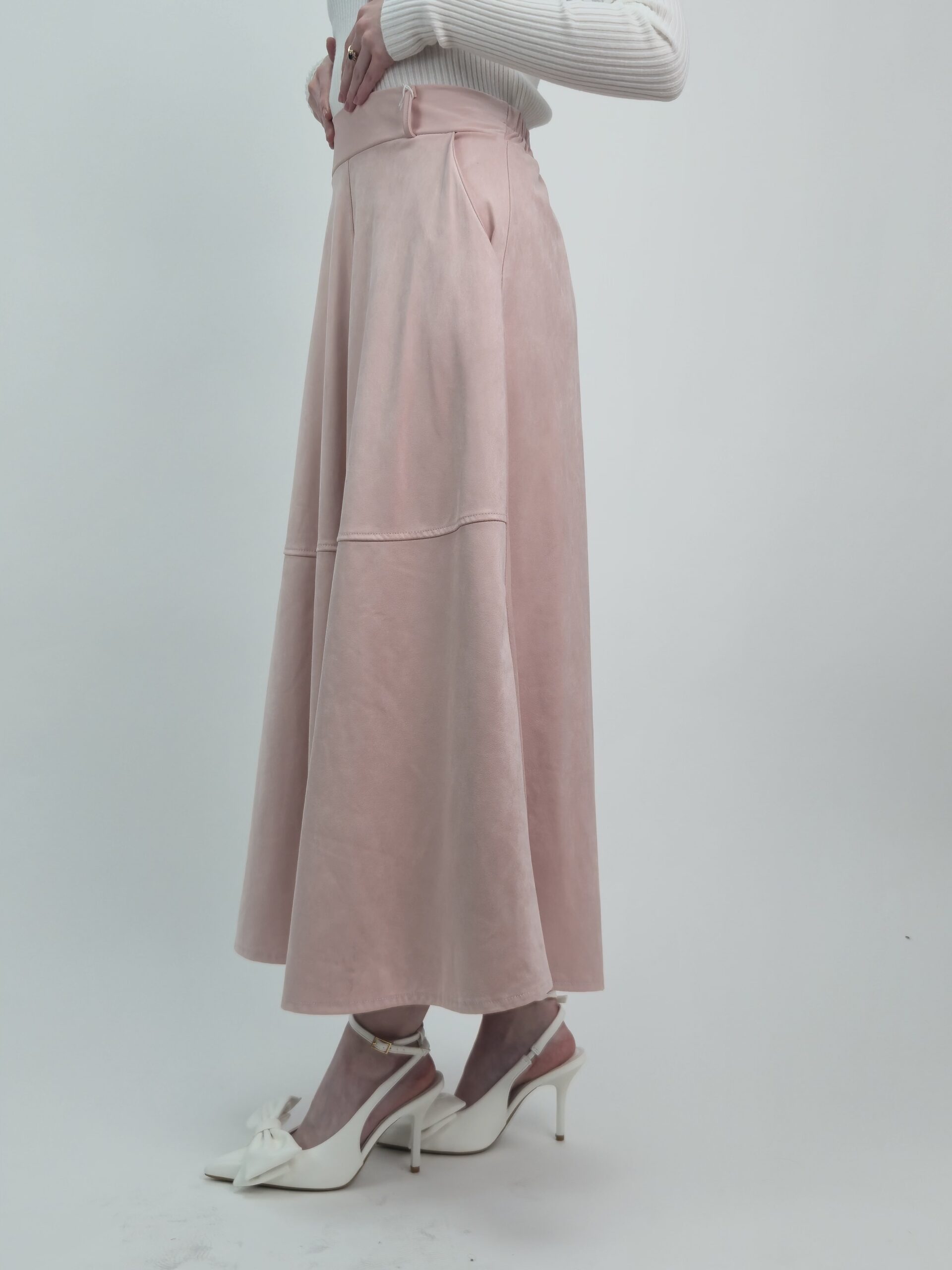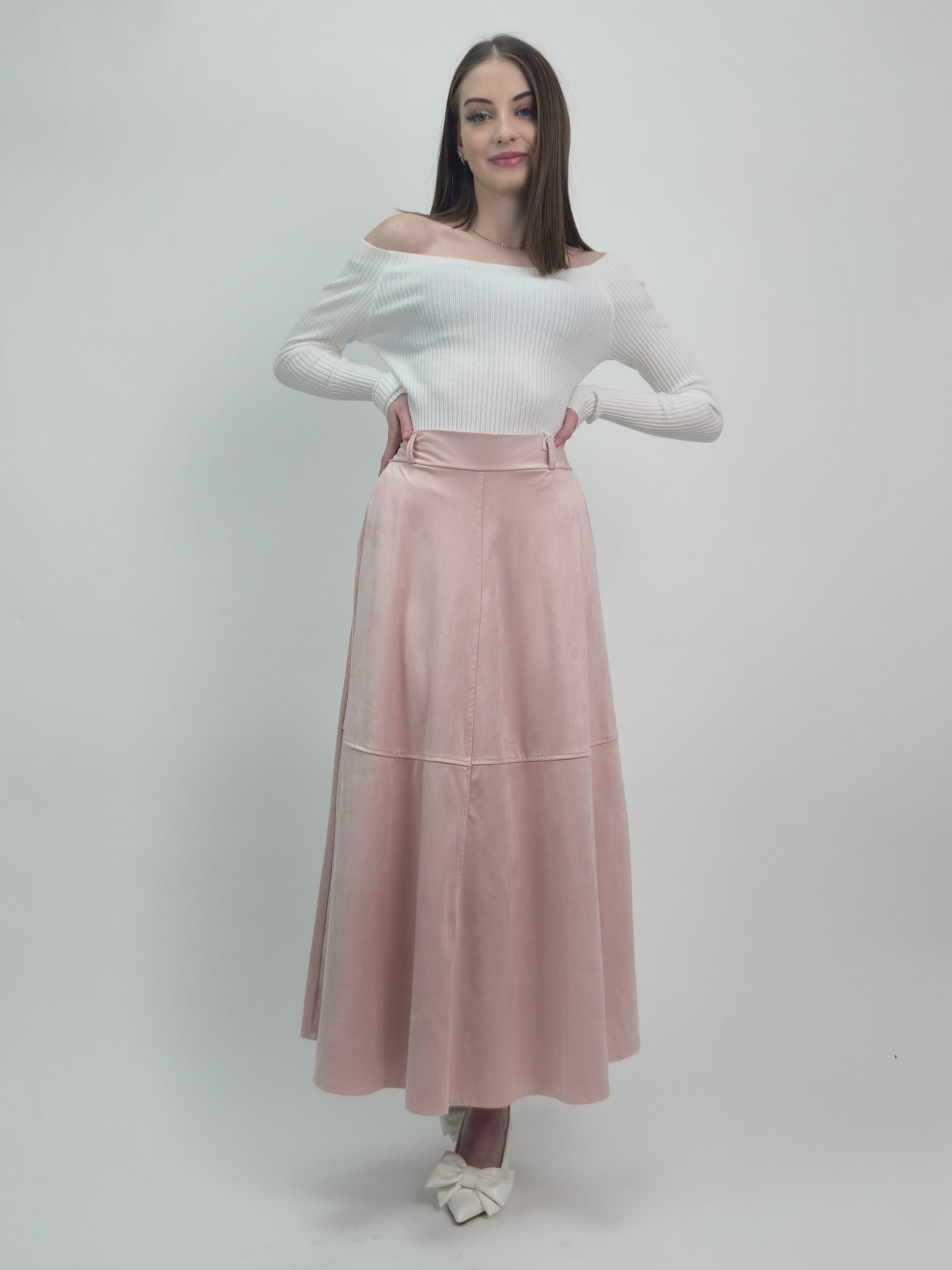 Subtelna, kobieca i niezwykle elegancka — ta spódnica midi z miękkiego e-zamszu zachwyca delikatnym odcieniem pudrowego różu oraz pięknie układającą się, rozkloszowaną linią. Materiał jest aksamitny w dotyku, lekko matowy i prezentuje się bardzo luksusowo, nadając stylizacji wyjątkowej klasy.