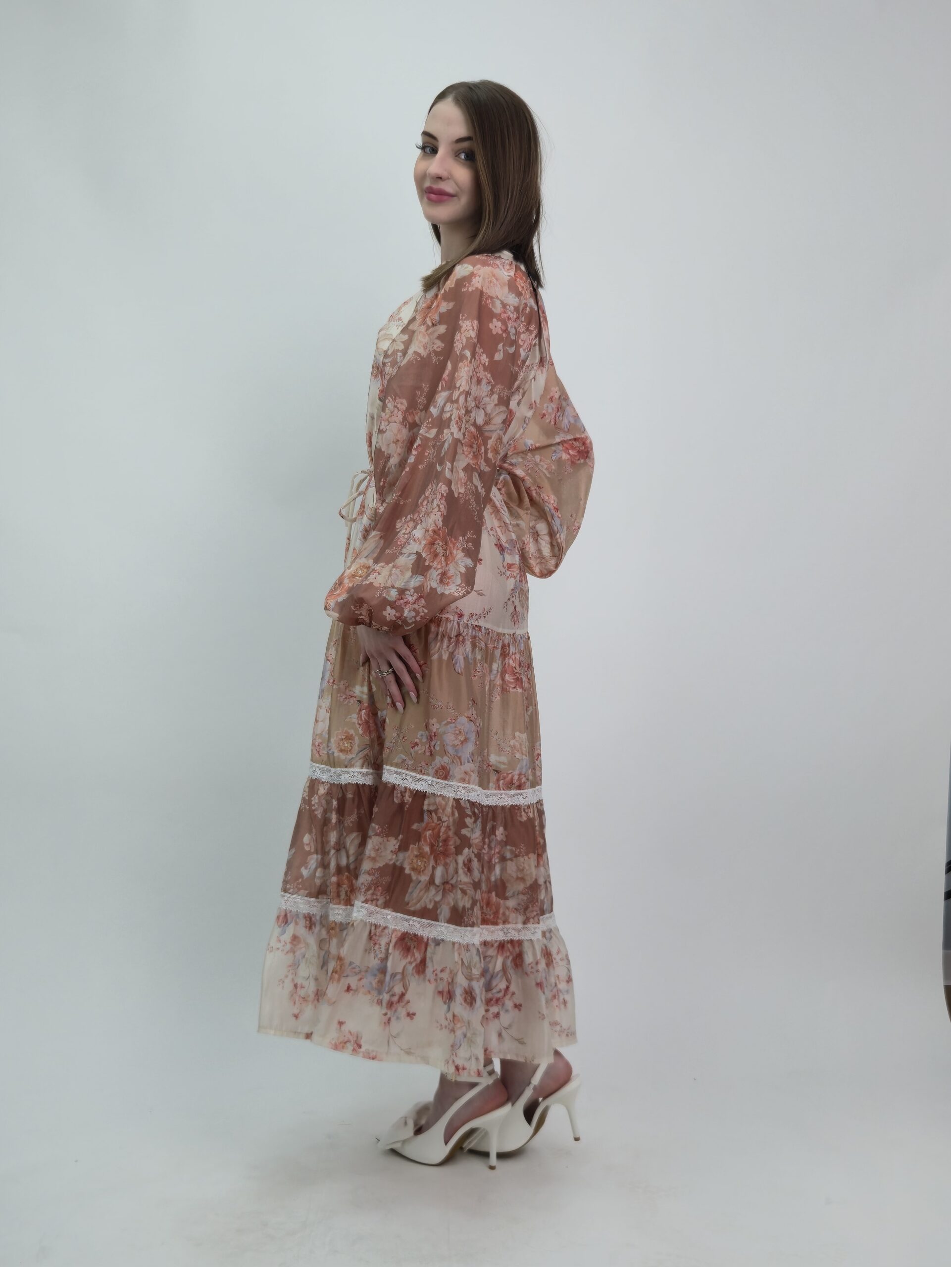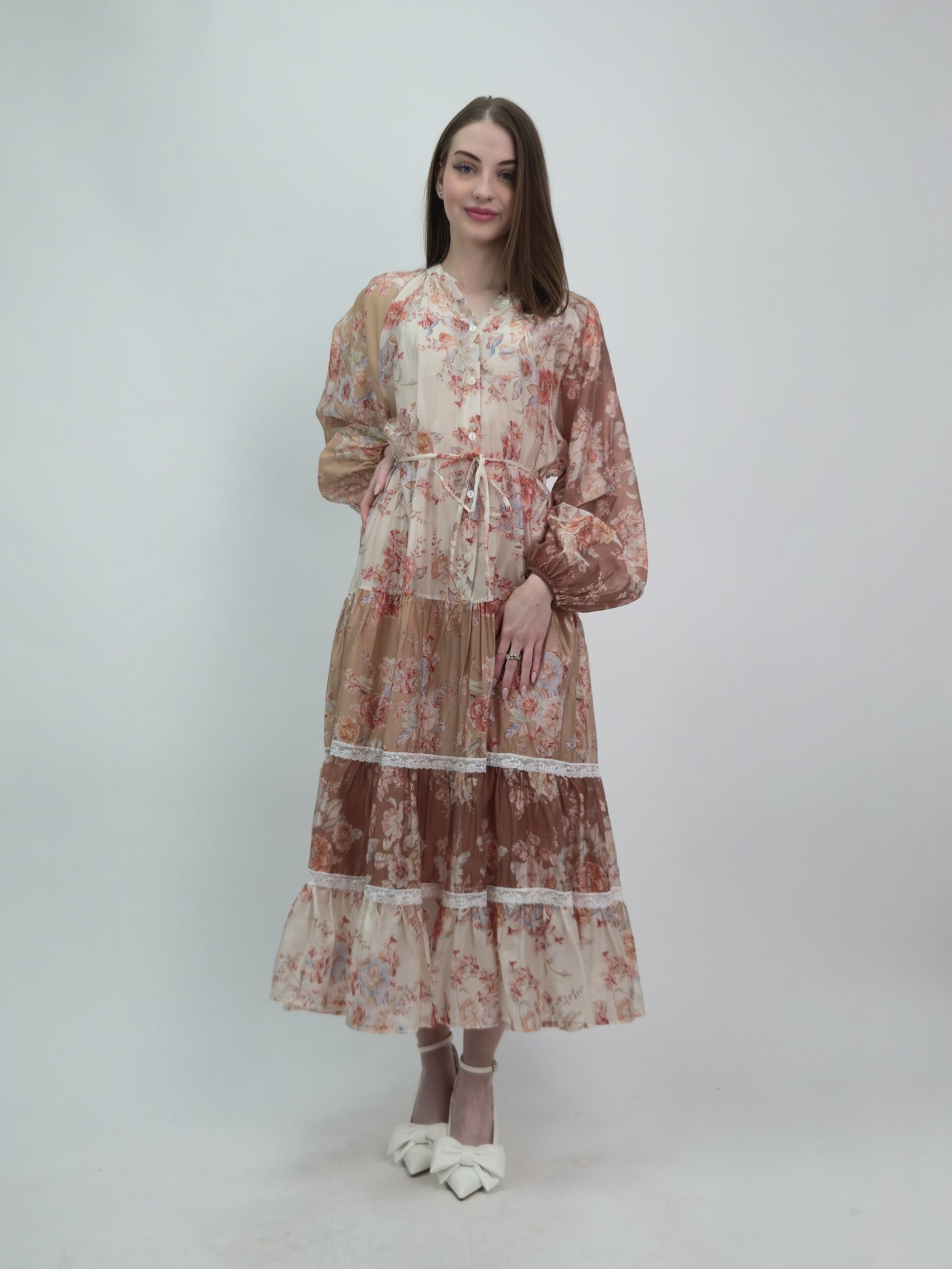 Dół sukienki został ozdobiony efektownymi falbankami przetykanymi delikatną koronką, które dodają całości romantycznego uroku oraz sprawiają, że model pięknie porusza się podczas chodzenia. Zwiewna forma i subtelny print tworzą wyjątkowo elegancką, a jednocześnie lekką stylizację.